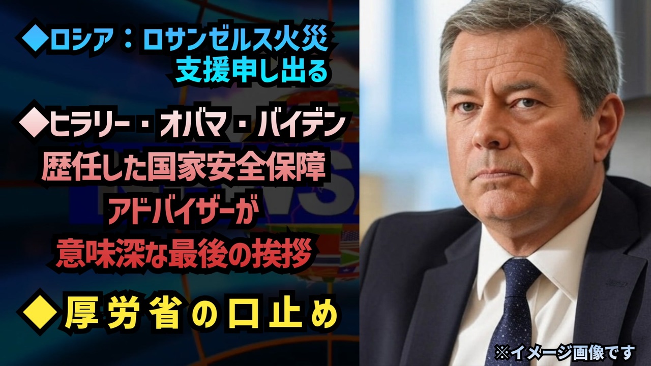 ロシア ロサンゼルス火災支援 申し出る<br>「大統領が決定すれば、我々はアメリカを支援する用意がある」<br><a href="https://x.com/Junika2022/status/1878783765583213026?t=gxhA_mi1SN-oWCP0ZEViWQ&s=19" target="_blank" rel="noopener nofollow">https://x.com/Junika2022/status/1878783765583213026?t=gxhA_mi1SN-oWCP0ZEViWQ&s=19</a><br><br><br>バイデンの国家安全保障アドバイザーでありヒ<br>ラリーとオバマのアドバイザーを長年務めてき<br>たジェイク・サリバンが今日、興味深い発言を<br>した。<br><br>サリバンこの壇上に立つのは、これが最後であ<br>ってほしい。<br>私を呼び戻す唯一のものは数日後に起こる予期<br>せぬ出来事だ。<br><br> <a href="https://t.co/8Erqim509d" target="_blank" rel="noopener nofollow">https://t.co/8Erqim509d</a><br><br><br>鵜川さんのポストから<br><br>こんなもんが厚労省から県や市に通達されていたら、開示してくれないのは当然ですね<br>疲れました<br><a href="https://t.co/ZqIWyzEZ4G" target="_blank" rel="noopener nofollow">https://t.co/ZqIWyzEZ4G</a><br><br><br>予防接種健康被害救済制度<br>新型コロナワクチン<br>ワクチン<br>厚労省<br>口止め<br>バイデン政権<br>トランプ大統領就任前<br>国家安全保障アドバイザー<br>ジェイク・サリバン<br>ロシア<br>ロサンゼルス火災<br><br><br />著作権、肖像権に配慮して作成しております。<br><br>◆気になったニュースの台本!?<br>メモ代わりに作った台本をそのままあげてます<br><a href="https://keiichiro8140.hatenablog.com/." target="_blank" rel="noopener nofollow">https://keiichiro8140.hatenablog.com/.</a><br><br><br>ここからはシリーズ紹介<br><br><br>◆ ワクチン解毒・デトックス<br><a href="https://x.gd/fZweg" target="_blank" rel="noopener nofollow">https://x.gd/fZweg</a><br><br>◆ウイリアム・マキス博士のがん治療(イベルメクチン・フェンベンダゾール等)<br><a href="https://x.gd/AtFYS" target="_blank" rel="noopener nofollow">https://x.gd/AtFYS</a><br><br>◆予防接種健康被害救済制度<br><a href="https://x.gd/0xK9x" target="_blank" rel="noopener nofollow">https://x.gd/0xK9x</a><br><br>◆気になったニュース #1501~<br><br>◆ 【ショートver】気になったニュース<br><a href="https://x.gd/7MxXC" target="_blank" rel="noopener nofollow">https://x.gd/7MxXC</a><br><br>◆ 気になったニュース #1001~<br><a href="https://x.gd/Lp8gv" target="_blank" rel="noopener nofollow">https://x.gd/Lp8gv</a><br><br>◆ 気になったニュース #501~<br><a href="https://x.gd/EmbS4" target="_blank" rel="noopener nofollow">https://x.gd/EmbS4</a><br><br>◆ 気になったニュース #1~#500<br><a href="https://x.gd/uPhNb" target="_blank" rel="noopener nofollow">https://x.gd/uPhNb</a><br><br>◆ X(旧Twitter)・テレグラムで気になった情報<br><a href="https://x.gd/YG6FT" target="_blank" rel="noopener nofollow">https://x.gd/YG6FT</a><br><br>◆ 日比谷5万人パレードデ⚪生放送アーカイブ動画<br><a href="https://x.gd/3CHJv" target="_blank" rel="noopener nofollow">https://x.gd/3CHJv</a><br><br>◆日比谷5万人パレード⚪モのマイリスト作ってみました<br><a href="https://nico.ms/mylist/76828848?ref=sp_other" target="_blank" rel="noopener nofollow">https://nico.ms/mylist/76828848?ref=sp_other</a><br><br>◆3.30 令和の百姓⚪⚪<br><a href="https://www.nicovideo.jp/series/511791?ref=garage_share_other" target="_blank" rel="noopener nofollow">https://www.nicovideo.jp/series/511791?ref=garage_share_other</a><br><br>◆ 及川幸久さんの【XNEWS】シリーズ<br><a href="https://x.gd/3k78K" target="_blank" rel="noopener nofollow">https://x.gd/3k78K</a><br><br>◆これまでの動画<a href="https://x.gd/sPXoJ" target="_blank" rel="noopener nofollow">https://x.gd/sPXoJ</a><br><br>◆もしも(BAN)の時のためのマイリンク集<a href="https://lit.link/K-16_News44" target="_blank" rel="noopener nofollow">https://lit.link/K-16_News44</a><br><br>