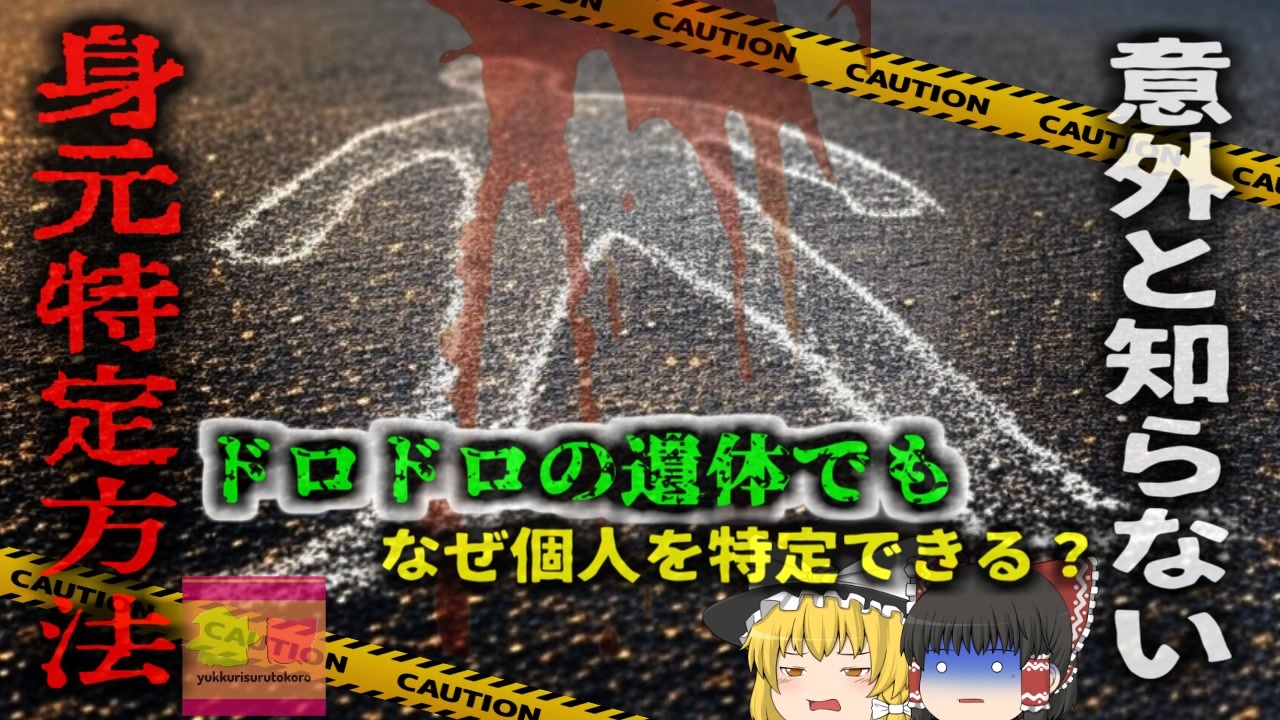 <a href="#" class="seekTime" data-seekTime="00:07" onclick="seekNicoPlayer('#00:07'); return false;">#00:07</a> 行方不明者の数<br><a href="#" class="seekTime" data-seekTime="00:59" onclick="seekNicoPlayer('#00:59'); return false;">#00:59</a> 身元不明者はどうやって特定しているのか<br><a href="#" class="seekTime" data-seekTime="1:33" onclick="seekNicoPlayer('#1:33'); return false;">#1:33</a> DNA鑑定と照合<br><a href="#" class="seekTime" data-seekTime="4:24" onclick="seekNicoPlayer('#4:24'); return false;">#4:24</a> ミトコンドリアDNA<br><a href="#" class="seekTime" data-seekTime="5:59" onclick="seekNicoPlayer('#5:59'); return false;">#5:59</a> 歯科治療カルテ<br><a href="#" class="seekTime" data-seekTime="7:31" onclick="seekNicoPlayer('#7:31'); return false;">#7:31</a> インプラント<br><a href="#" class="seekTime" data-seekTime="8:45" onclick="seekNicoPlayer('#8:45'); return false;">#8:45</a> 錐体骨の採取<br><a href="#" class="seekTime" data-seekTime="9:50" onclick="seekNicoPlayer('#9:50'); return false;">#9:50</a> 特定方法は日々進化している<br><br>引用・出展・参考文献(視聴者提供資料など<br>IMAIOS 錐体骨 CT: 正常解剖学 | e-Anatomy<br><a href="https://ishort.ink/8CYs" target="_blank" rel="noopener nofollow">https://ishort.ink/8CYs</a><br>Wikipedia インプラント<br><a href="https://ishort.ink/o16j" target="_blank" rel="noopener nofollow">https://ishort.ink/o16j</a><br>ジョセフ・ウォーレン<br><a href="https://ishort.ink/AzgV" target="_blank" rel="noopener nofollow">https://ishort.ink/AzgV</a><br>東京都健康長寿医療センター<br>ミトコンドリアと老化・遺伝性疾患<br><a href="https://ishort.ink/9Ldv" target="_blank" rel="noopener nofollow">https://ishort.ink/9Ldv</a><br>IFLSCIENCE<br><a href="https://ishort.ink/vq8U" target="_blank" rel="noopener nofollow">https://ishort.ink/vq8U</a><br><br><br />※この動画は過去の事件を知り、現在でも同じことが発生する危険性を再認識、関与しないように促すための動画であり、視聴者を扇動、動揺を誘うためのコンテンツではありません。<br><br>ご要望にお応えして、メンバーシップの開設を行いました。<br>下記URLからも登録可能ですので、ご興味がある方は是非ご参加ください。<br><a href="https://www.youtube.com/channel/UCcT5a1J7XJW7CLYI2RKl4pw/join" target="_blank" rel="noopener nofollow">https://www.youtube.com/channel/UCcT5a1J7XJW7CLYI2RKl4pw/join</a><br><br><br>Twitter<br>→<a href="https://twitter.com/yukkurisurutoko" target="_blank" rel="noopener nofollow">https://twitter.com/yukkurisurutoko</a><br><br>取り急ぎ、簡易的にですがマイリストを作りました。<br>【ゆっくり解説】事故・事件関係紹介リスト <br><a href="https://www.nicovideo.jp/mylist/71034319" target="_blank" rel="noopener nofollow">https://www.nicovideo.jp/mylist/71034319</a><br>【ゆっくり解説】放射線系事故<br><a href="https://www.nicovideo.jp/mylist/71034368" target="_blank" rel="noopener nofollow">https://www.nicovideo.jp/mylist/71034368</a><br>【ゆっくり解説】鉄道系事故・事件関連<br><a href="https://www.nicovideo.jp/mylist/71034379" target="_blank" rel="noopener nofollow">https://www.nicovideo.jp/mylist/71034379</a>