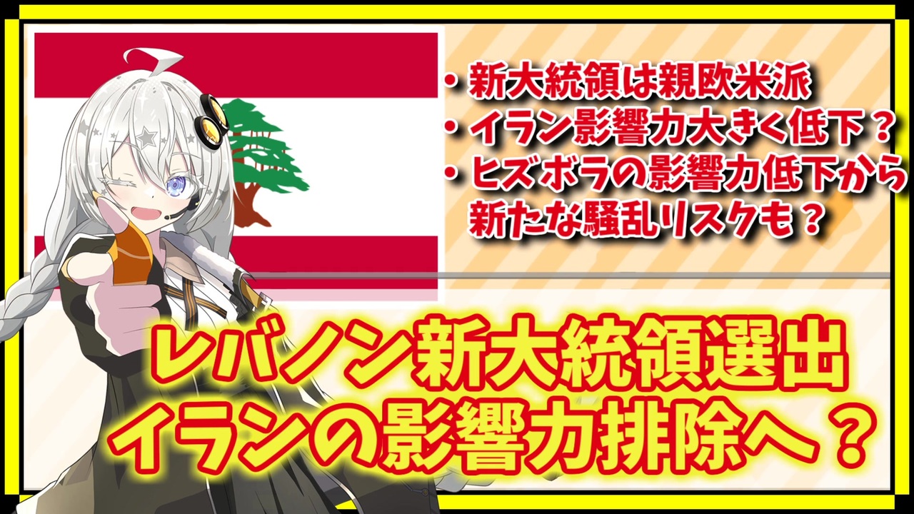 港で大爆発が起きたり、デフォルト発生したり、ヒズボラとイスラエルが衝突して国内空爆されたりと、散々なレバノン。ようやく前向きなニュースが出てきましたね。<br><br>●使用楽曲<br>・日本ファルコム様「下校途中にパンケーキ」<br />※この動画ではA.I.VOICEを使っていますが、普及具合を鑑みてタグにはVOICEROID解説を併記させていただいております。<br><br>世界情勢検索ボット作成中(note):<a href="https://note.com/todo_1582/n/n3b76a6aafd0d" target="_blank" rel="noopener nofollow">https://note.com/todo_1582/n/n3b76a6aafd0d</a><br>ニコニコチャンネル:<a href="https://ch.nicovideo.jp/to-do" target="_blank" rel="noopener nofollow">https://ch.nicovideo.jp/to-do</a><br>現代史解説 <a href="https://www.nicovideo.jp/series/166058" target="_blank" rel="noopener">series/166058</a><br>世界情勢振り返り <a href="https://www.nicovideo.jp/series/352199" target="_blank" rel="noopener">series/352199</a><br>ムスリみの違い解説 <a href="https://www.nicovideo.jp/series/352200" target="_blank" rel="noopener">series/352200</a><br>マイリスト <a href="https://www.nicovideo.jp/mylist/69599837" target="_blank" rel="noopener">mylist/69599837</a><br>Youtube:<a href="https://youtube.com/playlist?list=PL6pjlejdhtK6JxdZZp_3ZqAGmDghvdfu0" target="_blank" rel="noopener nofollow">https://youtube.com/playlist?list=PL6pjlejdhtK6JxdZZp_3ZqAGmDghvdfu0</a>