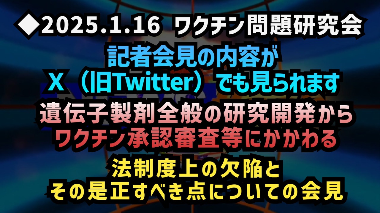 2025.1.16 ワクチン問題研究会<br>質疑応答箇所の雑音を除去したフルバージョンです。<br>「mRNA脂質ナノ粒子製剤をはじめとした遺伝子製剤全般の研究開発からワクチン承認審査等にかかる法制度上の欠陥の是正を求める記者会見」<br>#ワクチン問題研究会 #カルタヘナ法<br><br>こちらから<br>⬇⬇⬇<br><a href="https://x.com/officialAntiWHO/status/1880049174466687404?t=33tvfLARrqGR7FLdR1034w&s=19" target="_blank" rel="noopener nofollow">https://x.com/officialAntiWHO/status/1880049174466687404?t=33tvfLARrqGR7FLdR1034w&s=19</a><br><br><br>藤江さんもニコ動とYouTubeで投稿されてます<br>⬇⬇⬇<br><a href="https://www.nicovideo.jp/watch/sm44546327" class="watch">sm44546327</a><br><br><br>一般社団法人ワクチン問題研究会<br>本日1月16日14時より厚生労働省記者会見室にて、遺伝子製剤全般の研究開発からワクチン承認審査等にかかわる法制度上の欠陥とその是正すべき点についての会見を開催します。<br>1つの重要なターニングポイントとなる1日になると思います。<br><a href="https://x.com/vmed_Japan/status/1879665063419859267?t=qdGSXKXNuTSSvSrXLRwfoA&s=19" target="_blank" rel="noopener nofollow">https://x.com/vmed_Japan/status/1879665063419859267?t=qdGSXKXNuTSSvSrXLRwfoA&s=19</a><br><br><br>新型コロナウイルス<br>コロナワクチン<br>mRNAワクチン<br>脂質ナノ粒子<br>ワクチン<br>ワクチン問題研究会<br>遺伝子製剤<br>厚生労働省<br>誓いの碑<br>ワクチン被害<br>ワクチン薬害<br><br />著作権、肖像権に配慮して作成しております。<br><br>◆気になったニュースの台本!?<br>メモ代わりに作った台本をそのままあげてます<br><a href="https://keiichiro8140.hatenablog.com/." target="_blank" rel="noopener nofollow">https://keiichiro8140.hatenablog.com/.</a><br><br><br>ここからはシリーズ紹介<br><br><br>◆ ワクチン解毒・デトックス<br><a href="https://x.gd/fZweg" target="_blank" rel="noopener nofollow">https://x.gd/fZweg</a><br><br>◆ウイリアム・マキス博士のがん治療(イベルメクチン・フェンベンダゾール等)<br><a href="https://x.gd/AtFYS" target="_blank" rel="noopener nofollow">https://x.gd/AtFYS</a><br><br>◆予防接種健康被害救済制度<br><a href="https://x.gd/0xK9x" target="_blank" rel="noopener nofollow">https://x.gd/0xK9x</a><br><br>◆気になったニュース #1501~<br><br>◆ 【ショートver】気になったニュース<br><a href="https://x.gd/7MxXC" target="_blank" rel="noopener nofollow">https://x.gd/7MxXC</a><br><br>◆ 気になったニュース #1001~<br><a href="https://x.gd/Lp8gv" target="_blank" rel="noopener nofollow">https://x.gd/Lp8gv</a><br><br>◆ 気になったニュース #501~<br><a href="https://x.gd/EmbS4" target="_blank" rel="noopener nofollow">https://x.gd/EmbS4</a><br><br>◆ 気になったニュース #1~#500<br><a href="https://x.gd/uPhNb" target="_blank" rel="noopener nofollow">https://x.gd/uPhNb</a><br><br>◆ X(旧Twitter)・テレグラムで気になった情報<br><a href="https://x.gd/YG6FT" target="_blank" rel="noopener nofollow">https://x.gd/YG6FT</a><br><br>◆ 日比谷5万人パレードデ⚪生放送アーカイブ動画<br><a href="https://x.gd/3CHJv" target="_blank" rel="noopener nofollow">https://x.gd/3CHJv</a><br><br>◆日比谷5万人パレード⚪モのマイリスト作ってみました<br><a href="https://nico.ms/mylist/76828848?ref=sp_other" target="_blank" rel="noopener nofollow">https://nico.ms/mylist/76828848?ref=sp_other</a><br><br>◆3.30 令和の百姓⚪⚪<br><a href="https://www.nicovideo.jp/series/511791?ref=garage_share_other" target="_blank" rel="noopener nofollow">https://www.nicovideo.jp/series/511791?ref=garage_share_other</a><br><br>◆ 及川幸久さんの【XNEWS】シリーズ<br><a href="https://x.gd/3k78K" target="_blank" rel="noopener nofollow">https://x.gd/3k78K</a><br><br>◆これまでの動画<a href="https://x.gd/sPXoJ" target="_blank" rel="noopener nofollow">https://x.gd/sPXoJ</a><br><br>◆もしも(BAN)の時のためのマイリンク集<a href="https://lit.link/K-16_News44" target="_blank" rel="noopener nofollow">https://lit.link/K-16_News44</a><br><br>