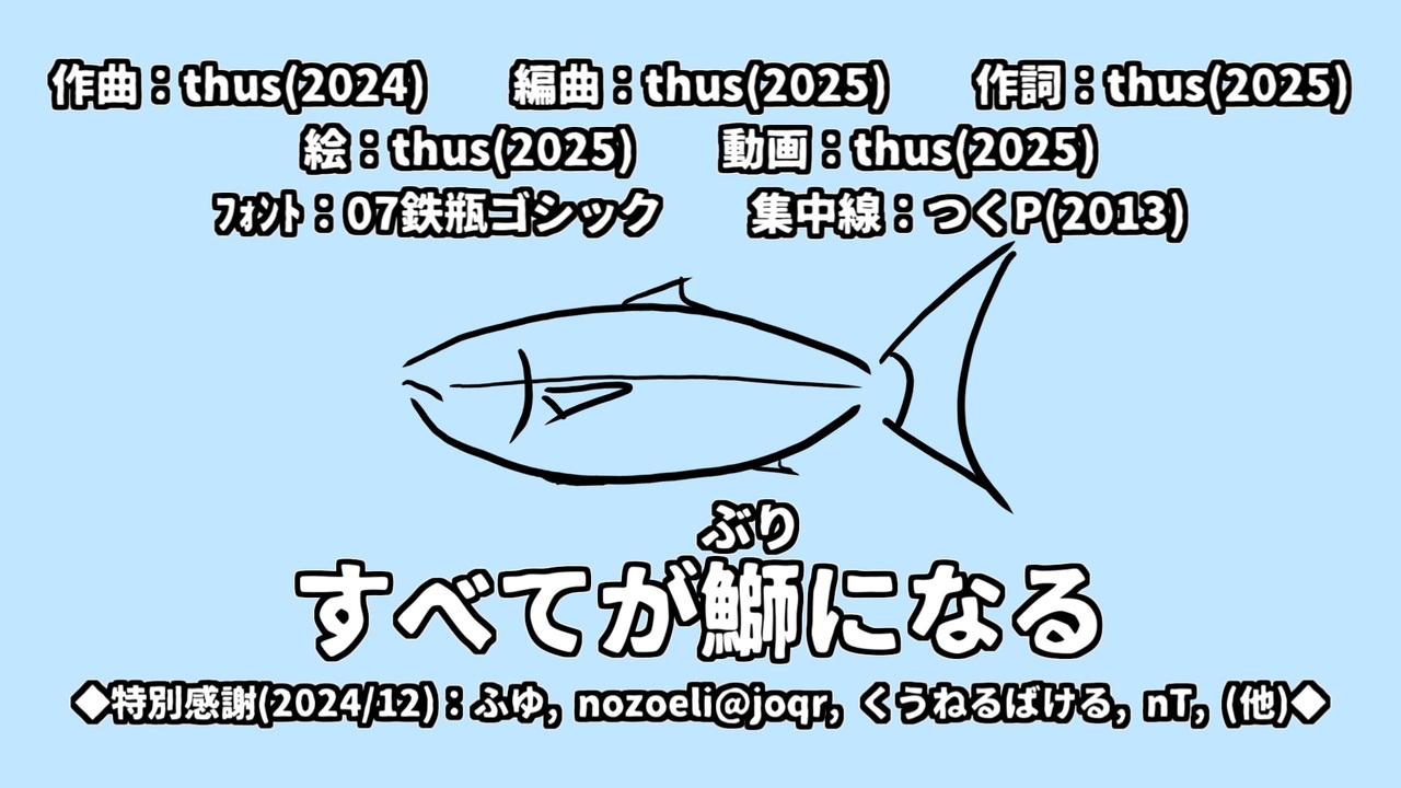 ◆「ぶり投稿祭」出展作品です(詳細:<a href="https://www.nicovideo.jp/watch/sm44386564" class="watch">sm44386564</a> )<br>・開催日:2025/01/24-26<br>・主催:strega(<a href="https://www.nicovideo.jp/user/57746979" target="_blank" rel="noopener">user/57746979</a> )<br>―<br><br> そうさ、全てが鰤になる。thusです。カラオケ動画:<a href="https://www.nicovideo.jp/watch/sm44552319" class="watch">sm44552319</a><br><br> ~ The Perfect Yellowtail ~<br><br> 動画としては、今回が初めてのテトさん。楽曲としても、「ウォーク」は私の中では0曲目という心持ちなので、記念すべきテトさん第1曲目…がなんと恁曲です。想像の箱庭、歌詞を渡された時テトさんはきっとギョっとしたことでしょう。魚だけに。\ツクテーン/<br> 諸事情で私は初音さんを打っ壊し、テトさんを新たな音楽パートナーとすることにしました。新しくタグの設定をするのが面倒でした。でも最初さえ張と済ませて了えば、あとは大丈夫ですから、大丈夫ですね。<br> 打っ壊した詳細は、2025/01/22リリースのアルバム『thus's music 121-140: 確執熏ぶる編纂室』(<a href="https://link-map.jp/links/co0d8529" target="_blank" rel="noopener nofollow">https://link-map.jp/links/co0d8529</a> )をご聴きください。<br><br>~ 一方その頃 序 ~<br>「父さん…何故呼んだの?」<br>『お前の考えている通りだ』<br>「じゃあ、僕は鰤になって、宇宙全体を鰤にしろていうの?」<br>『そうだ』<br>「嫌だよッそんなのッ!」<br>『鰤になれシンジ、でなければ帰れ』<br>/~<br><br> 何かないかなと投稿祭を探せば、ぶり投稿祭だなんて、まあ何と面白そうな投稿祭があるじゃないですか! 料理界隈の皆さんを主眼に置いたものなのは承知しておりますが、だからこそ私たちソフトウェアシンガー界隈には迚も新鮮なのです。オールジャンルということだったので、手を出しました。恁曲で大丈夫かなと心配にはなりますが、大丈夫だと思うので、大丈夫だと信じたいです。<br><br>~ 一方その頃 破 ~<br>【体の鰤化が始まり、抵抗を試みる少年】<br>「クッソっ…止まれよ…! 急にこんなことなって、訳分かんな…。 !…止めろぉ! うわあああああああああああああ!」<br>/~ 参考:<a href="https://youtu.be/fekeKBlponA" target="_blank" rel="noopener nofollow">https://youtu.be/fekeKBlponA</a><br><br> 鰤といえば、「冬はブリを食べろ!」というMuufeさんの御進言を思い出します(<a href="https://www.nicovideo.jp/watch/sm39670358" class="watch">sm39670358</a> )。因みに私は今冬未だ鰤を食べておりません。<br> …止めろぉ! うわあああああああああああああ! ←急(Q)<br><br>2025/01/27 04:54:2,525再生<br>2025/01/31 15:36:1万再生<br /><br><br><br>====================<br>| 2026/01/04 21:00「インスペクタの自死未遂」:<a href="https://www.nicovideo.jp/watch/sm45800854" class="watch">sm45800854</a><br>| 投稿曲マイリスト:<a href="https://www.nicovideo.jp/mylist/57867175" target="_blank" rel="noopener">mylist/57867175</a><br>|――――――――――――――――――<br>| pixivFANBOX:<a href="https://thus.fanbox.cc/" target="_blank" rel="noopener nofollow">https://thus.fanbox.cc/</a><br>| アルバム等配信中:<a href="https://thus-library.blogspot.com/search/label/discography" target="_blank" rel="noopener nofollow">https://thus-library.blogspot.com/search/label/discography</a><br>| つなぐ(依頼・リクエスト):<a href="https://tsunagu.cloud/users/thus" target="_blank" rel="noopener nofollow">https://tsunagu.cloud/users/thus</a><br>|――――――――――――――――――<br>| YouTube:<a href="https://youtube.com/@thus" target="_blank" rel="noopener nofollow">https://youtube.com/@thus</a><br>| X:<a href="https://x.com/thus_submission" target="_blank" rel="noopener nofollow">https://x.com/thus_submission</a><br>| 他全リンク:<a href="https://lit.link/thus" target="_blank" rel="noopener nofollow">https://lit.link/thus</a><br>|――――――――――――――――――<br>| オフボーカル等:<a href="https://piapro.jp/thus_999discommunication" target="_blank" rel="noopener nofollow">https://piapro.jp/thus_999discommunication</a><br>| 楽曲/動画の二次利用に関して:<a href="https://bit.ly/3JRQQiZ" target="_blank" rel="noopener nofollow">https://bit.ly/3JRQQiZ</a><br><span style="color: #262626;">| </span><span style="color: #262626;"><strong>歌詞図書館(ふりがな有るよ!):</strong></span><a href="https://thus-library.blogspot.com/" target="_blank" rel="noopener nofollow">https://thus-library.blogspot.com/</a><br>====================