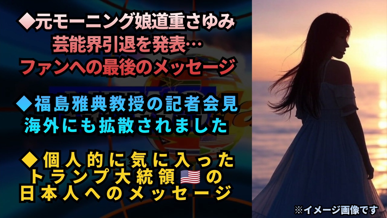 【発表】元モーニング娘。道重さゆみ、芸能界引退<br><a href="https://news.livedoor.com/lite/article_detail/27974556/" target="_blank" rel="noopener nofollow">https://news.livedoor.com/lite/article_detail/27974556/</a><br><br>2003年、モー娘に6期生として加入。2012年から8代目リーダーを務め、2014年に卒業。休業を経て2017年からソロ活動を再開したが、2023年に医師から「強迫性障害」と診断を受け、一部の活動を制限することが発表されていた。<br><a href="https://x.com/livedoornews/status/1880890831105921437?t=FGP44rusQIHfae0JcLxlnA&s=19" target="_blank" rel="noopener nofollow">https://x.com/livedoornews/status/1880890831105921437?t=FGP44rusQIHfae0JcLxlnA&s=19</a><br><br><br>道重さゆみ、芸能界引退を発表<br><br>全文はこちら<br>mdpr.jp/news/4477278<br><br>「皆さんに会えなくなるのは寂しい、皆さんに寂しい思いをさせてしまう、それは休業を経験した私が1番分かっているはずなのに、この選択になってしまったこと、ごめんなさい」<br><br>#道重さゆみ #さゆみん<br><a href="https://x.com/modelpress/status/1880889682332209593?t=J5lIq07DBmt3U0gD9dOA_Q&s=19" target="_blank" rel="noopener nofollow">https://x.com/modelpress/status/1880889682332209593?t=J5lIq07DBmt3U0gD9dOA_Q&s=19</a><br><br><br>日本の記者会見より 実際のデータで「ワクチン接種者の方が感染リスクが高い」ことが判明<br>「私たちは約1,000人のデータを収集し、ワクチン接種者約500人と未接種者約500人に分けました。<br>その上で、慎重にデータを精査し、ワクチン接種者と未接種者を比較した結果、ワクチン接種者の方が感染する確率が高いことがわかりました<br><a href="https://t.co/kBcvetchzp" target="_blank" rel="noopener nofollow">https://t.co/kBcvetchzp</a><br><br><br>極左に支配された自民党が日本人に(Xのユーザー)に敵意をむき出しにしている。NHKを始め日本のフェイクメディアも同じ。後数日でアメリカの大統領に就任しますがイスラエルとハマスの戦いを止めさせた。世界で最も戦争をしていないのがトランプ大統領だ。 <br><br>真面目で、勤勉で、盗みをせず、思いやりと優しさがあり、欲深くなく、礼儀もあり、そんな日本人が幸せになれないのが不憫でならない。<br>トランプ大統領<br><br><a href="https://t.co/BMbEbPjEGT" target="_blank" rel="noopener nofollow">https://t.co/BMbEbPjEGT</a><br><br><br>ワクチン<br>コロナワクチン<br>感染リスク<br>統計データ<br>福島雅典教授<br>情報開示<br>未接種者との比較 <br>接種回数と感染率<br>トランプ大統領<br>道重さゆみ<br>芸能界引退<br><br><br><br />著作権、肖像権に配慮して作成しております。<br><br>◆気になったニュースの台本!?<br>メモ代わりに作った台本をそのままあげてます<br><a href="https://keiichiro8140.hatenablog.com/." target="_blank" rel="noopener nofollow">https://keiichiro8140.hatenablog.com/.</a><br><br><br>ここからはシリーズ紹介<br><br><br>◆ ワクチン解毒・デトックス<br><a href="https://x.gd/fZweg" target="_blank" rel="noopener nofollow">https://x.gd/fZweg</a><br><br>◆ウイリアム・マキス博士のがん治療(イベルメクチン・フェンベンダゾール等)<br><a href="https://x.gd/AtFYS" target="_blank" rel="noopener nofollow">https://x.gd/AtFYS</a><br><br>◆予防接種健康被害救済制度<br><a href="https://x.gd/0xK9x" target="_blank" rel="noopener nofollow">https://x.gd/0xK9x</a><br><br>◆気になったニュース #1501~<br><br>◆ 【ショートver】気になったニュース<br><a href="https://x.gd/7MxXC" target="_blank" rel="noopener nofollow">https://x.gd/7MxXC</a><br><br>◆ 気になったニュース #1001~<br><a href="https://x.gd/Lp8gv" target="_blank" rel="noopener nofollow">https://x.gd/Lp8gv</a><br><br>◆ 気になったニュース #501~<br><a href="https://x.gd/EmbS4" target="_blank" rel="noopener nofollow">https://x.gd/EmbS4</a><br><br>◆ 気になったニュース #1~#500<br><a href="https://x.gd/uPhNb" target="_blank" rel="noopener nofollow">https://x.gd/uPhNb</a><br><br>◆ X(旧Twitter)・テレグラムで気になった情報<br><a href="https://x.gd/YG6FT" target="_blank" rel="noopener nofollow">https://x.gd/YG6FT</a><br><br>◆ 日比谷5万人パレードデ⚪生放送アーカイブ動画<br><a href="https://x.gd/3CHJv" target="_blank" rel="noopener nofollow">https://x.gd/3CHJv</a><br><br>◆日比谷5万人パレード⚪モのマイリスト作ってみました<br><a href="https://nico.ms/mylist/76828848?ref=sp_other" target="_blank" rel="noopener nofollow">https://nico.ms/mylist/76828848?ref=sp_other</a><br><br>◆3.30 令和の百姓⚪⚪<br><a href="https://www.nicovideo.jp/series/511791?ref=garage_share_other" target="_blank" rel="noopener nofollow">https://www.nicovideo.jp/series/511791?ref=garage_share_other</a><br><br>◆ 及川幸久さんの【XNEWS】シリーズ<br><a href="https://x.gd/3k78K" target="_blank" rel="noopener nofollow">https://x.gd/3k78K</a><br><br>◆これまでの動画<a href="https://x.gd/sPXoJ" target="_blank" rel="noopener nofollow">https://x.gd/sPXoJ</a><br><br>◆もしも(BAN)の時のためのマイリンク集<a href="https://lit.link/K-16_News44" target="_blank" rel="noopener nofollow">https://lit.link/K-16_News44</a><br><br>