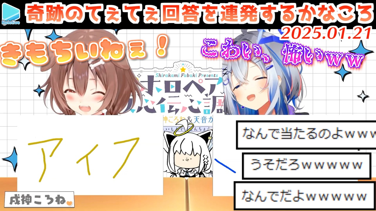 怖いまである<br><br><a href="#" class="seekTime" data-seekTime="00:00" onclick="seekNicoPlayer('#00:00'); return false;">#00:00</a> 1問目<br><a href="#" class="seekTime" data-seekTime="01:43" onclick="seekNicoPlayer('#01:43'); return false;">#01:43</a> 2問目<br><a href="#" class="seekTime" data-seekTime="03:23" onclick="seekNicoPlayer('#03:23'); return false;">#03:23</a> 5問目<br><a href="#" class="seekTime" data-seekTime="05:00" onclick="seekNicoPlayer('#05:00'); return false;">#05:00</a> 7問目<br><a href="#" class="seekTime" data-seekTime="06:14" onclick="seekNicoPlayer('#06:14'); return false;">#06:14</a> 10問目<br><a href="#" class="seekTime" data-seekTime="07:23" onclick="seekNicoPlayer('#07:23'); return false;">#07:23</a> 11問目<br><a href="#" class="seekTime" data-seekTime="08:43" onclick="seekNicoPlayer('#08:43'); return false;">#08:43</a> 14問目<br><a href="#" class="seekTime" data-seekTime="10:26" onclick="seekNicoPlayer('#10:26'); return false;">#10:26</a> 19問目<br><a href="#" class="seekTime" data-seekTime="11:47" onclick="seekNicoPlayer('#11:47'); return false;">#11:47</a> 20問目<br><br>元動画様はこちら<br>【#ホロペア】ホロペア以心伝心調査 検証:天音かなた&戌神ころね【ホロライブ/白上フブキ】<br><a href="https://youtu.be/UpRArMBDrTc" target="_blank" rel="noopener nofollow">https://youtu.be/UpRArMBDrTc</a><br><br>【 マリパ 】頂上決戦👑マリオパーティージャンボリーだああああああああああ‼ 【かなフブみっころね】<br><a href="https://youtu.be/A4KPgbQ3TuQ" target="_blank" rel="noopener nofollow">https://youtu.be/A4KPgbQ3TuQ</a><br><br>フブキCh。白上フブキ <a href="https://t.co/R9TNhC7sPO" target="_blank" rel="noopener nofollow">https://t.co/R9TNhC7sPO</a><br>Korone Ch. 戌神ころね <a href="https://t.co/qeTXwRU2F1" target="_blank" rel="noopener nofollow">https://t.co/qeTXwRU2F1</a><br>Kanata Ch. 天音かなた <a href="https://t.co/rVcDJmho1o" target="_blank" rel="noopener nofollow">https://t.co/rVcDJmho1o</a><br /><span style="color: #b7b7b7; font-size: 10px;">ホロライブ切り抜き/なめたけ <a href="https://t.co/CBwJLnYR2c" target="_blank" rel="noopener nofollow">https://t.co/CBwJLnYR2c</a></span>