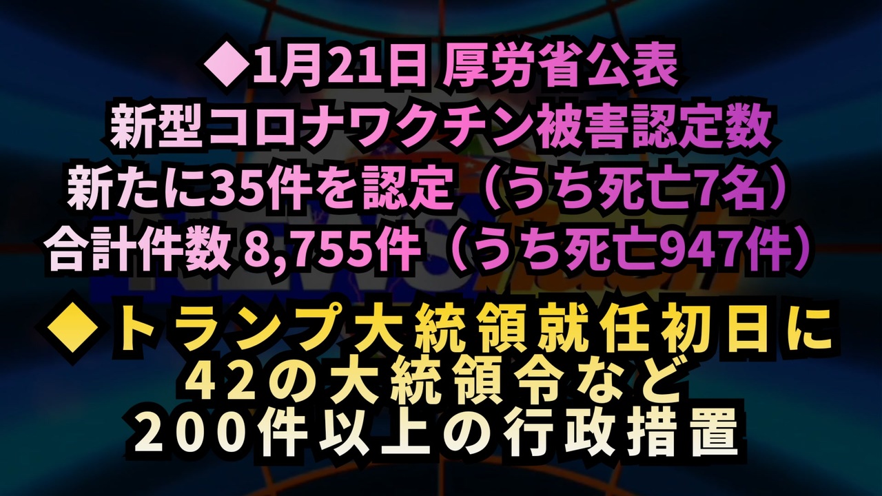 厚生労働省公表、新型コロナワクチン健康被害救済制度で新たに35件を認定(うち死亡7名)<br><a href="https://t.co/qsyVvK60A4" target="_blank" rel="noopener nofollow">https://t.co/qsyVvK60A4</a><br><br>疾病障害認定審査会、2025年1月20日発表で死亡認定は949件に増加。不認定の割合が上回る<br><a href="https://x.com/sousyou13/status/1881679290208747646?t=Dyi75jsnpviHXf03ZcTDKg&s=19" target="_blank" rel="noopener nofollow">https://x.com/sousyou13/status/1881679290208747646?t=Dyi75jsnpviHXf03ZcTDKg&s=19</a><br><br>速報: インド政府、米国に不法滞在する約18,000人のインド国籍者を特定・送還に向けトランプ政権と協力<br><a href="https://x.com/TheInsiderPaper/status/1881662936495845481?t=1I8d5sUBQrq-ssNKsigGEQ&s=19" target="_blank" rel="noopener nofollow">https://x.com/TheInsiderPaper/status/1881662936495845481?t=1I8d5sUBQrq-ssNKsigGEQ&s=19</a><br><br>中国、米国の脱退後も世界保健機関(WHO)への支援を誓う<br><a href="https://x.com/TheInsiderPaper/status/1881665545776582864?t=cdNaV3EglQk_hNJR91Xfkg&s=19" target="_blank" rel="noopener nofollow">https://x.com/TheInsiderPaper/status/1881665545776582864?t=cdNaV3EglQk_hNJR91Xfkg&s=19</a><br><br>プーチン大統領、トランプ氏の就任を祝福し関係改善に期待<br><a href="https://x.com/RealAlexJones/status/1881458965244236280?t=w3Ul0aQi7SGEguwcB1BTUw&s=19" target="_blank" rel="noopener nofollow">https://x.com/RealAlexJones/status/1881458965244236280?t=w3Ul0aQi7SGEguwcB1BTUw&s=19</a><br><br>トランプ大統領、就任初日に歴史的行動。42の大統領令など200件以上の行政措置<br><a href="https://x.com/cb_doge/status/1881538175237234924?t=zHOijKctzGAdaztPF3GuuQ&s=19" target="_blank" rel="noopener nofollow">https://x.com/cb_doge/status/1881538175237234924?t=zHOijKctzGAdaztPF3GuuQ&s=19</a><br><br>トランプ氏、前政権任命の1000人超を解任。「無駄を削減する時だ!」<br><a href="https://x.com/Tamama0306/status/1881668974028771507?t=VafTGTZNkn5bXAoWPYpWoA&s=19" target="_blank" rel="noopener nofollow">https://x.com/Tamama0306/status/1881668974028771507?t=VafTGTZNkn5bXAoWPYpWoA&s=19</a><br><br>新型コロナワクチン 予防接種健康被害救済制度 死亡認定 ワクチン 移民問題 WHO トランプ大統領 ロシア ウクライナ 第3次世界大戦<br><br><br />著作権、肖像権に配慮して作成しております。<br><br>◆気になったニュースの台本!?<br>メモ代わりに作った台本をそのままあげてます<br><a href="https://keiichiro8140.hatenablog.com/." target="_blank" rel="noopener nofollow">https://keiichiro8140.hatenablog.com/.</a><br><br><br>ここからはシリーズ紹介<br><br><br>◆ ワクチン解毒・デトックス<br><a href="https://x.gd/fZweg" target="_blank" rel="noopener nofollow">https://x.gd/fZweg</a><br><br>◆ウイリアム・マキス博士のがん治療(イベルメクチン・フェンベンダゾール等)<br><a href="https://x.gd/AtFYS" target="_blank" rel="noopener nofollow">https://x.gd/AtFYS</a><br><br>◆予防接種健康被害救済制度<br><a href="https://x.gd/0xK9x" target="_blank" rel="noopener nofollow">https://x.gd/0xK9x</a><br><br>◆気になったニュース #1501~<br><br>◆ 【ショートver】気になったニュース<br><a href="https://x.gd/7MxXC" target="_blank" rel="noopener nofollow">https://x.gd/7MxXC</a><br><br>◆ 気になったニュース #1001~<br><a href="https://x.gd/Lp8gv" target="_blank" rel="noopener nofollow">https://x.gd/Lp8gv</a><br><br>◆ 気になったニュース #501~<br><a href="https://x.gd/EmbS4" target="_blank" rel="noopener nofollow">https://x.gd/EmbS4</a><br><br>◆ 気になったニュース #1~#500<br><a href="https://x.gd/uPhNb" target="_blank" rel="noopener nofollow">https://x.gd/uPhNb</a><br><br>◆ X(旧Twitter)・テレグラムで気になった情報<br><a href="https://x.gd/YG6FT" target="_blank" rel="noopener nofollow">https://x.gd/YG6FT</a><br><br>◆ 日比谷5万人パレードデ⚪生放送アーカイブ動画<br><a href="https://x.gd/3CHJv" target="_blank" rel="noopener nofollow">https://x.gd/3CHJv</a><br><br>◆日比谷5万人パレード⚪モのマイリスト作ってみました<br><a href="https://nico.ms/mylist/76828848?ref=sp_other" target="_blank" rel="noopener nofollow">https://nico.ms/mylist/76828848?ref=sp_other</a><br><br>◆3.30 令和の百姓⚪⚪<br><a href="https://www.nicovideo.jp/series/511791?ref=garage_share_other" target="_blank" rel="noopener nofollow">https://www.nicovideo.jp/series/511791?ref=garage_share_other</a><br><br>◆ 及川幸久さんの【XNEWS】シリーズ<br><a href="https://x.gd/3k78K" target="_blank" rel="noopener nofollow">https://x.gd/3k78K</a><br><br>◆これまでの動画<a href="https://x.gd/sPXoJ" target="_blank" rel="noopener nofollow">https://x.gd/sPXoJ</a><br><br>◆もしも(BAN)の時のためのマイリンク集<a href="https://lit.link/K-16_News44" target="_blank" rel="noopener nofollow">https://lit.link/K-16_News44</a><br><br>