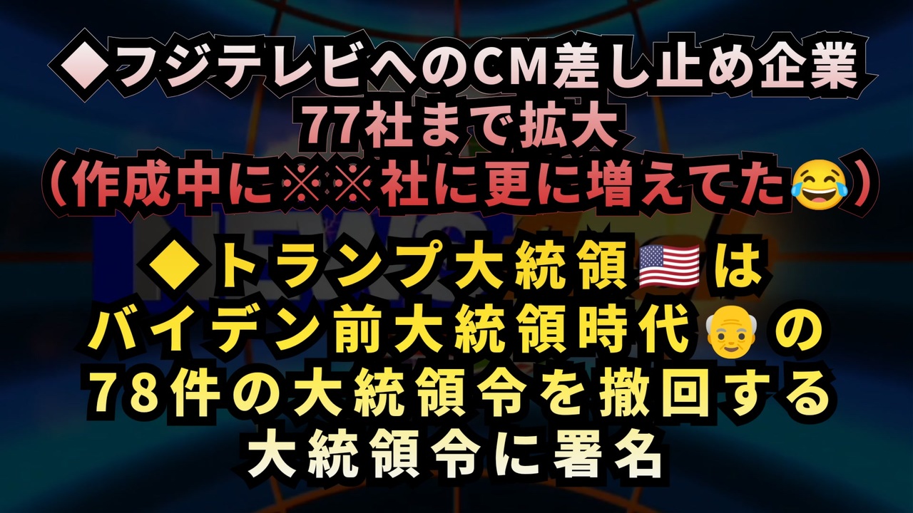 フジテレビCM問題拡大!スポンサー差し止め77社に増加 <a href="https://x.com/sate_tv/status/1881844196447051850?t=ZxheN8dpgui3ilUQ71WoMg&s=19" target="_blank" rel="noopener nofollow">https://x.com/sate_tv/status/1881844196447051850?t=ZxheN8dpgui3ilUQ71WoMg&s=19</a><br><br><br>「甘やかされた公務員に出勤義務」トランプ新大統領令の影響とは <a href="https://x.com/RealAlexJones/status/1881785158438949201?t=0mFE1R8UUs5m93fwOVi2oQ&s=19" target="_blank" rel="noopener nofollow">https://x.com/RealAlexJones/status/1881785158438949201?t=0mFE1R8UUs5m93fwOVi2oQ&s=19</a><br><br><br>トランプ大統領、バイデン政権の78件の政策を撤回!AI・EV・DEIの見直しへ <a href="https://t.co/PGp0foe9k8" target="_blank" rel="noopener nofollow">https://t.co/PGp0foe9k8</a><br><br><br>フジテレビスポンサー撤退続々…差し替え企業82社に拡大 <a href="https://x.com/sate_tv/status/1881924174383624441?t=VNZHTTHCjCvLzS1XNq_z1g&s=19" target="_blank" rel="noopener nofollow">https://x.com/sate_tv/status/1881924174383624441?t=VNZHTTHCjCvLzS1XNq_z1g&s=19</a><br><br><br>古舘伊知郎が「中居正広問題」に言及「ごまかせる時代じゃない」 <a href="https://x.com/JmaxTopics/status/1881910410145857567?t=Uv6DjeNA4kAIjWoNRVEODQ&s=19" target="_blank" rel="noopener nofollow">https://x.com/JmaxTopics/status/1881910410145857567?t=Uv6DjeNA4kAIjWoNRVEODQ&s=19</a><br><br><br>シェディングの可能性?ワクチン容器破損で75%が眼症状発症の報告 <a href="https://www.instagram.com/reel/DFG5cdNBAIy/?igsh=MWE0MTF0cjFqbGkxbw==" target="_blank" rel="noopener nofollow">https://www.instagram.com/reel/DFG5cdNBAIy/?igsh=MWE0MTF0cjFqbGkxbw==</a><br><br><br>フジテレビ<br>CM問題 <br>企業スポンサー <br>トランプ大統領<br>バイデン大統領令撤回 <br>AI規制撤廃 <br>EV政策変更 <br>DEIプログラム廃止 <br>中居正広<br>シェディング <br>ワクチン<br><br />著作権、肖像権に配慮して作成しております。<br><br>◆気になったニュースの台本!?<br>メモ代わりに作った台本をそのままあげてます<br><a href="https://keiichiro8140.hatenablog.com/." target="_blank" rel="noopener nofollow">https://keiichiro8140.hatenablog.com/.</a><br><br><br>ここからはシリーズ紹介<br><br><br>◆ ワクチン解毒・デトックス<br><a href="https://x.gd/fZweg" target="_blank" rel="noopener nofollow">https://x.gd/fZweg</a><br><br>◆ウイリアム・マキス博士のがん治療(イベルメクチン・フェンベンダゾール等)<br><a href="https://x.gd/AtFYS" target="_blank" rel="noopener nofollow">https://x.gd/AtFYS</a><br><br>◆予防接種健康被害救済制度<br><a href="https://x.gd/0xK9x" target="_blank" rel="noopener nofollow">https://x.gd/0xK9x</a><br><br>◆気になったニュース #1501~<br><br>◆ 【ショートver】気になったニュース<br><a href="https://x.gd/7MxXC" target="_blank" rel="noopener nofollow">https://x.gd/7MxXC</a><br><br>◆ 気になったニュース #1001~<br><a href="https://x.gd/Lp8gv" target="_blank" rel="noopener nofollow">https://x.gd/Lp8gv</a><br><br>◆ 気になったニュース #501~<br><a href="https://x.gd/EmbS4" target="_blank" rel="noopener nofollow">https://x.gd/EmbS4</a><br><br>◆ 気になったニュース #1~#500<br><a href="https://x.gd/uPhNb" target="_blank" rel="noopener nofollow">https://x.gd/uPhNb</a><br><br>◆ X(旧Twitter)・テレグラムで気になった情報<br><a href="https://x.gd/YG6FT" target="_blank" rel="noopener nofollow">https://x.gd/YG6FT</a><br><br>◆ 日比谷5万人パレードデ⚪生放送アーカイブ動画<br><a href="https://x.gd/3CHJv" target="_blank" rel="noopener nofollow">https://x.gd/3CHJv</a><br><br>◆日比谷5万人パレード⚪モのマイリスト作ってみました<br><a href="https://nico.ms/mylist/76828848?ref=sp_other" target="_blank" rel="noopener nofollow">https://nico.ms/mylist/76828848?ref=sp_other</a><br><br>◆3.30 令和の百姓⚪⚪<br><a href="https://www.nicovideo.jp/series/511791?ref=garage_share_other" target="_blank" rel="noopener nofollow">https://www.nicovideo.jp/series/511791?ref=garage_share_other</a><br><br>◆ 及川幸久さんの【XNEWS】シリーズ<br><a href="https://x.gd/3k78K" target="_blank" rel="noopener nofollow">https://x.gd/3k78K</a><br><br>◆これまでの動画<a href="https://x.gd/sPXoJ" target="_blank" rel="noopener nofollow">https://x.gd/sPXoJ</a><br><br>◆もしも(BAN)の時のためのマイリンク集<a href="https://lit.link/K-16_News44" target="_blank" rel="noopener nofollow">https://lit.link/K-16_News44</a><br><br>