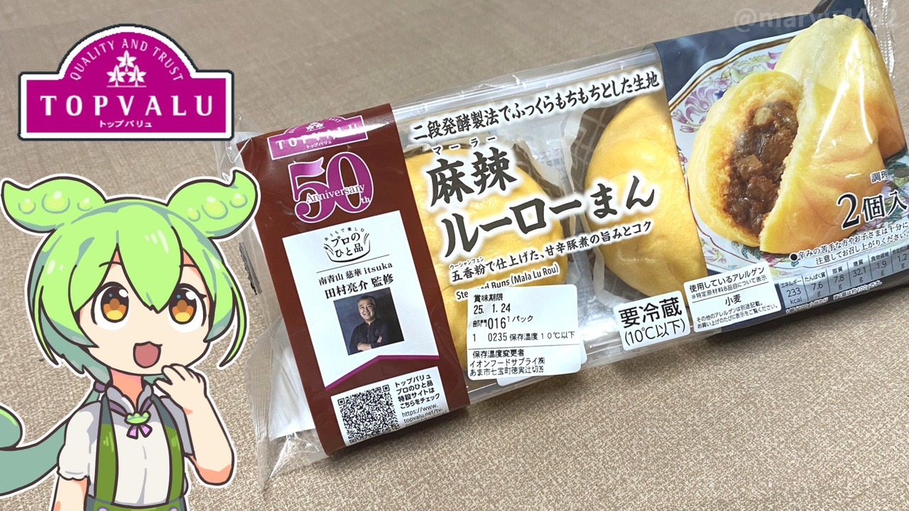 冷蔵の中華まんコーナーに新しい商品があったので購入してみました。 <br>オレンジ色です。 <br><br><br><br>【関連動画】 <br>トップバリュの赤いヤツ「プロのひと品 牛バラ煮込みバジリコソース付き」2024.02.13<br><a href="https://www.nicovideo.jp/watch/sm43371376" target="_blank" rel="noopener nofollow">https://www.nicovideo.jp/watch/sm43371376</a><br><br>【参考】 <br>プロのひと品 田村シェフ監修 麻辣ルーローまん(トップバリュ) <br><a href="https://www.topvalu.net/items/detail/4549414660135/" target="_blank" rel="noopener nofollow">https://www.topvalu.net/items/detail/4549414660135/</a> <br>ふんわり肉まん・ピザまん(トップバリュ) <br><a href="https://www.topvalu.net/items/detail/4549414656848/" target="_blank" rel="noopener nofollow">https://www.topvalu.net/items/detail/4549414656848/</a> <br>台湾ルーローまん(セブンイレブン)<br> <a href="https://www.sej.co.jp/products/a/item/150437/" target="_blank" rel="noopener nofollow">https://www.sej.co.jp/products/a/item/150437/</a> <br>台湾料理「魯肉飯(ルーローハン)」とは?レシピもご紹介(デリッシュキッチン) <br><a href="https://delishkitchen.tv/articles/2143" target="_blank" rel="noopener nofollow">https://delishkitchen.tv/articles/2143</a> <br>魯肉飯(ルーローハン)(エスビー食品) <br><a href="https://www.sbfoods.co.jp/recipe/detail/07887.html" target="_blank" rel="noopener nofollow">https://www.sbfoods.co.jp/recipe/detail/07887.html</a><br><br>【使用した素材】(※敬称略) <br>(合成音声)VOICEVOX/ずんだもん/四国めたん<br> <a href="https://voicevox.hiroshiba.jp/" target="_blank" rel="noopener nofollow">https://voicevox.hiroshiba.jp/</a> <br>(立ち絵)坂本アヒル<br> <a href="https://seiga.nicovideo.jp/seiga/im10788496?track" target="_blank" rel="noopener nofollow">https://seiga.nicovideo.jp/seiga/im10788496?track</a> <br>(楽曲)甘茶の音楽工房/「楽しい麦畑」「フルーツパフェ」「お城の舞踏会」 <br><a href="https://amachamusic.chagasi.co" target="_blank" rel="noopener nofollow">https://amachamusic.chagasi.co</a><br>