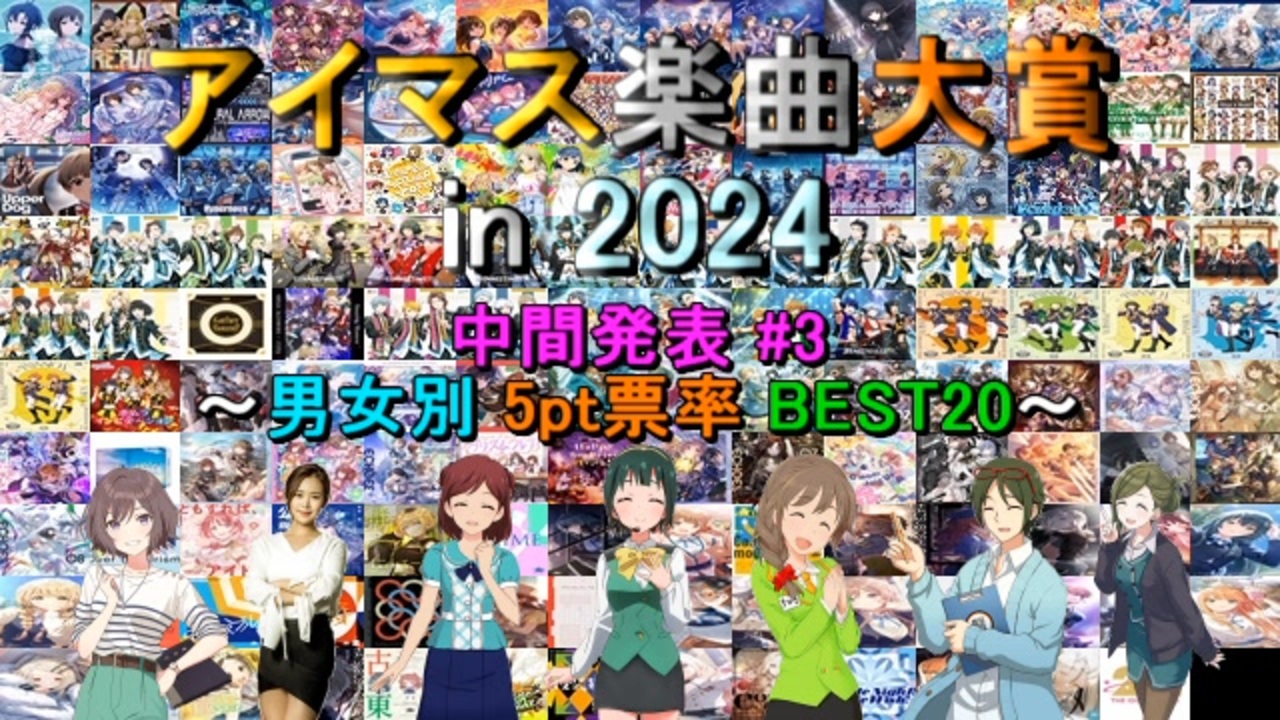 <span style="color: #ff0000;"><strong>2024年にFull音源版が発売 or 配信</strong></span>されたアイマス関連の楽曲<br>(<span style="color: #0000ff;"><strong>計181曲</strong></span>)に対する人気投票企画の中間発表3回目です。<br>参加者<span style="color: #00ff00;"><strong>1300名</strong></span>の時点の結果から、<span style="color: #9900ff;"><strong>各楽曲における5pt票率</strong></span>を<br><span style="color: #980000;"><strong>男女別に上位20曲</strong></span>ご紹介します。<br><br>※<span style="color: #ff00ff;"><strong>5pt票率</strong></span>=<span style="color: #00ffff;"><strong>各楽曲の獲得5pt票数</strong></span>÷<span style="color: #ff9900;"><strong>各楽曲の獲得総票数</strong></span><br>※同率の順位の場合は順位右に「<span style="color: #45818e;"><strong>T</strong></span>」を表示。<br><br><span style="font-size: 24px;"><strong>☆最終結果完成しました!⇒<a href="https://www.nicovideo.jp/watch/sm44641740" class="watch">sm44641740</a></strong></span><br><br>○告知動画:<a href="https://www.nicovideo.jp/watch/sm44483817" class="watch">sm44483817</a><br>○中間2回目(楽曲別 分野順位一覧):<a href="https://www.nicovideo.jp/watch/sm44557773" class="watch">sm44557773</a><br><br>●「アイマス楽曲大賞 最終結果まとめ」:<a href="https://www.nicovideo.jp/mylist/70533939" target="_blank" rel="noopener">mylist/70533939</a><br>●『アイマス楽曲ランキングシリーズ』:<a href="https://www.nicovideo.jp/mylist/57911966" target="_blank" rel="noopener">mylist/57911966</a><br>●『THE IDOLM@STER Song Collection』:<a href="https://www.nicovideo.jp/mylist/61493969" target="_blank" rel="noopener">mylist/61493969</a>