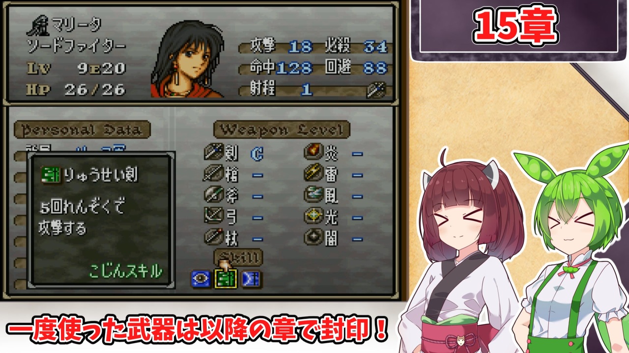 <span style="color: #85200c; font-size: 24px;"><strong><i>我が流星剣、受けてみよ!</i></strong></span><br><br><br><span style="font-size: 16px;"><strong>1:一度使用した武器種は、以降の章で使用する事を禁止する。<br>2:武器の使用の定義は『その武器を装備した状態で敵との戦闘が発生したタイミング』<br>または『その武器を使って敵に「捕える」コマンドを実行したタイミング』<br>杖の場合は『対象に対して使用した時点(命中の可否は問わない)』とする。 </strong></span><br><span style="color: #ff0000; font-size: 16px;"><strong>※同盟軍、演出による戦闘イベントでは使用した判定にはならないこととする。</strong></span><span style="font-size: 16px;"><strong> <br>3:仲間を47人生存させ、【外伝】を含む全ての章を攻略し、総合評価でB以上の状態でゲームをクリアする。</strong></span><br><br><br>本動画のシリーズリスト【<a href="https://www.nicovideo.jp/series/482976" target="_blank" rel="noopener">series/482976</a>】<br>『烈火』の同縛りプレイ【<a href="https://www.nicovideo.jp/series/406473" target="_blank" rel="noopener">series/406473</a>】<br>『封印』の同縛りプレイ【<a href="https://www.nicovideo.jp/series/316824" target="_blank" rel="noopener">series/316824</a>】<br>前:【<a href="https://www.nicovideo.jp/watch/sm44567811" class="watch">sm44567811</a>】次:【<a href="https://www.nicovideo.jp/watch/sm44619618" class="watch">sm44619618</a>】<br><br><strong>使用したソフト</strong><br>VOICEROID+東北きりたんEX<br>VOICEVOX:ずんだもん<br>VOICEPEA:ずんだもん<br><strong>お借りした素材</strong><br>ニコニコモンズの皆様(コンテンツツリー参照)