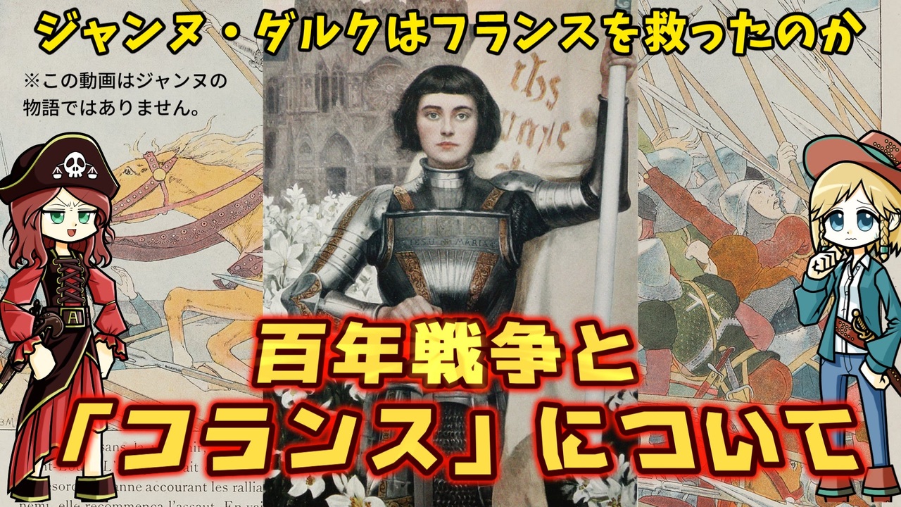 この動画にはほとんどジャンヌ・ダルクは登場しません。 <br>そんなつもりはなかったんですが、タイトル詐欺になってしまいました。ほんとすいません… <br>でも、本題に迫るにはこうするしかなかったんだ。「仕方ない」ってヤツだ。 <br><br>☆復活したニコニコチャンネル「モンド・ヒストリカの離宮」 →<a href="https://ch.nicovideo.jp/mond-historica" target="_blank" rel="noopener nofollow">https://ch.nicovideo.jp/mond-historica</a> <br><br>今回の参考文献: 佐藤猛(2020)『百年戦争 中世ヨーロッパ最後の戦い』中央公論新社<br>池上俊一(2023)『少女は、なぜフランスを救えたのか ジャンヌ・ダルクのオルレアン解放』岩波書店<br>加藤玄(2022)『ジャンヌ・ダルクと百年戦争』(世界史リブレット)山川出版社<br><br>twitter | <a href="https://twitter.com/Yukkuri_mond" target="_blank" rel="noopener nofollow">https://twitter.com/Yukkuri_mond</a><br />━━━━━━━━━━━━━━━━━━━━━<br><br>この動画はクリエイティブ・コモンズ継承(CC-BY-SA)ライセンスの素材を使用して制作しています。(<a href="https://creativecommons.org/licenses/by-sa/4.0/)" target="_blank" rel="noopener nofollow">https://creativecommons.org/licenses/by-sa/4.0/)</a><br>規約に基づき、この動画もCC-BY-SA 4.0 のもとで公開します。<br><br>投稿者共通情報☆彡<br><br>BGM, SE:ニコニ・コモンズ様<br><a href="http://commons.nicovideo.jp/" target="_blank" rel="noopener nofollow">http://commons.nicovideo.jp/</a><br>魔王魂様<br><a href="https://maoudamashii.jokersounds.com/" target="_blank" rel="noopener nofollow">https://maoudamashii.jokersounds.com/</a><br>Audiostock様<br><a href="https://audiostock.jp/" target="_blank" rel="noopener nofollow">https://audiostock.jp/</a><br><br>立ち絵 霊夢・魔理沙(黒子式):nicotalk様<br><a href="http://www.nicotalk.com/charasozai.html" target="_blank" rel="noopener nofollow">http://www.nicotalk.com/charasozai.html</a><br><br>立ち絵 パトラ、マリー、アン、メアリ:ライフライフ様<br><a href="https://0801lifelife.tumblr.com/" target="_blank" rel="noopener nofollow">https://0801lifelife.tumblr.com/</a><br><br>使用ツール1:ゆっくりムービーメーカー4<br><a href="https://manjubox.net/ymm4/" target="_blank" rel="noopener nofollow">https://manjubox.net/ymm4/</a><br><br>使用ツール2:AviUtl<br><a href="http://spring-fragrance.mints.ne.jp/aviutl/" target="_blank" rel="noopener nofollow">http://spring-fragrance.mints.ne.jp/aviutl/</a><br><br>各時代の地図 : World History Maps & Timelines <br><a href="http://geacron.com/home-en/" target="_blank" rel="noopener nofollow">http://geacron.com/home-en/</a><br><br>ゆっくりボイスについて:AquesTalkライセンス取得済み<br><br>キャラクターボイス<br>アン・ボニー:羽ノ華(A.I.VOICE)<br>メアリ・リード:琴葉 葵(A.I.VOICE)<br>クレオパトラ:結月ゆかり(VOICEROID2)<br>マリー‐アントワネット:東北きりたん (VOICEROID EX)<br>その他キャラ:青山龍星(A.I.VOICE)、伊織弓鶴(A.I.VOICE2)、栗田まろん(A.I.VOICE)、宮舞モカ(VOICEPEAK)、フリモメン(VOICEPEAK)<br><br><br><br>その他フリー素材ご提供元の皆様に圧倒的感謝<br>