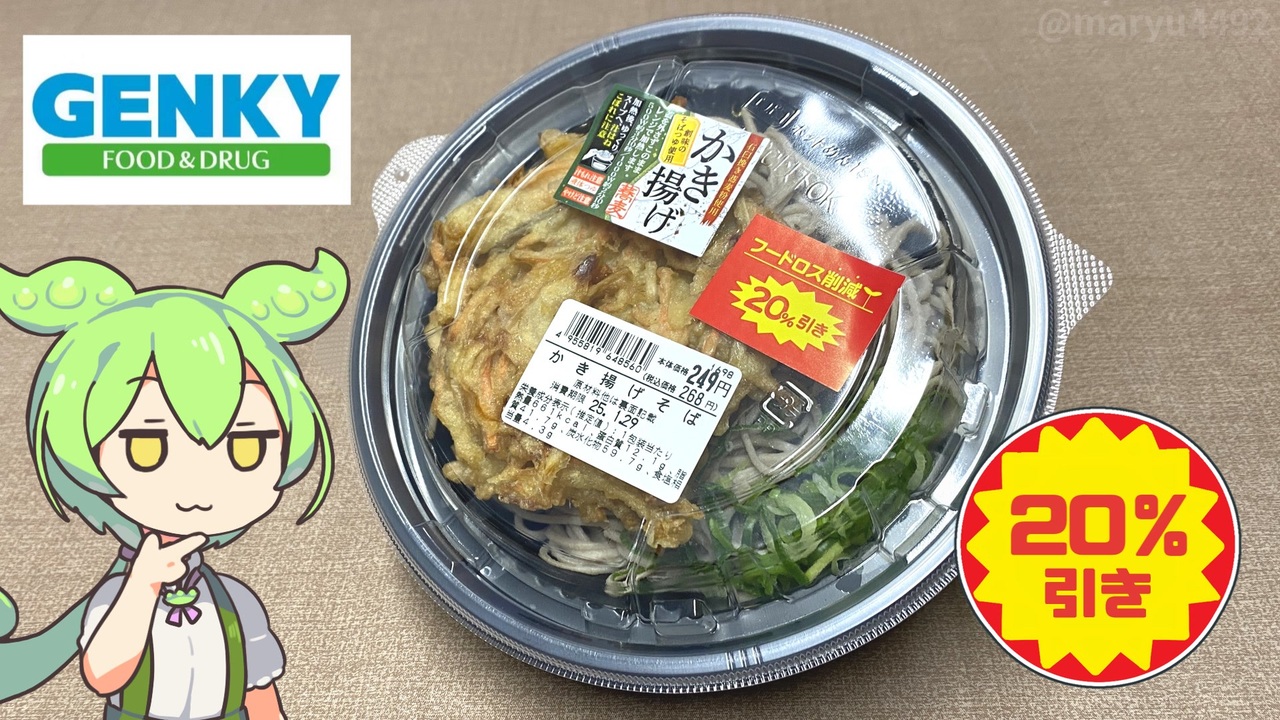 ドラッグストア、ゲンキーで値引きされたかき揚げそばを買ってきました。<br>※本体価格249円<br><br><br>【参考】 <br>ゲンキー株式会社<br> <a href="http://genky.co.jp/" target="_blank" rel="noopener nofollow">http://genky.co.jp/</a> <br>藤本食品株式会社 <br><a href="https://www.fujimotofoods.co.jp/" target="_blank" rel="noopener nofollow">https://www.fujimotofoods.co.jp/</a> <br>藤本食品(株)(マイナビ2026)<br> <a href="https://job.mynavi.jp/26/pc/search/corp81630/outline.html" target="_blank" rel="noopener nofollow">https://job.mynavi.jp/26/pc/search/corp81630/outline.html</a> <br><br>【使用した素材】(※敬称略) <br>(合成音声)VOICEVOX/ずんだもん/四国めたん<br> <a href="https://voicevox.hiroshiba.jp/" target="_blank" rel="noopener nofollow">https://voicevox.hiroshiba.jp/</a> <br>(立ち絵)坂本アヒル<br> <a href="https://seiga.nicovideo.jp/seiga/im10788496?track" target="_blank" rel="noopener nofollow">https://seiga.nicovideo.jp/seiga/im10788496?track</a> <br>(楽曲)甘茶の音楽工房/「楽しい麦畑」「フルーツパフェ」「お城の舞踏会」 <br><a href="https://amachamusic.chagasi.co" target="_blank" rel="noopener nofollow">https://amachamusic.chagasi.co</a>