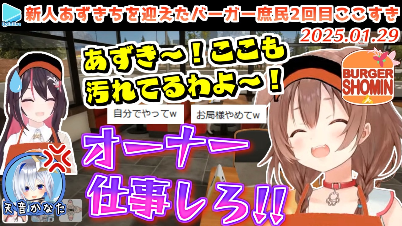 後半は真面目に本気出してた模様<br><br><a href="#" class="seekTime" data-seekTime="00:00" onclick="seekNicoPlayer('#00:00'); return false;">#00:00</a> 新人バイトあずきち<br><a href="#" class="seekTime" data-seekTime="01:16" onclick="seekNicoPlayer('#01:16'); return false;">#01:16</a> いつもの<br><a href="#" class="seekTime" data-seekTime="02:04" onclick="seekNicoPlayer('#02:04'); return false;">#02:04</a> そこ乗らないで<br><a href="#" class="seekTime" data-seekTime="03:09" onclick="seekNicoPlayer('#03:09'); return false;">#03:09</a> 仕事して<br><a href="#" class="seekTime" data-seekTime="04:16" onclick="seekNicoPlayer('#04:16'); return false;">#04:16</a> これはなんだい?<br><a href="#" class="seekTime" data-seekTime="05:42" onclick="seekNicoPlayer('#05:42'); return false;">#05:42</a> ピクルス<br><a href="#" class="seekTime" data-seekTime="06:15" onclick="seekNicoPlayer('#06:15'); return false;">#06:15</a> ダブルあずき?・大判焼き<br><a href="#" class="seekTime" data-seekTime="07:34" onclick="seekNicoPlayer('#07:34'); return false;">#07:34</a> トイレ覗かないで<br><a href="#" class="seekTime" data-seekTime="08:24" onclick="seekNicoPlayer('#08:24'); return false;">#08:24</a> バイトの正論<br><a href="#" class="seekTime" data-seekTime="09:08" onclick="seekNicoPlayer('#09:08'); return false;">#09:08</a> 帰宅ラッシュ<br><a href="#" class="seekTime" data-seekTime="10:05" onclick="seekNicoPlayer('#10:05'); return false;">#10:05</a> 1個残っちゃった<br><br>元動画様はこちら<br>【ころね支店】バーガー庶民に新人アルバイトきたああああ!!!🍔 【Fast Food Simulator】<br><a href="https://youtu.be/0MeP9huAU74" target="_blank" rel="noopener nofollow">https://youtu.be/0MeP9huAU74</a><br><br>【Fast Food Simulator】バーガー庶民にNEWメンバーが……!?🍔🍔 【天音かなた/ホロライブ】<br><a href="https://youtu.be/68gG5ZJpnJQ" target="_blank" rel="noopener nofollow">https://youtu.be/68gG5ZJpnJQ</a><br><br>【Fast Food Simulator】新人アルバイト初出勤 #バーガー庶民【ホロライブ / AZKi / 戌神ころね / 天音かなた】<br><a href="https://youtu.be/rO01lxQ0B58" target="_blank" rel="noopener nofollow">https://youtu.be/rO01lxQ0B58</a><br><br>Korone Ch. 戌神ころね <a href="https://t.co/qeTXwRU2F1" target="_blank" rel="noopener nofollow">https://t.co/qeTXwRU2F1</a><br>Kanata Ch. 天音かなた <a href="https://t.co/rVcDJmho1o" target="_blank" rel="noopener nofollow">https://t.co/rVcDJmho1o</a><br>AZKi Channel <a href="https://t.co/yd3bObJi1O" target="_blank" rel="noopener nofollow">https://t.co/yd3bObJi1O</a><br /><span style="color: #b7b7b7; font-size: 10px;">ホロライブ切り抜き/なめたけ <a href="https://t.co/CBwJLnYR2c" target="_blank" rel="noopener nofollow">https://t.co/CBwJLnYR2c</a></span>