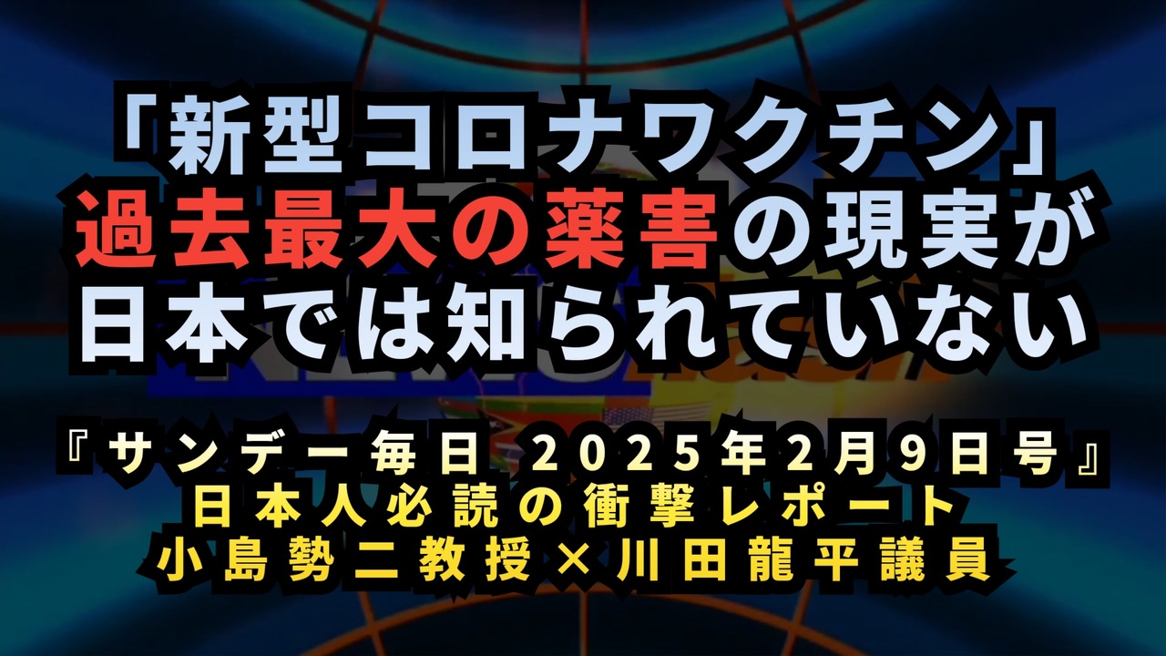 ◆『サンデー毎日 2025年2月9日号 – 日本人必読の衝撃レポート』<br>amzn.to/4jCuiFX <br><br><br>◆「新型コロナワクチン」過去最大の薬害の現実が日本では知られていない <br>『サンデー毎日 2025年2月9日号』日本人必読の衝撃レポート小島勢二×川田龍平<br>x.com/hudikaha/status/1884606276027781523?t=aleyU1Y9DIsewEXBx5WH7A&s=19 <br><br><br>◆今回の台本 若干長めの台本もあり<br><a href="https://keiichiro8140.hatenablog.com/entry/2025/01/30/101708?_gl=1*7obabj*_gcl_au*NDQ1MDIzNjI1LjE3MzQzMjI4MDY." target="_blank" rel="noopener nofollow">https://keiichiro8140.hatenablog.com/entry/2025/01/30/101708?_gl=1*7obabj*_gcl_au*NDQ1MDIzNjI1LjE3MzQzMjI4MDY.</a><br><br><br>ワクチン問題 <br>DNA汚染<br>ワクチン副反応<br>免疫不全<br>感染リスク <br>薬害史上最大<br>死亡率上昇<br>がん増加<br>薬事承認の闇<br>製薬業界の実態<br>報道されない真実<br><br><br />著作権、肖像権に配慮して作成しております。<br><br>◆気になったニュースの台本!?<br>メモ代わりに作った台本をそのままあげてます<br><a href="https://keiichiro8140.hatenablog.com/." target="_blank" rel="noopener nofollow">https://keiichiro8140.hatenablog.com/.</a><br><br><br>ここからはシリーズ紹介<br><br><br>◆ ワクチン解毒・デトックス<br><a href="https://x.gd/fZweg" target="_blank" rel="noopener nofollow">https://x.gd/fZweg</a><br><br>◆ウイリアム・マキス博士のがん治療(イベルメクチン・フェンベンダゾール等)<br><a href="https://x.gd/AtFYS" target="_blank" rel="noopener nofollow">https://x.gd/AtFYS</a><br><br>◆予防接種健康被害救済制度<br><a href="https://x.gd/0xK9x" target="_blank" rel="noopener nofollow">https://x.gd/0xK9x</a><br><br>◆気になったニュース #1501~<br><br>◆ 【ショートver】気になったニュース<br><a href="https://x.gd/7MxXC" target="_blank" rel="noopener nofollow">https://x.gd/7MxXC</a><br><br>◆ 気になったニュース #1001~<br><a href="https://x.gd/Lp8gv" target="_blank" rel="noopener nofollow">https://x.gd/Lp8gv</a><br><br>◆ 気になったニュース #501~<br><a href="https://x.gd/EmbS4" target="_blank" rel="noopener nofollow">https://x.gd/EmbS4</a><br><br>◆ 気になったニュース #1~#500<br><a href="https://x.gd/uPhNb" target="_blank" rel="noopener nofollow">https://x.gd/uPhNb</a><br><br>◆ X(旧Twitter)・テレグラムで気になった情報<br><a href="https://x.gd/YG6FT" target="_blank" rel="noopener nofollow">https://x.gd/YG6FT</a><br><br>◆ 日比谷5万人パレードデ⚪生放送アーカイブ動画<br><a href="https://x.gd/3CHJv" target="_blank" rel="noopener nofollow">https://x.gd/3CHJv</a><br><br>◆日比谷5万人パレード⚪モのマイリスト作ってみました<br><a href="https://nico.ms/mylist/76828848?ref=sp_other" target="_blank" rel="noopener nofollow">https://nico.ms/mylist/76828848?ref=sp_other</a><br><br>◆3.30 令和の百姓⚪⚪<br><a href="https://www.nicovideo.jp/series/511791?ref=garage_share_other" target="_blank" rel="noopener nofollow">https://www.nicovideo.jp/series/511791?ref=garage_share_other</a><br><br>◆ 及川幸久さんの【XNEWS】シリーズ<br><a href="https://x.gd/3k78K" target="_blank" rel="noopener nofollow">https://x.gd/3k78K</a><br><br>◆これまでの動画<a href="https://x.gd/sPXoJ" target="_blank" rel="noopener nofollow">https://x.gd/sPXoJ</a><br><br>◆もしも(BAN)の時のためのマイリンク集<a href="https://lit.link/K-16_News44" target="_blank" rel="noopener nofollow">https://lit.link/K-16_News44</a><br><br>