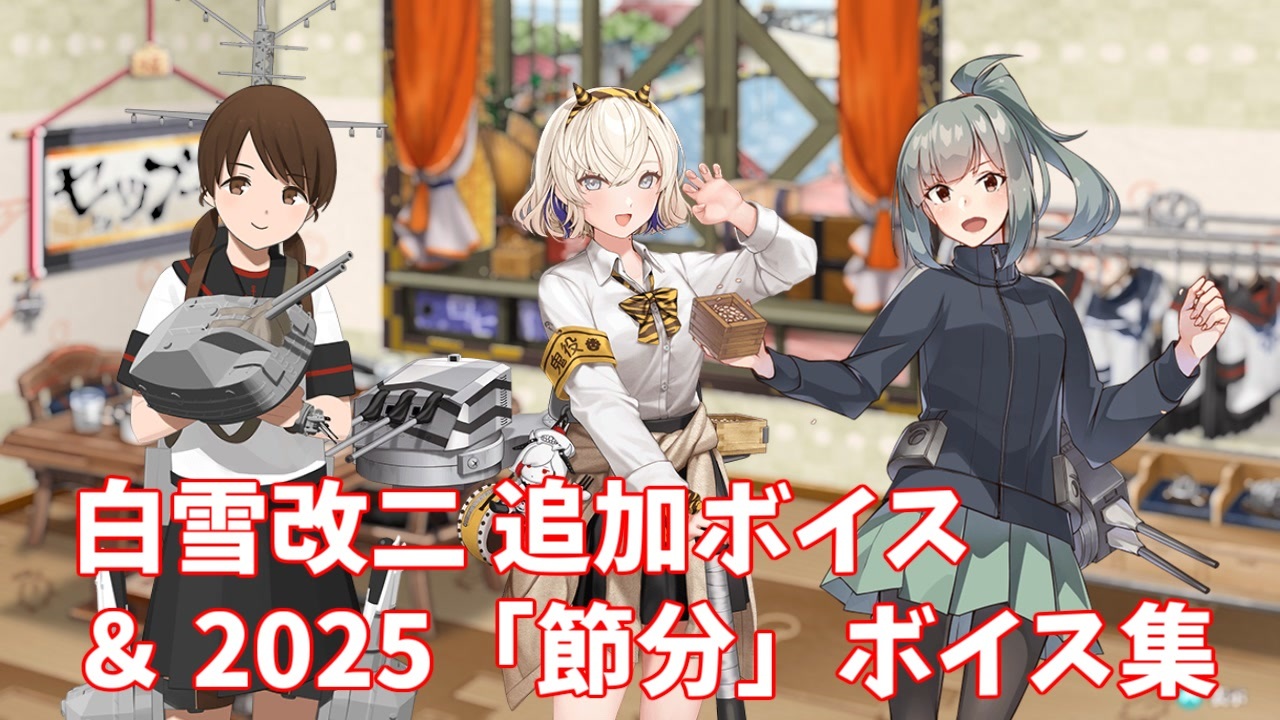 白雪改二の追加ボイスと、12隻の新規「節分」ボイス集です。<br>2024年の「節分」ボイスはこちら→ <a href="https://www.nicovideo.jp/watch/sm43325632" class="watch">sm43325632</a> <br><br><a href="#" class="seekTime" data-seekTime="00:04" onclick="seekNicoPlayer('#00:04'); return false;">#00:04</a> 白雪改二 追加ボイス(時報ボイス有り)<br><a href="#" class="seekTime" data-seekTime="08:44" onclick="seekNicoPlayer('#08:44'); return false;">#08:44</a> 節分ボイス等(図鑑No.順)<br>(吹雪 初雪 大和 Drum Valiant 平安丸 Phoenix Mogador Gloire Lexington 伊36 伊41)<br><br>【新規絵】<br>(白雪改二 曙/改二 夕張 風雲改二 山汐丸 Heywood_L.E/改 朝日/改 Gloire/改)<br>※1/7のオンメンテで追加された山汐丸とHeywoodの新春modeも収録しています。<br><br>前|2024「年末」ボイス集② & 2025「新春」ボイス集 (1/1アップデート) <a href="https://www.nicovideo.jp/watch/sm44495722" class="watch">sm44495722</a> <br><strong>次|2025「バレンタイン」ボイス集 (2/13アップデート) </strong><a href="https://www.nicovideo.jp/watch/sm44649504" class="watch">sm44649504</a><br><br>艦これ追加ボイス集 マイリスト(<a href="https://www.nicovideo.jp/mylist/40513442" target="_blank" rel="noopener">mylist/40513442</a>)<br>シリーズ(<a href="https://www.nicovideo.jp/series/34200" target="_blank" rel="noopener">series/34200</a>)<br><br>Youtubeでも活動しています。<br>チャンネル <a href="https://www.youtube.com/channel/UCTYYB9O7hiQlH6Ee-Xxlbpg" target="_blank" rel="noopener nofollow">https://www.youtube.com/channel/UCTYYB9O7hiQlH6Ee-Xxlbpg</a>