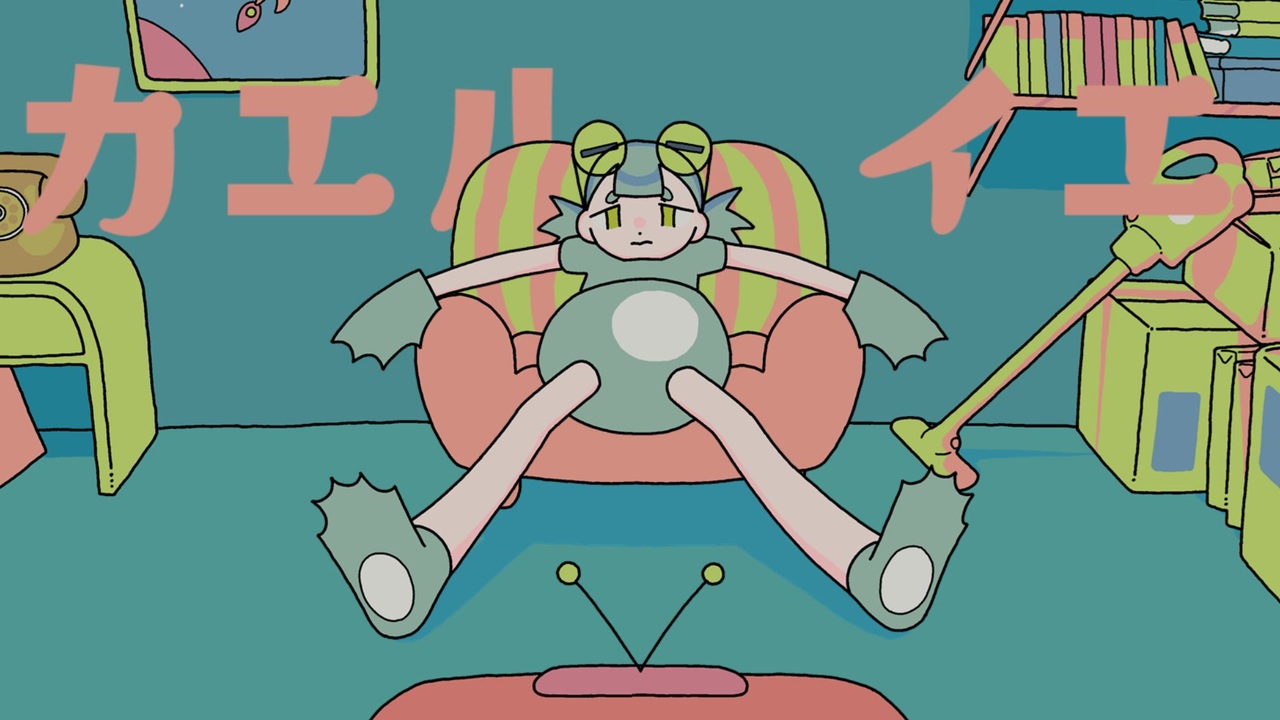 イエでだらだらしがちなカエルさん。<br>理想の跳躍について考えたりするも。。<br><br><span style="color: #00ff00; font-size: 18px;"><strong>ボカコレ2025冬ルーキー参加楽曲です!<br>いいね、マイリスト、コメントにてぜひ応援ください!!!</strong></span><br><br>ボカコレもう一曲 コークハイ<br><a href="https://www.nicovideo.jp/watch/sm44603150" target="_blank" rel="noopener nofollow">https://www.nicovideo.jp/watch/sm44603150</a><br><br>↓弾幕用素材、、両者の運命はいかに!!??<br>🐸🐸🐸🐸🐸🐸🐸<br>🐟🐟🐟🐟🐟🐟🐟<br><br>音楽、動画 koge<br><a href="https://x.com/Koge74873992" target="_blank" rel="noopener nofollow">https://x.com/Koge74873992</a><br><br>イラスト 驟々みそばた<br><a href="https://x.com/msbt987" target="_blank" rel="noopener nofollow">https://x.com/msbt987</a><br><br>アニメーション をんたま<br><a href="https://x.com/wontama" target="_blank" rel="noopener nofollow">https://x.com/wontama</a><br><br>Sax , brass arrangement bobet<br><a href="https://x.com/Bobet_HP" target="_blank" rel="noopener nofollow">https://x.com/Bobet_HP</a><br><br>Inst(歌ってみた素材)<br><a href="https://drive.google.com/drive/folders/1Hgo_oh5g6_2fIaXW9y3N2Szz-cnKcRVt?usp=drive_link" target="_blank" rel="noopener nofollow">https://drive.google.com/drive/folders/1Hgo_oh5g6_2fIaXW9y3N2Szz-cnKcRVt?usp=drive_link</a><br><br><br>巨大な魚 滑るように泳ぐ<br>豪華な水槽の動画 見ている<br>ぐうたら昼下がり<br>カエルにだって理想の跳躍はある<br>そろそろ下らないものばっか<br>観ている場合じゃない<br><br>繰り返す繰り返す<br>地面と靴の関係<br>繰り返す繰り返す<br>理想の脚のフォーム<br><br>ぴょこぴょこぴょこソファみれど<br>ムチムチ脚転ばない<br><br>ケロケロケロソファみゲコ<br>ドキドキ夢外さない?<br><br>僕らは何を思い<br>何を目指して生きるゲコ<br>遠い<br>夕日想い 故郷見つめ<br>キラリ 光る涙を 拭わない みずのなか<br><br>過剰投与された人工飼料に<br>表示された栄養価が真なら<br>起こり得ないだろが<br>明解な声帯の特異状態<br>かと言って摂食を拒むと体調の維持不可能<br><br>振り返る蒸し返す<br>のどあめ どのあめ選ぶの<br>若返る跳ね返る<br>カルトオカルトなんでもあれ<br><br>ぴょこぴょこぴょこソファみれど<br>ムチムチ脚転ばない<br><br>ケロケロケロソファみゲコ<br>ドキドキ夢外さない?<br><br>僕らは何を思い<br>何を目指して生きるゲコ<br>遠い<br>夕日想い 故郷見つめ<br>キラリ 光る涙を 拭わない<br><br><a target="_blank" href="https://qa.nicovideo.jp/faq/show/19424?site_domain=default" style="font-size: 13px;color: #657586; text-decoration: underline; line-height: 1.4">この動画は投稿者によって修正されました</a>