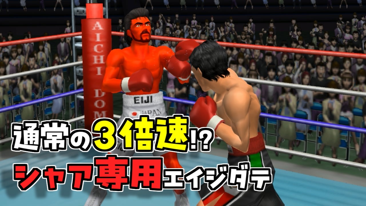 以前伊達さんのフットワーク値をマックスにしたことがありましたが、システム上の上限でおおよそ2倍程度にしかならず、かつ早い段階でリカルドに打撃を入れられ遅くなって結局負けたと言う試合がありました。<br>今回は前回の反省を生かして、フットワーク値ではなく、モーション速度のプログラムを乗っ取り、伊達さんだけすべてのモーションを3倍速になるように変更してみました。<br>通常の3倍?シャア専用エイジ・ダテの完成です。<br>ついでに、シャアザクっぽく伊達さんも赤くしてみました。<br>今日こそ伊達英二はリカルドマルチネスに勝てるのでしょうか?<br><br>使用ソフト:はじめの一歩 2 VICTORIOUS ROAD PS2版<br>ジャンル:ボクシングゲーム<br><br>会長 VS リカルド →<a href="https://www.nicovideo.jp/watch/sm44079325" class="watch">sm44079325</a><br>デブになった鷹村 →<a href="https://www.nicovideo.jp/watch/sm43384767" class="watch">sm43384767</a><br>パパイヤ迫真の追撃 →<a href="https://www.nicovideo.jp/watch/sm44326277" class="watch">sm44326277</a><br>ゲロ道 VS アルフレド →<a href="https://www.nicovideo.jp/watch/sm44423708" class="watch">sm44423708</a><br>一歩追い打ちしてしまう →<a href="https://www.nicovideo.jp/watch/sm44079346" class="watch">sm44079346</a><br />動画に「いいね!」「マイリスト登録」よろしくお願いします。<br><br>・おすすめ<br>[TAS]Grand Theft Auto 3 Part1→<a href="https://www.nicovideo.jp/watch/sm14718961" class="watch">sm14718961</a><br>[TAS]MaxPayne デッドターゲット Part1→<a href="https://www.nicovideo.jp/watch/sm15093299" class="watch">sm15093299</a><br>[TAS]michigan Part1→<a href="https://www.nicovideo.jp/watch/sm18393230" class="watch">sm18393230</a><br><br>サポート頂けると励みになります<br>魔界塔士のサポーターになる→<a href="https://creator-support.nicovideo.jp/registration/15153622" target="_blank" rel="noopener nofollow">https://creator-support.nicovideo.jp/registration/15153622</a><br><br>TAS動画まとめ→<a href="https://koeiprogenitor.com/tas/matome/" target="_blank" rel="noopener nofollow">https://koeiprogenitor.com/tas/matome/</a><br>つべ→<a href="https://www.youtube.com/user/koeiprogenitor1/" target="_blank" rel="noopener nofollow">https://www.youtube.com/user/koeiprogenitor1/</a><br>インスタ→<a href="https://www.instagram.com/makaitoshi" target="_blank" rel="noopener nofollow">https://www.instagram.com/makaitoshi</a><br><br>本編→シリーズ一覧見てね<br>