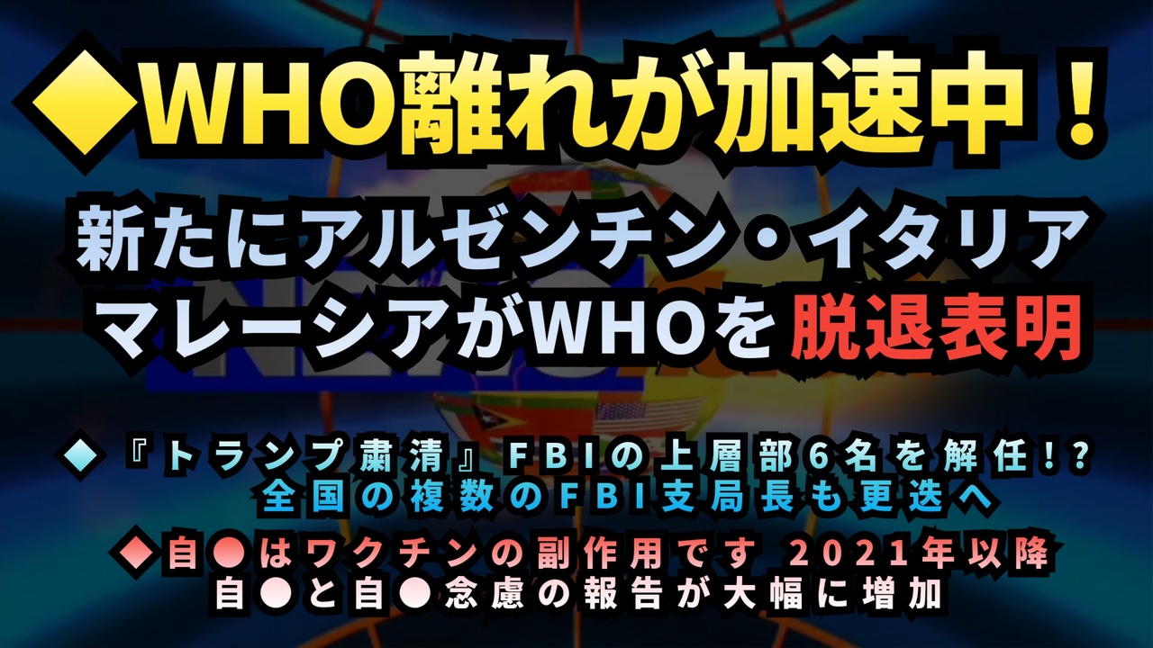 ◆WHOさん、さようなら。 世界保健機関が直面している危機、アメリカ・マレーシア・アルゼンチンなどが脱退意向を示す <a href="https://x.com/JmaxTopics/status/1885684071038382141?t=JHilrrhOJak9RqWq5HQV7A&s=19" target="_blank" rel="noopener nofollow">https://x.com/JmaxTopics/status/1885684071038382141?t=JHilrrhOJak9RqWq5HQV7A&s=19</a><br><br><br>◆トランプ大統領によるFBIの腐敗の沼を大掃除『トランプ粛清』グローバリスト側一掃開始 <a href="https://x.com/WarClandestine/status/1885542148386300259?t=qLY-O969AaCwJVjMJ7U0XA&s=19" target="_blank" rel="noopener nofollow">https://x.com/WarClandestine/status/1885542148386300259?t=qLY-O969AaCwJVjMJ7U0XA&s=19</a><br><br><br>◆自●はワクチンの副作用です ワクチンとの関連性を示唆、VAERSに報告すべき自●と自●念慮の増加 <a href="https://x.com/HimalayaJapan/status/1885646003904327828?t=8Qf955T0NEnY5obPIVrj0g&s=19" target="_blank" rel="noopener nofollow">https://x.com/HimalayaJapan/status/1885646003904327828?t=8Qf955T0NEnY5obPIVrj0g&s=19</a><br><br><br>WHO脱退<br>グローバリスト<br>世界保健機関<br>トランプ大統領<br>FBI<br>大量解雇<br>1月6日議事堂襲撃事件<br>クビ<br>コロナワクチン<br>ワクチン被害<br>ワクチン接種開始以降自殺が増加<br><br><br />著作権、肖像権に配慮して作成しております。<br><br>◆気になったニュースの台本!?<br>メモ代わりに作った台本をそのままあげてます<br><a href="https://keiichiro8140.hatenablog.com/." target="_blank" rel="noopener nofollow">https://keiichiro8140.hatenablog.com/.</a><br><br><br>ここからはシリーズ紹介<br><br><br>◆ ワクチン解毒・デトックス<br><a href="https://x.gd/fZweg" target="_blank" rel="noopener nofollow">https://x.gd/fZweg</a><br><br>◆ウイリアム・マキス博士のがん治療(イベルメクチン・フェンベンダゾール等)<br><a href="https://x.gd/AtFYS" target="_blank" rel="noopener nofollow">https://x.gd/AtFYS</a><br><br>◆予防接種健康被害救済制度<br><a href="https://x.gd/0xK9x" target="_blank" rel="noopener nofollow">https://x.gd/0xK9x</a><br><br>◆気になったニュース #1501~<br><br>◆ 【ショートver】気になったニュース<br><a href="https://x.gd/7MxXC" target="_blank" rel="noopener nofollow">https://x.gd/7MxXC</a><br><br>◆ 気になったニュース #1001~<br><a href="https://x.gd/Lp8gv" target="_blank" rel="noopener nofollow">https://x.gd/Lp8gv</a><br><br>◆ 気になったニュース #501~<br><a href="https://x.gd/EmbS4" target="_blank" rel="noopener nofollow">https://x.gd/EmbS4</a><br><br>◆ 気になったニュース #1~#500<br><a href="https://x.gd/uPhNb" target="_blank" rel="noopener nofollow">https://x.gd/uPhNb</a><br><br>◆ X(旧Twitter)・テレグラムで気になった情報<br><a href="https://x.gd/YG6FT" target="_blank" rel="noopener nofollow">https://x.gd/YG6FT</a><br><br>◆ 日比谷5万人パレードデ⚪生放送アーカイブ動画<br><a href="https://x.gd/3CHJv" target="_blank" rel="noopener nofollow">https://x.gd/3CHJv</a><br><br>◆日比谷5万人パレード⚪モのマイリスト作ってみました<br><a href="https://nico.ms/mylist/76828848?ref=sp_other" target="_blank" rel="noopener nofollow">https://nico.ms/mylist/76828848?ref=sp_other</a><br><br>◆3.30 令和の百姓⚪⚪<br><a href="https://www.nicovideo.jp/series/511791?ref=garage_share_other" target="_blank" rel="noopener nofollow">https://www.nicovideo.jp/series/511791?ref=garage_share_other</a><br><br>◆ 及川幸久さんの【XNEWS】シリーズ<br><a href="https://x.gd/3k78K" target="_blank" rel="noopener nofollow">https://x.gd/3k78K</a><br><br>◆これまでの動画<a href="https://x.gd/sPXoJ" target="_blank" rel="noopener nofollow">https://x.gd/sPXoJ</a><br><br>◆もしも(BAN)の時のためのマイリンク集<a href="https://lit.link/K-16_News44" target="_blank" rel="noopener nofollow">https://lit.link/K-16_News44</a><br><br>