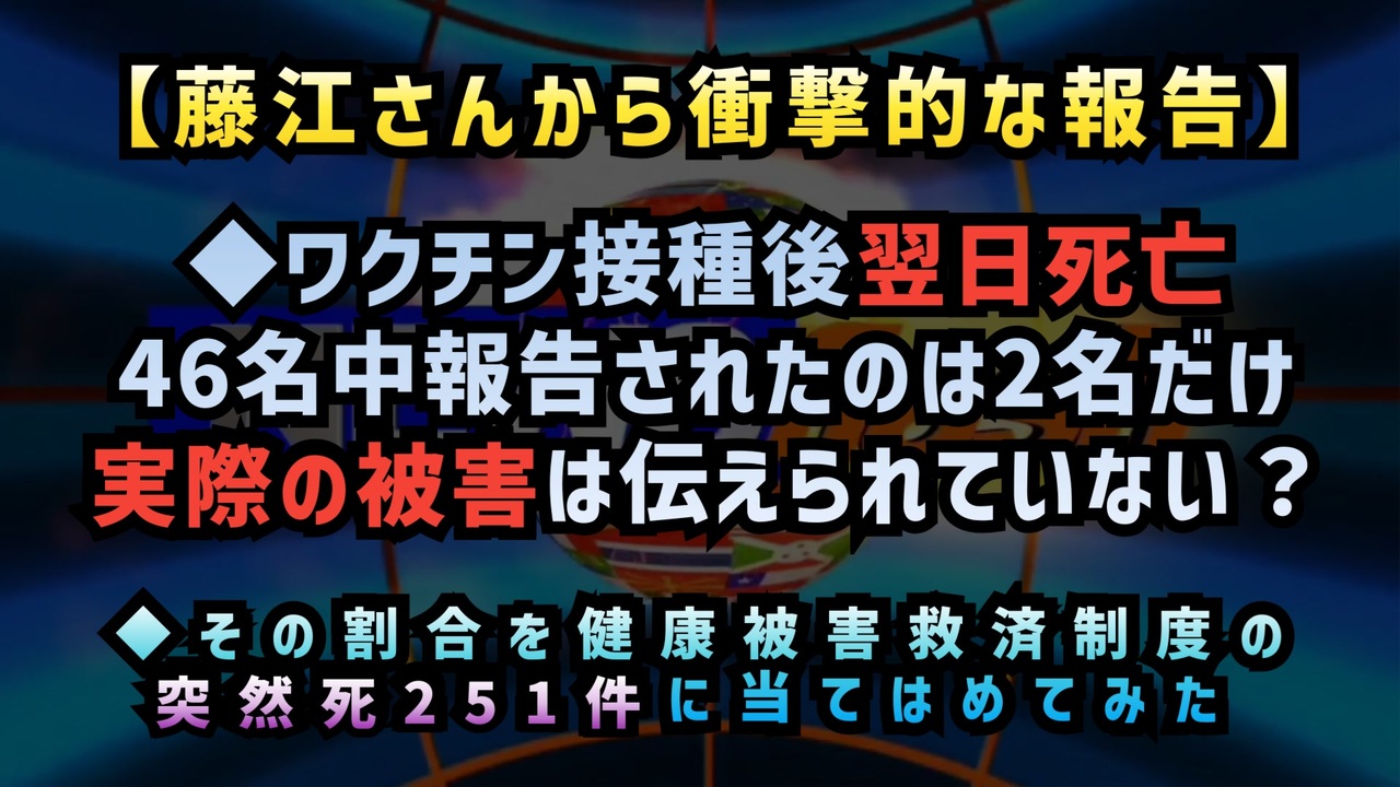 藤江さんから衝撃的な報告。<br>浜松市の情報開示請求により開示されたデータと副反応疑い報告から、<br>『(ワクチン接種)翌日死亡46名のうち報告されたのは2名』<br><br><a href="https://x.com/hudikaha/status/1885566001364033983?t=NxwJjeQ-kfMvh1qHglrEiQ&s=19" target="_blank" rel="noopener nofollow">https://x.com/hudikaha/status/1885566001364033983?t=NxwJjeQ-kfMvh1qHglrEiQ&s=19</a><br><br><br>藤江さん独自調べ<br>ワクチン翌日死亡46名中、報告はたったの2名!?実際の被害は… <a href="https://x.com/hudikaha/status/1885566001364033983?t=NxwJjeQ-kfMvh1qHglrEiQ&s=19" target="_blank" rel="noopener nofollow">https://x.com/hudikaha/status/1885566001364033983?t=NxwJjeQ-kfMvh1qHglrEiQ&s=19</a><br><br><br>ChatGPTに計算してもらいました<br><a href="https://chatgpt.com/share/679f218b-2a68-8000-9929-1d2fcfae5026" target="_blank" rel="noopener nofollow">https://chatgpt.com/share/679f218b-2a68-8000-9929-1d2fcfae5026</a><br><br><br>コロナワクチン<br>ワクチン副反応<br>ワクチン死亡率<br>浜松市<br>隠された被害<br>ワクチン接種後死亡<br>突然死<br>予防接種健康被害救済制度<br>厚生労働省<br>氷山の一角<br>未報告の実態<br><br><br />著作権、肖像権に配慮して作成しております。<br><br>◆気になったニュースの台本!?<br>メモ代わりに作った台本をそのままあげてます<br><a href="https://keiichiro8140.hatenablog.com/." target="_blank" rel="noopener nofollow">https://keiichiro8140.hatenablog.com/.</a><br><br><br>ここからはシリーズ紹介<br><br><br>◆ ワクチン解毒・デトックス<br><a href="https://x.gd/fZweg" target="_blank" rel="noopener nofollow">https://x.gd/fZweg</a><br><br>◆ウイリアム・マキス博士のがん治療(イベルメクチン・フェンベンダゾール等)<br><a href="https://x.gd/AtFYS" target="_blank" rel="noopener nofollow">https://x.gd/AtFYS</a><br><br>◆予防接種健康被害救済制度<br><a href="https://x.gd/0xK9x" target="_blank" rel="noopener nofollow">https://x.gd/0xK9x</a><br><br>◆気になったニュース #1501~<br><br>◆ 【ショートver】気になったニュース<br><a href="https://x.gd/7MxXC" target="_blank" rel="noopener nofollow">https://x.gd/7MxXC</a><br><br>◆ 気になったニュース #1001~<br><a href="https://x.gd/Lp8gv" target="_blank" rel="noopener nofollow">https://x.gd/Lp8gv</a><br><br>◆ 気になったニュース #501~<br><a href="https://x.gd/EmbS4" target="_blank" rel="noopener nofollow">https://x.gd/EmbS4</a><br><br>◆ 気になったニュース #1~#500<br><a href="https://x.gd/uPhNb" target="_blank" rel="noopener nofollow">https://x.gd/uPhNb</a><br><br>◆ X(旧Twitter)・テレグラムで気になった情報<br><a href="https://x.gd/YG6FT" target="_blank" rel="noopener nofollow">https://x.gd/YG6FT</a><br><br>◆ 日比谷5万人パレードデ⚪生放送アーカイブ動画<br><a href="https://x.gd/3CHJv" target="_blank" rel="noopener nofollow">https://x.gd/3CHJv</a><br><br>◆日比谷5万人パレード⚪モのマイリスト作ってみました<br><a href="https://nico.ms/mylist/76828848?ref=sp_other" target="_blank" rel="noopener nofollow">https://nico.ms/mylist/76828848?ref=sp_other</a><br><br>◆3.30 令和の百姓⚪⚪<br><a href="https://www.nicovideo.jp/series/511791?ref=garage_share_other" target="_blank" rel="noopener nofollow">https://www.nicovideo.jp/series/511791?ref=garage_share_other</a><br><br>◆ 及川幸久さんの【XNEWS】シリーズ<br><a href="https://x.gd/3k78K" target="_blank" rel="noopener nofollow">https://x.gd/3k78K</a><br><br>◆これまでの動画<a href="https://x.gd/sPXoJ" target="_blank" rel="noopener nofollow">https://x.gd/sPXoJ</a><br><br>◆もしも(BAN)の時のためのマイリンク集<a href="https://lit.link/K-16_News44" target="_blank" rel="noopener nofollow">https://lit.link/K-16_News44</a><br><br>