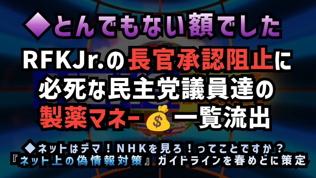 ◆ネットはデマ!NHKが正しい!ってことですか?『ネット上の偽情報対策』ガイドラインを春めどに策定<br><a href="https://x.com/sousyou13/status/1885578636255989908?t=vU-QYuwiCpSVEtEadvsUeQ&s=19" target="_blank" rel="noopener nofollow">https://x.com/sousyou13/status/1885578636255989908?t=vU-QYuwiCpSVEtEadvsUeQ&s=19</a><br><br><br>民主党議員の製薬業界との金銭関係、実は報道の7倍!?<br><br>ここ数日、バーニー・サンダース上院議員が製薬業界から150万ドル(約2.2億円)、エリザベス・ウォーレン上院議員が100万ドル(約1.5億円)を受け取っていたことが話題になっています。<br><br>しかし、これは 誤り です。<br><br>実際には、ロバート・F・ケネディ・ジュニア(RFK)氏を攻撃している民主党議員たちは、報道されている額の7倍もの献金を受け取っていました。<br>①英文<a href="https://t.co/dKQ0JfQQFk" target="_blank" rel="noopener nofollow">https://t.co/dKQ0JfQQFk</a><br><br>②日本語訳<a href="https://x.com/Alzhacker/status/1886023543357579430?t=0Txd9FoFS1X1Gdd2g7ZBPw&s=19" target="_blank" rel="noopener nofollow">https://x.com/Alzhacker/status/1886023543357579430?t=0Txd9FoFS1X1Gdd2g7ZBPw&s=19</a><br><br><br>「私の18歳の娘を殺したmRNA毒を“安全”だと言うのなら、上院議員のキャシディ氏には彼女の検死報告書を確認してもらいたい。<br>彼女は、製薬業界に魂を売ったこの男のデタラメを信じてしまったせいで命を落としたんだ…」<br>— アレン・マーティン(娘トリスタの父)<br> 安らかに…<br> <a href="https://x.com/liz_churchill10/status/1885719516526600578?t=zbb9G2NFj1bIpBMpXZh-HQ&s=19" target="_blank" rel="noopener nofollow">https://x.com/liz_churchill10/status/1885719516526600578?t=zbb9G2NFj1bIpBMpXZh-HQ&s=19</a><br><br><br>上院議員のビル・キャシディは、RFK Jr.への賛成票をまだ確約していません。<br><br>大手製薬企業から50万ドル以上<br><br><a href="https://x.com/liz_churchill10/status/1885825234378387661?t=GyeejWo_Qd-ct-y82GZ1kg&s=19" target="_blank" rel="noopener nofollow">https://x.com/liz_churchill10/status/1885825234378387661?t=GyeejWo_Qd-ct-y82GZ1kg&s=19</a><br><br><br>ネット上の偽情報対策<br>言論統制<br>オールドメディア<br>情報操作<br>多額の献金<br>製薬会社<br>民主党議員の闇献金<br>ワクチン被害の実態<br>mRNAワクチン<br>政治と製薬マネー <br>ロバート・ケネディ・ジュニア<br><br><br />著作権、肖像権に配慮して作成しております。<br><br>◆気になったニュースの台本!?<br>メモ代わりに作った台本をそのままあげてます<br><a href="https://keiichiro8140.hatenablog.com/." target="_blank" rel="noopener nofollow">https://keiichiro8140.hatenablog.com/.</a><br><br><br>ここからはシリーズ紹介<br><br><br>◆ ワクチン解毒・デトックス<br><a href="https://x.gd/fZweg" target="_blank" rel="noopener nofollow">https://x.gd/fZweg</a><br><br>◆ウイリアム・マキス博士のがん治療(イベルメクチン・フェンベンダゾール等)<br><a href="https://x.gd/AtFYS" target="_blank" rel="noopener nofollow">https://x.gd/AtFYS</a><br><br>◆予防接種健康被害救済制度<br><a href="https://x.gd/0xK9x" target="_blank" rel="noopener nofollow">https://x.gd/0xK9x</a><br><br>◆気になったニュース #1501~<br><br>◆ 【ショートver】気になったニュース<br><a href="https://x.gd/7MxXC" target="_blank" rel="noopener nofollow">https://x.gd/7MxXC</a><br><br>◆ 気になったニュース #1001~<br><a href="https://x.gd/Lp8gv" target="_blank" rel="noopener nofollow">https://x.gd/Lp8gv</a><br><br>◆ 気になったニュース #501~<br><a href="https://x.gd/EmbS4" target="_blank" rel="noopener nofollow">https://x.gd/EmbS4</a><br><br>◆ 気になったニュース #1~#500<br><a href="https://x.gd/uPhNb" target="_blank" rel="noopener nofollow">https://x.gd/uPhNb</a><br><br>◆ X(旧Twitter)・テレグラムで気になった情報<br><a href="https://x.gd/YG6FT" target="_blank" rel="noopener nofollow">https://x.gd/YG6FT</a><br><br>◆ 日比谷5万人パレードデ⚪生放送アーカイブ動画<br><a href="https://x.gd/3CHJv" target="_blank" rel="noopener nofollow">https://x.gd/3CHJv</a><br><br>◆日比谷5万人パレード⚪モのマイリスト作ってみました<br><a href="https://nico.ms/mylist/76828848?ref=sp_other" target="_blank" rel="noopener nofollow">https://nico.ms/mylist/76828848?ref=sp_other</a><br><br>◆3.30 令和の百姓⚪⚪<br><a href="https://www.nicovideo.jp/series/511791?ref=garage_share_other" target="_blank" rel="noopener nofollow">https://www.nicovideo.jp/series/511791?ref=garage_share_other</a><br><br>◆ 及川幸久さんの【XNEWS】シリーズ<br><a href="https://x.gd/3k78K" target="_blank" rel="noopener nofollow">https://x.gd/3k78K</a><br><br>◆これまでの動画<a href="https://x.gd/sPXoJ" target="_blank" rel="noopener nofollow">https://x.gd/sPXoJ</a><br><br>◆もしも(BAN)の時のためのマイリンク集<a href="https://lit.link/K-16_News44" target="_blank" rel="noopener nofollow">https://lit.link/K-16_News44</a><br><br>