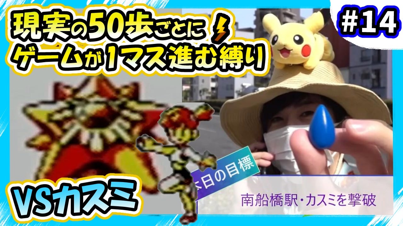 昨年実施した『ポケットモンスターレッツゴー幕張メッセ』<br>現実と連動してゲームが進む縛りプレイです<br><br>前⇒<a href="https://www.nicovideo.jp/watch/sm44505031" class="watch">sm44505031</a><br>次⇒<a href="https://www.nicovideo.jp/watch/sm44672492" class="watch">sm44672492</a><br><br>☆目標<br>(現 実)東京都町田市 →幕張メッセ(千葉県千葉市)<br>(ゲーム)マサラタウン →ゴール:クチバシティ<br><br>【ルール】<br>・現実の50歩=ゲームの1歩<br>・歩数計で常に計測する<br>・各日にチェックポイントを設定、到達するまで終われない<br>・寄り道やレベル上げをしたい場合は追加で歩く<br>・ゲーム操作はポケナビ(スマホ)で指示<br>・徒歩者はゲーム画面を極力見ずプレイヤーとの通話で状況を把握する (現実ルール)<br>・タウンマップを手に入れるまで地図アプリ禁止<br><br>(禁止事項)<br>・歩きポケナビ禁止<br>・裏技禁止<br>・意図的なリセット禁止<br>・方向転換のみでエンカウントしてしまうため、レベル上げのために意図的な移動を伴わない方向転換は禁止(たまたまは仕方ない)<br><br>~~~~~~~~~~~~~~~~~~~~~~~~~~~<br>・Twitter:<a href="https://twitter.com/masa1225kami" target="_blank" rel="noopener nofollow">https://twitter.com/masa1225kami</a><br>・Youtube:<a href="https://www.youtube.com/user/MrMasa1225/videos" target="_blank" rel="noopener nofollow">https://www.youtube.com/user/MrMasa1225/videos</a>