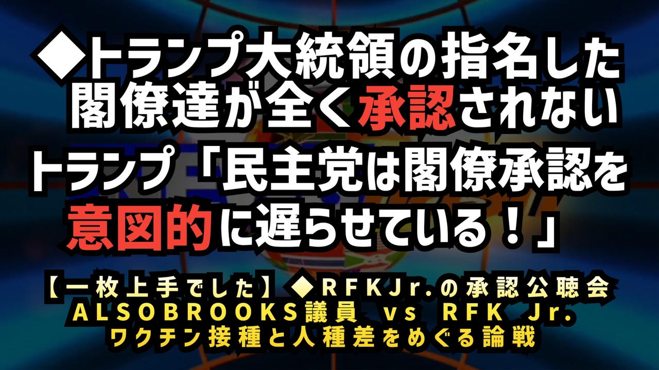 【一枚上手】◆RFKJr.の承認公聴会 ALSOBROOKS議員 vs RFK Jr.の論戦:ワクチンと人種差(免疫)をめぐる論戦 <a href="https://x.com/TheChiefNerd/status/1885034322433802523?t=pHyr4-flGWr9nOPT1k5kFg&s=19" target="_blank" rel="noopener nofollow">https://x.com/TheChiefNerd/status/1885034322433802523?t=pHyr4-flGWr9nOPT1k5kFg&s=19</a><br><br><br>『I yield』<br><br>議会や討論の場で使われる表現で、<br>「発言を終えます」「次の人に譲ります」といった意味。<br><br><br>◆トランプ大統領、民主党の閣僚承認遅延を批判!「閣僚承認を意図的に遅らせている!」 <a href="https://x.com/bennyjohnson/status/1886193549043011987?t=iUOr3sRVELlEtIQ29C7mhg&s=19" target="_blank" rel="noopener nofollow">https://x.com/bennyjohnson/status/1886193549043011987?t=iUOr3sRVELlEtIQ29C7mhg&s=19</a><br><br><br>ワクチン<br>承認公聴会<br>ロバート・ケネディ・ジュニア<br>査読付き研究論文<br>科学的な研究<br>ワクチン接種<br>民主党<br>共和党<br>トランプ大統領<br>免疫システム<br>政治<br><br><br />著作権、肖像権に配慮して作成しております。<br><br>◆気になったニュースの台本!?<br>メモ代わりに作った台本をそのままあげてます<br><a href="https://keiichiro8140.hatenablog.com/." target="_blank" rel="noopener nofollow">https://keiichiro8140.hatenablog.com/.</a><br><br><br>ここからはシリーズ紹介<br><br><br>◆ ワクチン解毒・デトックス<br><a href="https://x.gd/fZweg" target="_blank" rel="noopener nofollow">https://x.gd/fZweg</a><br><br>◆ウイリアム・マキス博士のがん治療(イベルメクチン・フェンベンダゾール等)<br><a href="https://x.gd/AtFYS" target="_blank" rel="noopener nofollow">https://x.gd/AtFYS</a><br><br>◆予防接種健康被害救済制度<br><a href="https://x.gd/0xK9x" target="_blank" rel="noopener nofollow">https://x.gd/0xK9x</a><br><br>◆気になったニュース #1501~<br><br>◆ 【ショートver】気になったニュース<br><a href="https://x.gd/7MxXC" target="_blank" rel="noopener nofollow">https://x.gd/7MxXC</a><br><br>◆ 気になったニュース #1001~<br><a href="https://x.gd/Lp8gv" target="_blank" rel="noopener nofollow">https://x.gd/Lp8gv</a><br><br>◆ 気になったニュース #501~<br><a href="https://x.gd/EmbS4" target="_blank" rel="noopener nofollow">https://x.gd/EmbS4</a><br><br>◆ 気になったニュース #1~#500<br><a href="https://x.gd/uPhNb" target="_blank" rel="noopener nofollow">https://x.gd/uPhNb</a><br><br>◆ X(旧Twitter)・テレグラムで気になった情報<br><a href="https://x.gd/YG6FT" target="_blank" rel="noopener nofollow">https://x.gd/YG6FT</a><br><br>◆ 日比谷5万人パレードデ⚪生放送アーカイブ動画<br><a href="https://x.gd/3CHJv" target="_blank" rel="noopener nofollow">https://x.gd/3CHJv</a><br><br>◆日比谷5万人パレード⚪モのマイリスト作ってみました<br><a href="https://nico.ms/mylist/76828848?ref=sp_other" target="_blank" rel="noopener nofollow">https://nico.ms/mylist/76828848?ref=sp_other</a><br><br>◆3.30 令和の百姓⚪⚪<br><a href="https://www.nicovideo.jp/series/511791?ref=garage_share_other" target="_blank" rel="noopener nofollow">https://www.nicovideo.jp/series/511791?ref=garage_share_other</a><br><br>◆ 及川幸久さんの【XNEWS】シリーズ<br><a href="https://x.gd/3k78K" target="_blank" rel="noopener nofollow">https://x.gd/3k78K</a><br><br>◆これまでの動画<a href="https://x.gd/sPXoJ" target="_blank" rel="noopener nofollow">https://x.gd/sPXoJ</a><br><br>◆もしも(BAN)の時のためのマイリンク集<a href="https://lit.link/K-16_News44" target="_blank" rel="noopener nofollow">https://lit.link/K-16_News44</a><br><br>