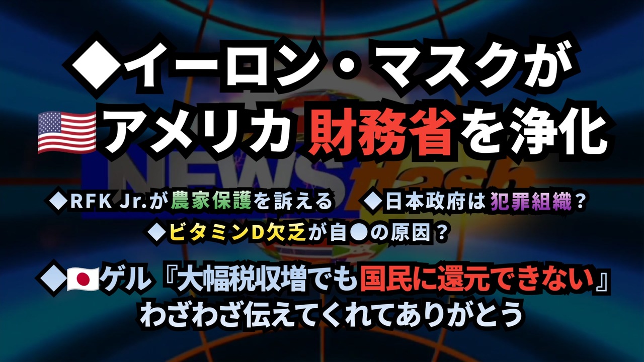 ◆日本政府が犯罪組織?<br>毛利秀徳の主張 <a href="https://x.com/mourihidenori/status/1885864857662357820?t=_ESI-WCU3OBbcF8bys0FZw&s=19" target="_blank" rel="noopener nofollow">https://x.com/mourihidenori/status/1885864857662357820?t=_ESI-WCU3OBbcF8bys0FZw&s=19</a><br><br><br>◆石破首相「大幅な税収増だけど国民に還元は出来ない」<br><a href="https://x.com/himuro398/status/1886347278794801510?t=XBXaaNPCPaQZMgiM0DgEjA&s=19" target="_blank" rel="noopener nofollow">https://x.com/himuro398/status/1886347278794801510?t=XBXaaNPCPaQZMgiM0DgEjA&s=19</a><br><br><br>◆自民党議員落選運動<br><a href="https://x.com/jkyNK5VR8fV4KHO/status/1886357194666614851?t=D4Pe79_PdazOdtVmOQK1zQ&s=19" target="_blank" rel="noopener nofollow">https://x.com/jkyNK5VR8fV4KHO/status/1886357194666614851?t=D4Pe79_PdazOdtVmOQK1zQ&s=19</a><br><br><br>◆イーロン・マスクがアメリカ財務省を浄化 <a href="https://x.com/ikeTrump555/status/1886011915664810358?t=2miRmo87WWrCByShfJ_FZQ&s=19" target="_blank" rel="noopener nofollow">https://x.com/ikeTrump555/status/1886011915664810358?t=2miRmo87WWrCByShfJ_FZQ&s=19</a><br><br><br>◆イーロン・マスクのDOGEチームによる財務省監査詳細 <a href="https://x.com/i/grok/share/XDySrYyZM7CMXHFugWg6mUgcH" target="_blank" rel="noopener nofollow">https://x.com/i/grok/share/XDySrYyZM7CMXHFugWg6mUgcH</a><br><br><br>◆RFK Jr.が農家保護を訴える <a href="https://t.co/3O40PoL7p1" target="_blank" rel="noopener nofollow">https://t.co/3O40PoL7p1</a><br><br><br>◆ビタミンD欠乏が自殺の原因? <a href="https://x.com/jinpeiishii/status/1885831734786502718?t=NYIZCQNyKvH-xshjMD1CQw&s=19" target="_blank" rel="noopener nofollow">https://x.com/jinpeiishii/status/1885831734786502718?t=NYIZCQNyKvH-xshjMD1CQw&s=19</a><br><br><br>日本政府<br>毛利秀徳<br>大幅税収増でも国民に還元できない<br>イーロン・マスク<br>財務省<br>DOGE<br>農家保護<br>ロバート・ケネディ・ジュニア<br>ビタミンD<br>自殺防止<br>うつ病<br><br><br />著作権、肖像権に配慮して作成しております。<br><br>◆気になったニュースの台本!?<br>メモ代わりに作った台本をそのままあげてます<br><a href="https://keiichiro8140.hatenablog.com/." target="_blank" rel="noopener nofollow">https://keiichiro8140.hatenablog.com/.</a><br><br><br>ここからはシリーズ紹介<br><br><br>◆ ワクチン解毒・デトックス<br><a href="https://x.gd/fZweg" target="_blank" rel="noopener nofollow">https://x.gd/fZweg</a><br><br>◆ウイリアム・マキス博士のがん治療(イベルメクチン・フェンベンダゾール等)<br><a href="https://x.gd/AtFYS" target="_blank" rel="noopener nofollow">https://x.gd/AtFYS</a><br><br>◆予防接種健康被害救済制度<br><a href="https://x.gd/0xK9x" target="_blank" rel="noopener nofollow">https://x.gd/0xK9x</a><br><br>◆気になったニュース #1501~<br><br>◆ 【ショートver】気になったニュース<br><a href="https://x.gd/7MxXC" target="_blank" rel="noopener nofollow">https://x.gd/7MxXC</a><br><br>◆ 気になったニュース #1001~<br><a href="https://x.gd/Lp8gv" target="_blank" rel="noopener nofollow">https://x.gd/Lp8gv</a><br><br>◆ 気になったニュース #501~<br><a href="https://x.gd/EmbS4" target="_blank" rel="noopener nofollow">https://x.gd/EmbS4</a><br><br>◆ 気になったニュース #1~#500<br><a href="https://x.gd/uPhNb" target="_blank" rel="noopener nofollow">https://x.gd/uPhNb</a><br><br>◆ X(旧Twitter)・テレグラムで気になった情報<br><a href="https://x.gd/YG6FT" target="_blank" rel="noopener nofollow">https://x.gd/YG6FT</a><br><br>◆ 日比谷5万人パレードデ⚪生放送アーカイブ動画<br><a href="https://x.gd/3CHJv" target="_blank" rel="noopener nofollow">https://x.gd/3CHJv</a><br><br>◆日比谷5万人パレード⚪モのマイリスト作ってみました<br><a href="https://nico.ms/mylist/76828848?ref=sp_other" target="_blank" rel="noopener nofollow">https://nico.ms/mylist/76828848?ref=sp_other</a><br><br>◆3.30 令和の百姓⚪⚪<br><a href="https://www.nicovideo.jp/series/511791?ref=garage_share_other" target="_blank" rel="noopener nofollow">https://www.nicovideo.jp/series/511791?ref=garage_share_other</a><br><br>◆ 及川幸久さんの【XNEWS】シリーズ<br><a href="https://x.gd/3k78K" target="_blank" rel="noopener nofollow">https://x.gd/3k78K</a><br><br>◆これまでの動画<a href="https://x.gd/sPXoJ" target="_blank" rel="noopener nofollow">https://x.gd/sPXoJ</a><br><br>◆もしも(BAN)の時のためのマイリンク集<a href="https://lit.link/K-16_News44" target="_blank" rel="noopener nofollow">https://lit.link/K-16_News44</a><br><br>
