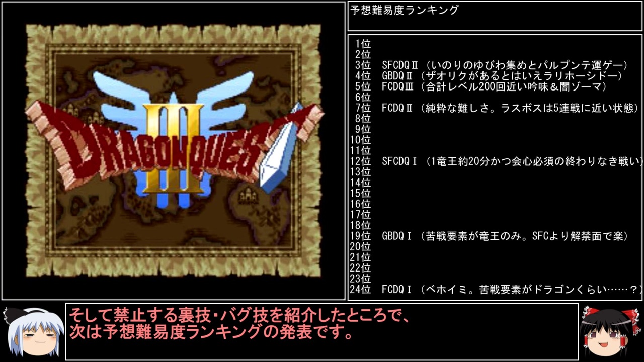 DQⅢの2周目、SFCDQⅢ編part1です。<br>撮り溜めのため1年間休んだ原因の冒険が今、ついに始まります。<br><br>前→<a href="https://www.nicovideo.jp/watch/sm44591711" class="watch">sm44591711</a><br>次→<a href="https://www.nicovideo.jp/watch/sm44644653" class="watch">sm44644653</a><br><br>YouTube版→<a href="https://youtu.be/wG398E5Ulwg" target="_blank" rel="noopener nofollow">https://youtu.be/wG398E5Ulwg</a><br><br>縛りルール(詳細はpart1参照)<br>①一度使った武器・防具・装飾品・道具・呪文・特技は<br> 次作品以降使用禁止。(売却も解禁扱い)<br><br> 一度使った職業(3,6,7)・仲間モンスター(5,6)・スカウトモンスター(8)は<br> 戦士(Ⅲ)、戦士(Ⅵ)のようにナンバリングで分類し次作品以降使用禁止。<br> また複数体加入できる仲間モンスターは一体まで。<br><br>②裏技、バグ技、全滅、逃走、おどかす禁止。<br> またダンジョン攻略とボス戦における状況再現禁止。<br><br>③ダンジョンとボス攻略は、全キャラのレベルを突入時、<br> 1周目は目標レベル+5。2周目は+10。3周目は+15まで。<br> ラスボスの目標レベルは45。裏ボスは50とする。<br>(目標レベルは各公式ガイドブックを参照)<br><br>④1周目はEDまで。2周目は裏ボス撃破まで。<br> 3周目は全てのボスを規定回数、規定ターン以内に倒す。<br>(回避可能なボスも倒し、闇ゾーマは3周全てで倒す)<br><br><br><span style="color: #262626;">※一部機種は互換機を使用してのプレイとなりますが、倍速機能やクイックセーブ・ロード、チートなどは一切使用しません。</span><br><br>※ネタバレ注意です<br><br>この動画で利用している株式会社スクウェア・エニックスを代表とする共同著作者が権利を所有する著作物及びスギヤマ工房有限会社が権利を所有する楽曲の転載・配布は禁止いたします。<br>(C) ARMOR PROJECT/BIRD STUDIO/SQUARE ENIX All Rights Reserved.<br>(C) SUGIYAMA KOBO (P) SUGIYAMA KOBO<br><br>AquesTalk2ライセンスID:AQTK2WINUSR23122185<br /><br><br>❤いいねを押していただけるとモチベーションと投稿速度が上がるので宜しくお願い致します!<br><br>作者ツイッター→ <a href="https://twitter.com/nig0117" target="_blank" rel="noopener nofollow">https://twitter.com/nig0117</a><br>PIXIV FANBOX→ <a href="https://sutanokeiji.fanbox.cc/" target="_blank" rel="noopener nofollow">https://sutanokeiji.fanbox.cc/</a><br><br>( 以前はWEB小説書いてました→ <a href="https://kakuyomu.jp/works/1177354054884910267" target="_blank" rel="noopener nofollow">https://kakuyomu.jp/works/1177354054884910267</a> )