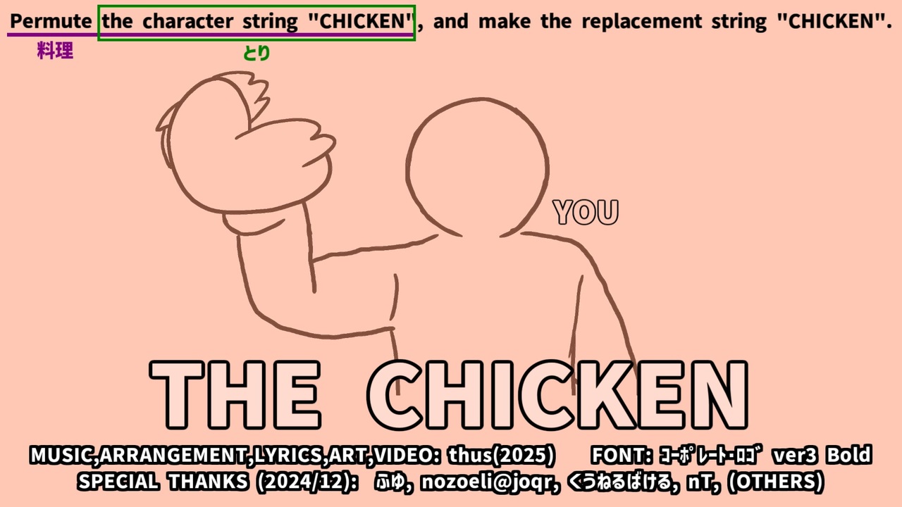 ◆「とり料理祭2025冬」出展作品です(詳細:<a href="https://www.nicovideo.jp/watch/sm44175581" class="watch">sm44175581</a> )<br>・開催日時:2025/02/07-09<br>・主催:ちきんすてーき(<a href="https://www.nicovideo.jp/user/311366" target="_blank" rel="noopener">user/311366</a> )<br>・「とり」:「CHICKEN」という文字列|the character string "CHICKEN"<br>・「料理」:文字列「CHICKEN」の置換(並替え)|Permute the character string "CHICKEN"<br>―<br><br> Let's make the CHICKEN.(カラオケ:<a href="https://www.nicovideo.jp/watch/sm44612290" class="watch">sm44612290</a> )<br> Though the collapse of shittificated Fu**-TV (Oops) is the talk of society these days, but you can learn how to make CHICKEN in this TV program anyway. It's so wonderful, excellent and brilliant that you'll not only feel like making CHICKEN but also cannot stop making CHICKEN, like withdrawal symptoms. Don't be afraid of CHICKEN. Let's accept CHICKEN, and you can get more fortune and finally become GOD.<br><br> ルールの隙間を擦り抜けるような作品でごめんなさい。<br> 頑張って英語を書いてみました。どうでしょうか。大した事は書いてないので、読まなくても問題ございません。つまり何の意味もないですが、其が良いのです。だから皆さん、竹になりましょう。台風が来ても大雨が来ても絶対に負けない様な強い根を持つのです。お米を食べればきっとできます。蜆でも良いですが、その辺りは自由です。<br> (おっと、今回はCHICKENだから変な事を言ったら番組プロデューサーに殺される)やっぱり気が変わったので、お米も蜆も食べちゃダメです。CHICKENしか許しません。<br> 茲で結構な時間、次の文章を考えたのですが何も思いつきませんでした。反省の為に、富士山に登って太陽に祈りを捧げましょう。何故なら貴方は太陽だから、そして今日から貴方が富士山だからです。月牙になっても良いですが、それは俺自身が月牙になるって事なので、多分色々違います。違うというかお勧めしません。霊王になりたいなら、止めはしませんが…。<br><br>2025/02/09 01:57:2,525再生<br /><br><br><br>====================<br>| 2026/01/04 21:00「インスペクタの自死未遂」:<a href="https://www.nicovideo.jp/watch/sm45800854" class="watch">sm45800854</a><br>| 投稿曲マイリスト:<a href="https://www.nicovideo.jp/mylist/57867175" target="_blank" rel="noopener">mylist/57867175</a><br>|――――――――――――――――――<br>| pixivFANBOX:<a href="https://thus.fanbox.cc/" target="_blank" rel="noopener nofollow">https://thus.fanbox.cc/</a><br>| アルバム等配信中:<a href="https://thus-library.blogspot.com/search/label/discography" target="_blank" rel="noopener nofollow">https://thus-library.blogspot.com/search/label/discography</a><br>| つなぐ(依頼・リクエスト):<a href="https://tsunagu.cloud/users/thus" target="_blank" rel="noopener nofollow">https://tsunagu.cloud/users/thus</a><br>|――――――――――――――――――<br>| YouTube:<a href="https://youtube.com/@thus" target="_blank" rel="noopener nofollow">https://youtube.com/@thus</a><br>| X:<a href="https://x.com/thus_submission" target="_blank" rel="noopener nofollow">https://x.com/thus_submission</a><br>| 他全リンク:<a href="https://lit.link/thus" target="_blank" rel="noopener nofollow">https://lit.link/thus</a><br>|――――――――――――――――――<br>| オフボーカル等:<a href="https://piapro.jp/thus_999discommunication" target="_blank" rel="noopener nofollow">https://piapro.jp/thus_999discommunication</a><br>| 楽曲/動画の二次利用に関して:<a href="https://bit.ly/3JRQQiZ" target="_blank" rel="noopener nofollow">https://bit.ly/3JRQQiZ</a><br><span style="color: #262626;">| </span><span style="color: #262626;"><strong>歌詞図書館(ふりがな有るよ!):</strong></span><a href="https://thus-library.blogspot.com/" target="_blank" rel="noopener nofollow">https://thus-library.blogspot.com/</a><br>====================