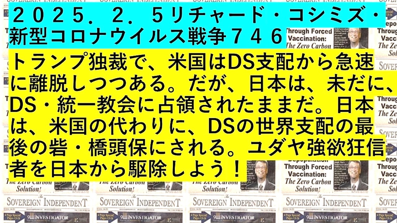 <span style="color: #ff0000;"><strong> </strong></span><span style="color: #cc0000;"><strong>◐【 テーマ : 新型コロナウイルス戦争⦅ 746 ⦆】</strong></span><br><br> <span style="color: #ff0000;"><strong>「『 ドナルド・トランプ独裁 』で、『 米国 』は『 DEEP STATE 支配 』から『 急速 』に『 離脱 』しつつある。<br> だが、『 日本 』は、『 未だ 』に、『 DEEP STATE 』・『 統一教会 』に『 占領 』されたままだ。<br> 『 日本 』は、『 米国 』の代わりに、『 DEEP STATE 』の『 世界支配 』の『 最後の砦 』・『 橋頭保 』にされる。<br> 『 ユダヤ強欲狂信者 』を『 日本 』から『 駆除 』しよう! 」</strong></span><br><br> <span style="color: #38761d;"><strong>◐『 リチャード・コシミズ・チャンネル⦅ ニコニコ チャンネル ⦆』</strong></span><br> <span style="color: #0000ff;"><strong><a href="https://ch.nicovideo.jp/richardkoshimizu" target="_blank" rel="noopener nofollow">https://ch.nicovideo.jp/richardkoshimizu</a></strong></span><br><br> <span style="color: #38761d;"><strong>◐『 リチャード・コシミズ「 ニコニコ生放送⦅ LIVE ⦆」』</strong></span><br> <span style="color: #0000ff;"><strong><a href="https://www.nicovideo.jp/user/120930363/live_programs" target="_blank" rel="noopener nofollow">https://www.nicovideo.jp/user/120930363/live_programs</a></strong></span><br><br> <span style="color: #38761d;"><strong>◐『 リチャード・コシミズ「 Rumble 」公式「 動画ギャラリー 」』</strong></span><br> <span style="color: #0000ff;"><strong><a href="https://rumble.com/user/richardkoshimizu" target="_blank" rel="noopener nofollow">https://rumble.com/user/richardkoshimizu</a></strong></span><br> <span style="color: #0000ff;"><strong><a href="https://rumble.com/user/RKVideoGallery" target="_blank" rel="noopener nofollow">https://rumble.com/user/RKVideoGallery</a></strong></span><br><br>