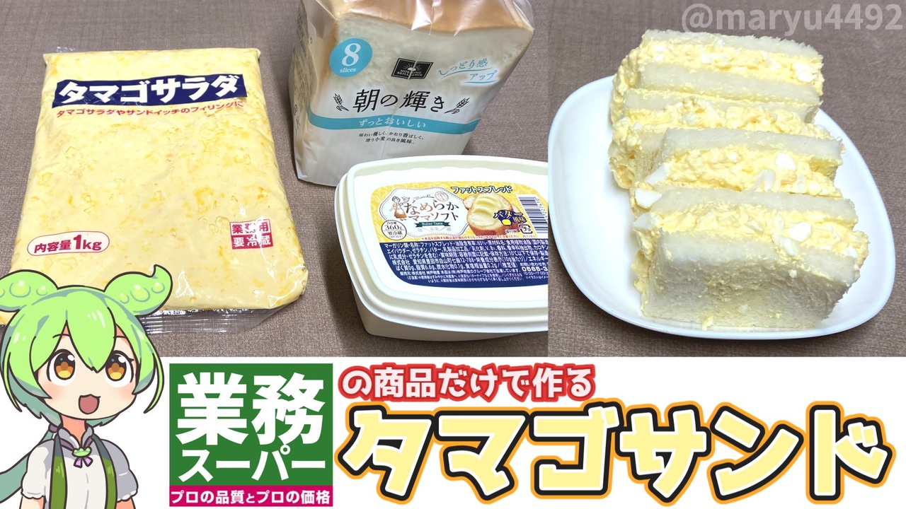 業務スーパーで買ったタマゴサラダ、食パン、マーガリンで <br>タマゴダンドを作ります。 <br><br><br>【関連動画】 <br>業務スーパーの「牛乳パックに入ったデザート」2023.09.28 <br><a href="https://www.nicovideo.jp/watch/sm42790118" target="_blank" rel="noopener nofollow">https://www.nicovideo.jp/watch/sm42790118</a><br>トップバリュの赤いヤツや黄色いヤツで作る『山盛りサンドイッチ』2023.03.07 <br><a href="https://www.nicovideo.jp/watch/sm41895748" target="_blank" rel="noopener nofollow">https://www.nicovideo.jp/watch/sm41895748</a><br><br>【参考】 <br>タマゴサラダ ※購入金額768円/1kg(ケンコーマヨネーズ) <br><a href="https://www.kenkomayo.com/pro/r/r1014/" target="_blank" rel="noopener nofollow">https://www.kenkomayo.com/pro/r/r1014/</a> <br>なめらかママソフト(バター風味) 360g ※購入金額198円(業務スーパー) <br><a href="https://www.gyomusuper.jp/onlineshop/products/detail/7108" target="_blank" rel="noopener nofollow">https://www.gyomusuper.jp/onlineshop/products/detail/7108</a> <br>株式会社オイシス ※食パン88円/1袋 <br><a href="https://oisis.co.jp/" target="_blank" rel="noopener nofollow">https://oisis.co.jp/</a><br><br>【使用した素材】(※敬称略) <br>(合成音声)VOICEVOX/ずんだもん/四国めたん<br> <a href="https://voicevox.hiroshiba.jp/" target="_blank" rel="noopener nofollow">https://voicevox.hiroshiba.jp/</a> <br>(立ち絵1)坂本アヒル <br><a href="https://seiga.nicovideo.jp/seiga/im10788496?track" target="_blank" rel="noopener nofollow">https://seiga.nicovideo.jp/seiga/im10788496?track</a> <br>(楽曲)甘茶の音楽工房/「楽しい麦畑」「フルーツパフェ」「お城の舞踏会」 <br><a href="https://amachamusic.chagasi.co" target="_blank" rel="noopener nofollow">https://amachamusic.chagasi.co</a><br>