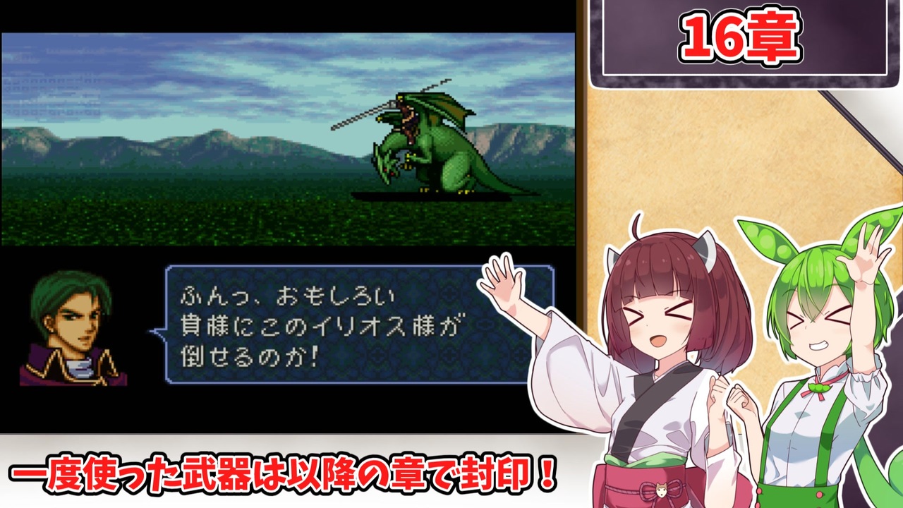 <span style="color: #85200c; font-size: 24px;"><strong><i>「あなたの貴族コンプレックスはその名前のせいね」<br>「変えた方がいいと思うわ」<br>「イリオスじゃなくてオルソンにしなさいよ」</i></strong></span><br><br><span style="color: #85200c; font-size: 16px;"><strong><i>…後の作品でこの名前のユニットが本当に登場することになるのであった</i></strong></span><br><br><br><br><span style="font-size: 16px;"><strong>1:一度使用した武器種は、以降の章で使用する事を禁止する。<br>2:武器の使用の定義は『その武器を装備した状態で敵との戦闘が発生したタイミング』<br>または『その武器を使って敵に「捕える」コマンドを実行したタイミング』<br>杖の場合は『対象に対して使用した時点(命中の可否は問わない)』とする。 </strong></span><br><span style="color: #ff0000; font-size: 16px;"><strong>※同盟軍、演出による戦闘イベントでは使用した判定にはならないこととする。</strong></span><span style="font-size: 16px;"><strong> <br>3:仲間を47人生存させ、【外伝】を含む全ての章を攻略し、総合評価でB以上の状態でゲームをクリアする。</strong></span><br><br><br>本動画のシリーズリスト【<a href="https://www.nicovideo.jp/series/482976" target="_blank" rel="noopener">series/482976</a>】<br>『烈火』の同縛りプレイ【<a href="https://www.nicovideo.jp/series/406473" target="_blank" rel="noopener">series/406473</a>】<br>『封印』の同縛りプレイ【<a href="https://www.nicovideo.jp/series/316824" target="_blank" rel="noopener">series/316824</a>】<br>前:【<a href="https://www.nicovideo.jp/watch/sm44582725" class="watch">sm44582725</a>】次:【<a href="https://www.nicovideo.jp/watch/sm44649444" class="watch">sm44649444</a>】<br><br><strong>使用したソフト</strong><br>VOICEROID+東北きりたんEX<br>VOICEVOX:ずんだもん<br>VOICEPEA:ずんだもん<br><strong>お借りした素材</strong><br>ニコニコモンズの皆様(コンテンツツリー参照)
