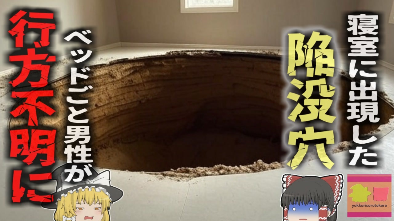 <a href="#" class="seekTime" data-seekTime="00:07" onclick="seekNicoPlayer('#00:07'); return false;">#00:07</a> 深夜の衝撃と爆音<br><a href="#" class="seekTime" data-seekTime="00:54" onclick="seekNicoPlayer('#00:54'); return false;">#00:54</a> 助けを呼ぶ兄の声<br><a href="#" class="seekTime" data-seekTime="1:18" onclick="seekNicoPlayer('#1:18'); return false;">#1:18</a> ベッドごと飲み込んだ陥没穴<br><a href="#" class="seekTime" data-seekTime="2:04" onclick="seekNicoPlayer('#2:04'); return false;">#2:04</a> 危険な救出作業<br><a href="#" class="seekTime" data-seekTime="3:25" onclick="seekNicoPlayer('#3:25'); return false;">#3:25</a> Aさんは恐らく…<br><a href="#" class="seekTime" data-seekTime="4:43" onclick="seekNicoPlayer('#4:43'); return false;">#4:43</a> 家も取り壊される<br><a href="#" class="seekTime" data-seekTime="5:21" onclick="seekNicoPlayer('#5:21'); return false;">#5:21</a> フロリダの地盤事情<br><br>引用・出展・参考文献(視聴者提供資料など<br>Support the Guardian<br><a href="https://ishort.ink/Y8g3" target="_blank" rel="noopener nofollow">https://ishort.ink/Y8g3</a><br>indy100<br><a href="https://ishort.ink/fzaQ" target="_blank" rel="noopener nofollow">https://ishort.ink/fzaQ</a><br>LAD BIBLE<br><a href="https://ishort.ink/g9hE" target="_blank" rel="noopener nofollow">https://ishort.ink/g9hE</a><br>Florida Man Believed Dead After Falling into Sinkhole(YouTube)<br><a href="https://ishort.ink/9ciX" target="_blank" rel="noopener nofollow">https://ishort.ink/9ciX</a><br><br />※この動画は過去の事件を知り、現在でも同じことが発生する危険性を再認識、関与しないように促すための動画であり、視聴者を扇動、動揺を誘うためのコンテンツではありません。<br><br>ご要望にお応えして、メンバーシップの開設を行いました。<br>下記URLからも登録可能ですので、ご興味がある方は是非ご参加ください。<br><a href="https://www.youtube.com/channel/UCcT5a1J7XJW7CLYI2RKl4pw/join" target="_blank" rel="noopener nofollow">https://www.youtube.com/channel/UCcT5a1J7XJW7CLYI2RKl4pw/join</a><br><br><br>Twitter<br>→<a href="https://twitter.com/yukkurisurutoko" target="_blank" rel="noopener nofollow">https://twitter.com/yukkurisurutoko</a><br><br>取り急ぎ、簡易的にですがマイリストを作りました。<br>【ゆっくり解説】事故・事件関係紹介リスト <br><a href="https://www.nicovideo.jp/mylist/71034319" target="_blank" rel="noopener nofollow">https://www.nicovideo.jp/mylist/71034319</a><br>【ゆっくり解説】放射線系事故<br><a href="https://www.nicovideo.jp/mylist/71034368" target="_blank" rel="noopener nofollow">https://www.nicovideo.jp/mylist/71034368</a><br>【ゆっくり解説】鉄道系事故・事件関連<br><a href="https://www.nicovideo.jp/mylist/71034379" target="_blank" rel="noopener nofollow">https://www.nicovideo.jp/mylist/71034379</a>