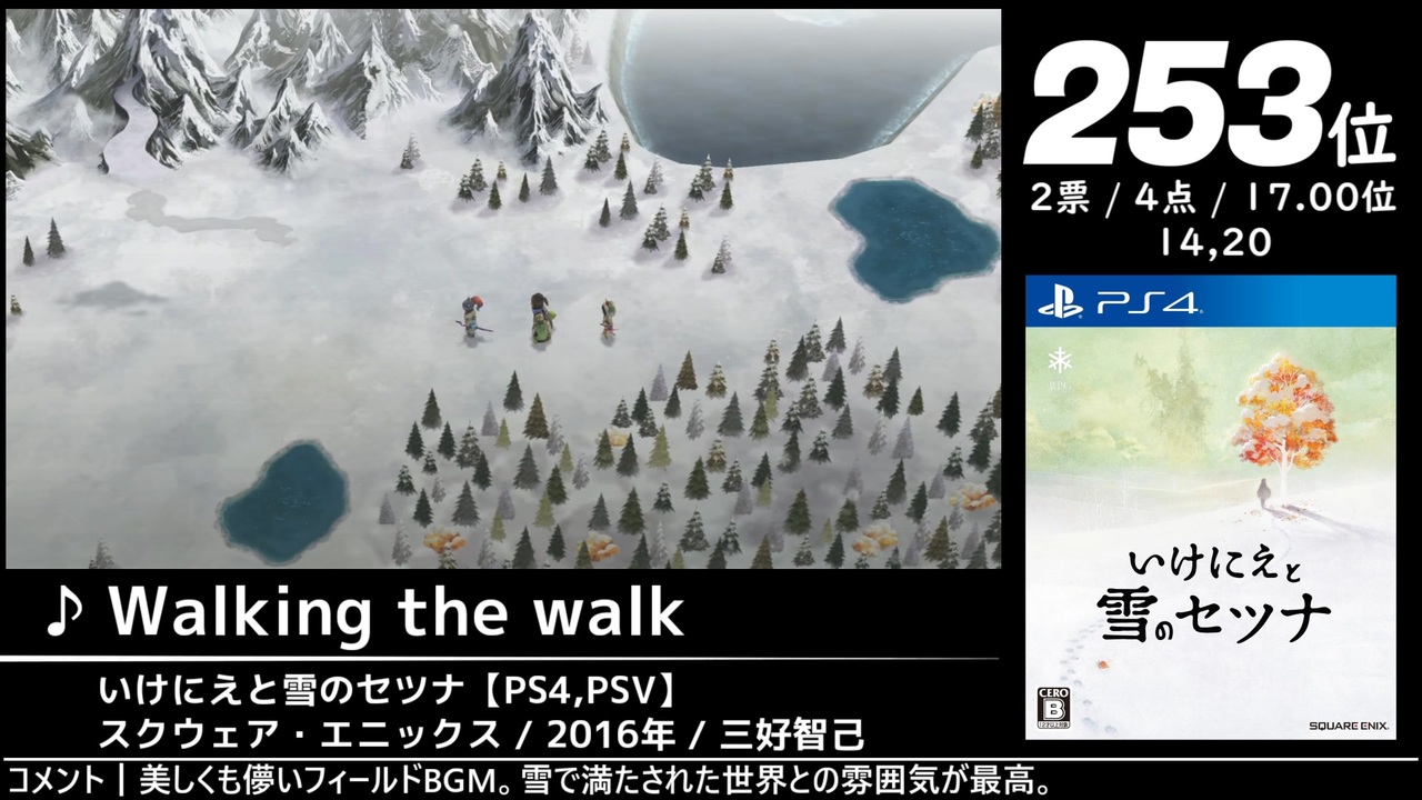 260位~232位の29曲を収録しています。<br>2024年11月1日~2025年1月3日にかけて開催された「第3回みんなで掘り出すゲーム音楽ベスト100」の結果を動画化したものです。<span style="font-size: 10px;">集計人≠動画制作者</span><br> <br> <br>↓全体の結果はこちら↓<br> <a href="https://w.atwiki.jp/gamemusicbest100/pages/10781.html" target="_blank" rel="noopener nofollow">https://w.atwiki.jp/gamemusicbest100/pages/10781.html</a><br> <br> <br>【投票者コメントについて】<br>原則としてすべてのコメントを掲載するつもりですが、一部のものは独断で省略させていただくことがあります。ご了承ください。<br> <br> <br>Part.2→<a href="https://www.nicovideo.jp/watch/sm44598356" class="watch">sm44598356</a><br>Part.4→<a href="https://www.nicovideo.jp/watch/sm44645774" class="watch">sm44645774</a><br>第3回掘り出しまとめ→<a href="https://www.nicovideo.jp/mylist/77530184" target="_blank" rel="noopener">mylist/77530184</a><br> <br> <br>【ショートカット】<br>①<a href="#" class="seekTime" data-seekTime="0:35" onclick="seekNicoPlayer('#0:35'); return false;">#0:35</a> / ②<a href="#" class="seekTime" data-seekTime="3:27" onclick="seekNicoPlayer('#3:27'); return false;">#3:27</a> / ③<a href="#" class="seekTime" data-seekTime="5:36" onclick="seekNicoPlayer('#5:36'); return false;">#5:36</a> / ④<a href="#" class="seekTime" data-seekTime="9:02" onclick="seekNicoPlayer('#9:02'); return false;">#9:02</a> / ⑤<a href="#" class="seekTime" data-seekTime="13:58" onclick="seekNicoPlayer('#13:58'); return false;">#13:58</a> / ⑥ <a href="#" class="seekTime" data-seekTime="16:37" onclick="seekNicoPlayer('#16:37'); return false;">#16:37</a> / ⑦<a href="#" class="seekTime" data-seekTime="19:44" onclick="seekNicoPlayer('#19:44'); return false;">#19:44</a> / ⑧<a href="#" class="seekTime" data-seekTime="20:54" onclick="seekNicoPlayer('#20:54'); return false;">#20:54</a> / ⑨<a href="#" class="seekTime" data-seekTime="23:27" onclick="seekNicoPlayer('#23:27'); return false;">#23:27</a> / ⑩<a href="#" class="seekTime" data-seekTime="25:58" onclick="seekNicoPlayer('#25:58'); return false;">#25:58</a> / ⑪<a href="#" class="seekTime" data-seekTime="28:32" onclick="seekNicoPlayer('#28:32'); return false;">#28:32</a> / ⑫<a href="#" class="seekTime" data-seekTime="30:57" onclick="seekNicoPlayer('#30:57'); return false;">#30:57</a> / ⑬<a href="#" class="seekTime" data-seekTime="33:27" onclick="seekNicoPlayer('#33:27'); return false;">#33:27</a> / ⑭<a href="#" class="seekTime" data-seekTime="36:10" onclick="seekNicoPlayer('#36:10'); return false;">#36:10</a> / ⑮<a href="#" class="seekTime" data-seekTime="38:20" onclick="seekNicoPlayer('#38:20'); return false;">#38:20</a> / ⑯<a href="#" class="seekTime" data-seekTime="41:06" onclick="seekNicoPlayer('#41:06'); return false;">#41:06</a> / ⑰<a href="#" class="seekTime" data-seekTime="43:45" onclick="seekNicoPlayer('#43:45'); return false;">#43:45</a> / ⑱<a href="#" class="seekTime" data-seekTime="46:33" onclick="seekNicoPlayer('#46:33'); return false;">#46:33</a> / ⑲<a href="#" class="seekTime" data-seekTime="49:38" onclick="seekNicoPlayer('#49:38'); return false;">#49:38</a> / ⑳<a href="#" class="seekTime" data-seekTime="52:14" onclick="seekNicoPlayer('#52:14'); return false;">#52:14</a> / ㉑<a href="#" class="seekTime" data-seekTime="55:50" onclick="seekNicoPlayer('#55:50'); return false;">#55:50</a> / ㉒<a href="#" class="seekTime" data-seekTime="60:26" onclick="seekNicoPlayer('#60:26'); return false;">#60:26</a> / ㉓<a href="#" class="seekTime" data-seekTime="63:33" onclick="seekNicoPlayer('#63:33'); return false;">#63:33</a> / ㉔<a href="#" class="seekTime" data-seekTime="65:47" onclick="seekNicoPlayer('#65:47'); return false;">#65:47</a> / ㉕<a href="#" class="seekTime" data-seekTime="68:12" onclick="seekNicoPlayer('#68:12'); return false;">#68:12</a> / ㉖<a href="#" class="seekTime" data-seekTime="71:15" onclick="seekNicoPlayer('#71:15'); return false;">#71:15</a> / ㉗<a href="#" class="seekTime" data-seekTime="74:20" onclick="seekNicoPlayer('#74:20'); return false;">#74:20</a> / ㉘<a href="#" class="seekTime" data-seekTime="76:53" onclick="seekNicoPlayer('#76:53'); return false;">#76:53</a> / ㉙<a href="#" class="seekTime" data-seekTime="79:40" onclick="seekNicoPlayer('#79:40'); return false;">#79:40</a>