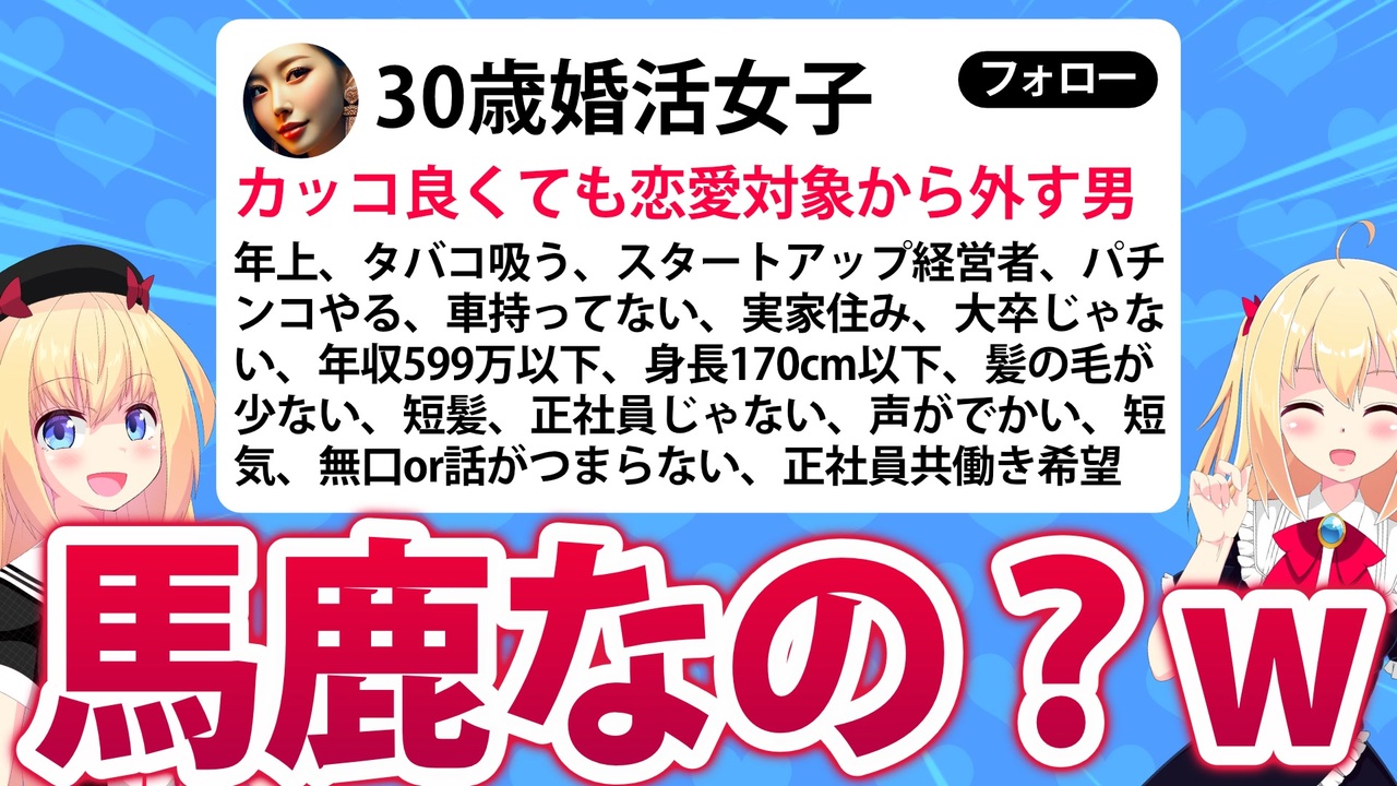 30歳婚活女子「カッコ良くても恋愛対象から外す男」→大炎上へwww 7:01