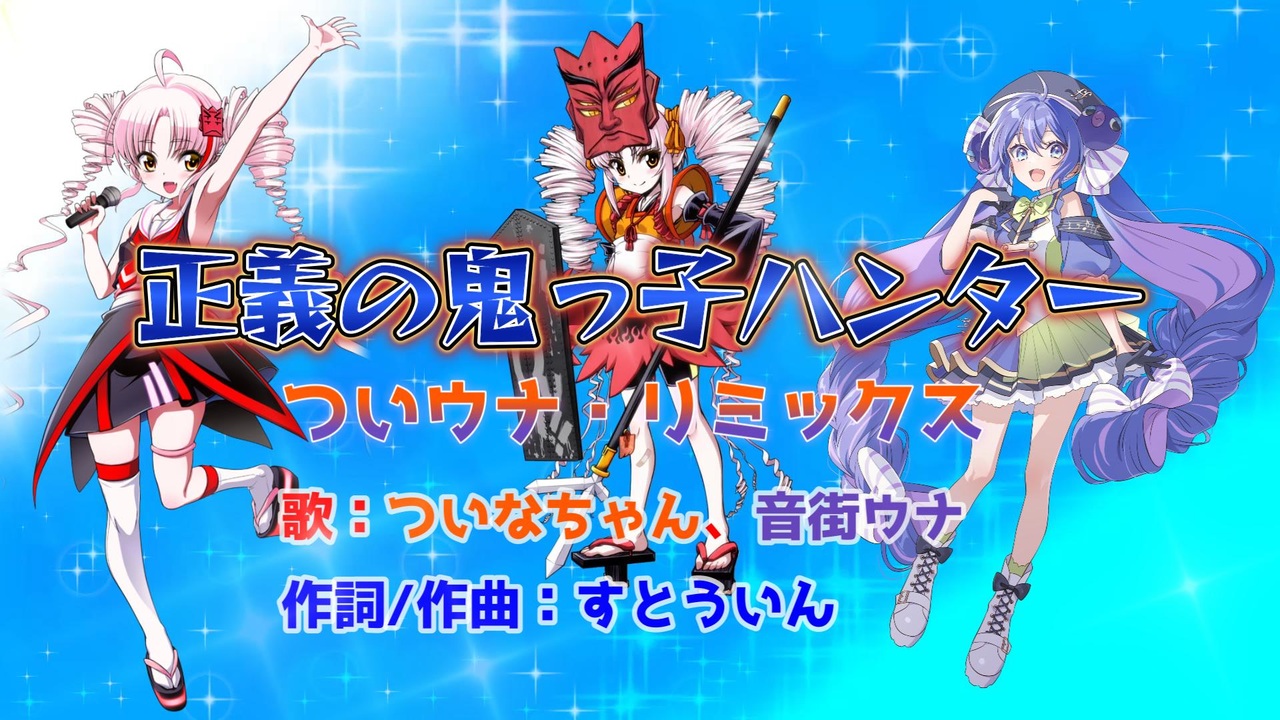 ついなちゃん誕生祭2025の参加作品です!<br>ついなちゃんお誕生日おめでとうございます!<br>2023年2月「ついなちゃんボイドラ主題歌EDコンテスト」に応募した楽曲<br>「正義の鬼っ子ハンター」のついなちゃんと音街ウナちゃんのデュエットによるリミックス版になります。<br>Synthesizer Vの音街ウナちゃんをお迎えしたので、ついなちゃんのお祝いで、去年のGUMIちゃんに引き続き今年は、公式でも仲がよい、ついなちゃんと音街ウナちゃんにSynthesizer Vデュエットをしてもらいました!<br><br>原作:鬼っ子ハンターついなちゃん 大辺璃紗季 様<br>歌詞作成参考 ついなちゃん公式ホームページ ついなちゃん設定より<br><a href="https://xn--n8jychz0k1d.com/" target="_blank" rel="noopener nofollow">https://xn--n8jychz0k1d.com/</a><br><br>作詞作曲:すとういん(Sutowin)<br>歌:ついなちゃん(SV)、音街ウナ(SV)<br>ついなちゃん立ち絵イラスト:ついなちゃん公式様<br>音街ウナ立ち絵イラスト:音街ウナ公式様<br>背景イラスト:とり<br><br>オフボーカル(カラオケ)版を所望される方いましたら、ピアプロからダウンロード可能です。<br>歌コレ、歌みたへの二次利用も可です。<br><a href="https://piapro.jp/t/LZfG" target="_blank" rel="noopener nofollow">https://piapro.jp/t/LZfG</a><br><br>歌詞<br><br>夕闇の街に忍び寄る<br>妖しい気配が湧いてくる<br>あの子の笑顔が消えるとき<br>きらりと光る三叉の矛が<br>額につけた方相面ディクソン<br>眼光輝け 方相閃・魔滅<br>平和のために、悪鬼を払え<br>正義の美少女方相氏<br>鬼っ子ハンターついなちゃん<br>ついなちゃん<br><br>夜更けの街に迫りくる<br>邪悪な気配が立ち込める<br>あの子の泣き顔見えたとき<br>闇を貫く三叉の矛が<br>神通力をほとばしらせ放つ<br>雷光閃け 方相閃・雷<br>人々のために、悪鬼を払え<br>正義の美少女方相氏<br>鬼っ子ハンターついなちゃん<br>ついなちゃん<br><br>闇深い街に現われる<br>恐怖の気配が溢れ出る<br>あの子の悲鳴があがるとき<br>唸りをあげる三叉の矛が<br>ツインドリルを風になびかせ<br>黄金に切り裂け 方相閃・斬<br>明日のために、悪鬼を払え<br>正義の美少女方相氏<br>鬼っ子ハンターついなちゃん<br>ついなちゃん