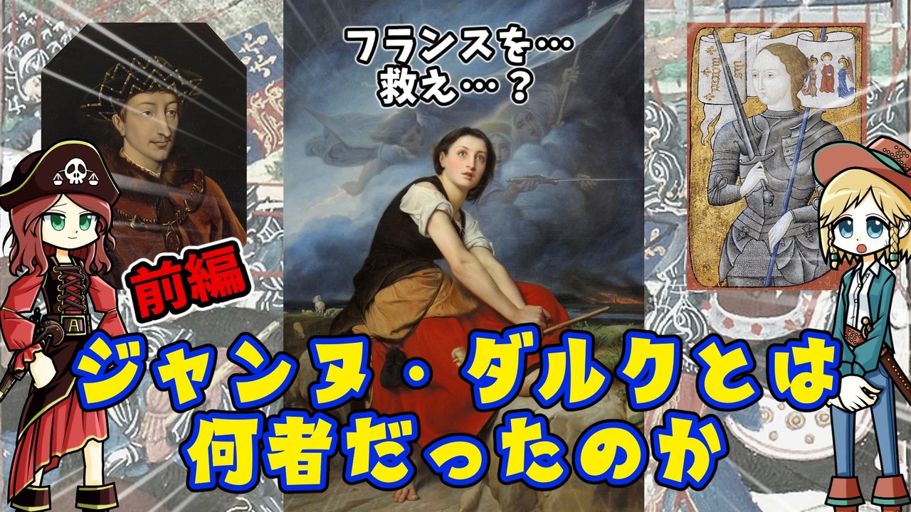 ジャンヌ・ダルクという人は有名ですが、彼女の人物像についてはどのくらいご存じでしょうか? <br>なんとなく謎めいている気がする彼女ですが、実は中世では珍しいくらい生の声や情報がたくさん残っている人でもあります。まあ異端裁判のおかげなのですが… <br>そんな彼女についての動画。いや内面について十分に語れてないのは前編だからじゃないですかね多分。 <br><br>前回の動画 →<a href="https://youtu.be/mTsSsMNiafQ" target="_blank" rel="noopener nofollow">https://youtu.be/mTsSsMNiafQ</a> <br>☆復活したニコニコチャンネル「モンド・ヒストリカの離宮」 →<a href="https://ch.nicovideo.jp/mond-historica" target="_blank" rel="noopener nofollow">https://ch.nicovideo.jp/mond-historica</a><br><br>今回の主要参考文献: <br>池上俊一(2023)『少女は、なぜフランスを救えたのか ジャンヌ・ダルクのオルレアン解放』NHK出版<br>加藤玄(2022)『ジャンヌ・ダルクと百年戦争 時空をこえて語り継がれる乙女』山川出版社<br>城戸毅(2010)『百年戦争 中世末期の英仏関係』刀水書房<br>佐藤猛(2020)『百年戦争 中世ヨーロッパ最後の戦い』中央公論新社<br><br>その他 Wikipediaなど<br />━━━━━━━━━━━━━━━━━━━━━<br><br>この動画はクリエイティブ・コモンズ継承(CC-BY-SA)ライセンスの素材を使用して制作しています。(<a href="https://creativecommons.org/licenses/by-sa/4.0/)" target="_blank" rel="noopener nofollow">https://creativecommons.org/licenses/by-sa/4.0/)</a><br>規約に基づき、この動画もCC-BY-SA 4.0 のもとで公開します。<br><br>投稿者共通情報☆彡<br><br>BGM, SE:ニコニ・コモンズ様<br><a href="http://commons.nicovideo.jp/" target="_blank" rel="noopener nofollow">http://commons.nicovideo.jp/</a><br>魔王魂様<br><a href="https://maoudamashii.jokersounds.com/" target="_blank" rel="noopener nofollow">https://maoudamashii.jokersounds.com/</a><br>Audiostock様<br><a href="https://audiostock.jp/" target="_blank" rel="noopener nofollow">https://audiostock.jp/</a><br><br>立ち絵 霊夢・魔理沙(黒子式):nicotalk様<br><a href="http://www.nicotalk.com/charasozai.html" target="_blank" rel="noopener nofollow">http://www.nicotalk.com/charasozai.html</a><br><br>立ち絵 パトラ、マリー、アン、メアリ:ライフライフ様<br><a href="https://0801lifelife.tumblr.com/" target="_blank" rel="noopener nofollow">https://0801lifelife.tumblr.com/</a><br><br>使用ツール1:ゆっくりムービーメーカー4<br><a href="https://manjubox.net/ymm4/" target="_blank" rel="noopener nofollow">https://manjubox.net/ymm4/</a><br><br>使用ツール2:AviUtl<br><a href="http://spring-fragrance.mints.ne.jp/aviutl/" target="_blank" rel="noopener nofollow">http://spring-fragrance.mints.ne.jp/aviutl/</a><br><br>各時代の地図 : World History Maps & Timelines <br><a href="http://geacron.com/home-en/" target="_blank" rel="noopener nofollow">http://geacron.com/home-en/</a><br><br>ゆっくりボイスについて:AquesTalkライセンス取得済み<br><br>キャラクターボイス<br>アン・ボニー:羽ノ華(A.I.VOICE)<br>メアリ・リード:琴葉 葵(A.I.VOICE)<br>クレオパトラ:結月ゆかり(VOICEROID2)<br>マリー‐アントワネット:東北きりたん (VOICEROID EX)<br>その他キャラ:青山龍星(A.I.VOICE)、伊織弓鶴(A.I.VOICE2)、栗田まろん(A.I.VOICE)、宮舞モカ(VOICEPEAK)、フリモメン(VOICEPEAK)<br><br><br><br>その他フリー素材ご提供元の皆様に圧倒的感謝<br>