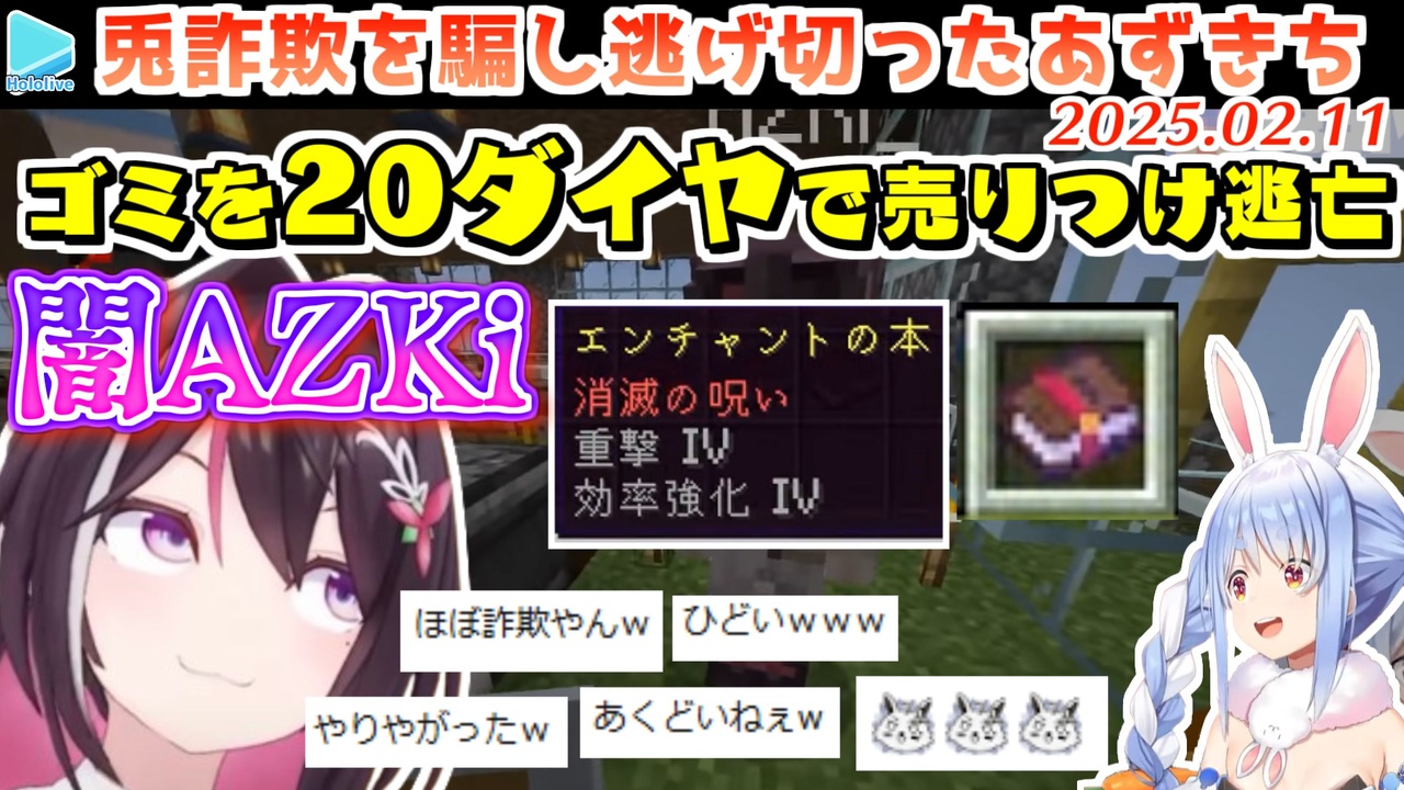 <a href="#" class="seekTime" data-seekTime="00:00" onclick="seekNicoPlayer('#00:00'); return false;">#00:00</a> 実はまだあった本をぺこらに売りに行く<br><a href="#" class="seekTime" data-seekTime="03:05" onclick="seekNicoPlayer('#03:05'); return false;">#03:05</a> 心痛みませんか?<br><a href="#" class="seekTime" data-seekTime="04:36" onclick="seekNicoPlayer('#04:36'); return false;">#04:36</a> 衝撃の事実<br><a href="#" class="seekTime" data-seekTime="05:21" onclick="seekNicoPlayer('#05:21'); return false;">#05:21</a> 天罰<br><a href="#" class="seekTime" data-seekTime="06:47" onclick="seekNicoPlayer('#06:47'); return false;">#06:47</a> ただでは転ばない兎<br><a href="#" class="seekTime" data-seekTime="09:37" onclick="seekNicoPlayer('#09:37'); return false;">#09:37</a> あずいろの良心ござる<br><a href="#" class="seekTime" data-seekTime="12:16" onclick="seekNicoPlayer('#12:16'); return false;">#12:16</a> エンチャ本を手に入れた経緯<br><br>元動画様はこちら<br>【Minecraft】新ホロ鯖なああああああああああああああああああああ!!!ぺこ!【ホロライブ/兎田ぺこら】<br><a href="https://youtu.be/ufiEcIbfi6A" target="_blank" rel="noopener nofollow">https://youtu.be/ufiEcIbfi6A</a><br><br>【Minecraft】新ホロ鯖にやってきた!文明開化、冒険したい!【ホロライブ / AZKi】2025/02/09<br><a href="https://youtu.be/iXNKBXF9jdk" target="_blank" rel="noopener nofollow">https://youtu.be/iXNKBXF9jdk</a><br><br>【Minecraft】新ホロ鯖にやってきた!トライアルチャンバーへ大冒険!【ホロライブ / AZKi】2025/02/10<br><a href="https://youtu.be/vsKctdakjIQ" target="_blank" rel="noopener nofollow">https://youtu.be/vsKctdakjIQ</a><br><br>【Minecraft】新ホロ鯖にやってきた!オークションする!!!!!【ホロライブ / AZKi】2025/02/11<br><a href="https://youtu.be/04hIEm8SiG0" target="_blank" rel="noopener nofollow">https://youtu.be/04hIEm8SiG0</a><br><br /><span style="color: #b7b7b7; font-size: 10px;">ホロライブ切り抜き/なめたけ <a href="https://t.co/CBwJLnYR2c" target="_blank" rel="noopener nofollow">https://t.co/CBwJLnYR2c</a></span>