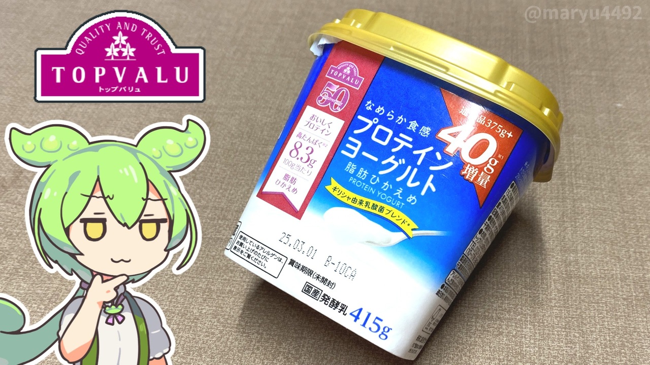今回はリクエストをもらった、トップバリュのプロテインヨーグルトを紹介します。 <br>低脂肪・高たんぱくとのことですが味はどうでしょうか? <br><br><br>【関連動画】 <br>【イオングループいいね大賞2025】トップバリュの赤いヤツ「はちみつヨーグルト(178円/400g)」2025.02.10<br><a href="https://www.nicovideo.jp/watch/sm44614748" target="_blank" rel="noopener nofollow">https://www.nicovideo.jp/watch/sm44614748</a><br><br>【参考】 <br>脂肪をひかえたプロテインヨーグルト※228円/415g(増量中)(トップバリュ) <br><a href="https://www.topvalu.net/items/detail/4549414546132/" target="_blank" rel="noopener nofollow">https://www.topvalu.net/items/detail/4549414546132/</a> <br>はちみつヨーグルト※本体価格178円/400g(トップバリュ) <br><a href="https://www.topvalu.net/items/detail/4549414162349/" target="_blank" rel="noopener nofollow">https://www.topvalu.net/items/detail/4549414162349/</a> <br>ビフィズスプレーンヨーグルト※本体価格148円/450g(トップバリュ) <br><a href="https://www.topvalu.net/items/detail/4549741650007/" target="_blank" rel="noopener nofollow">https://www.topvalu.net/items/detail/4549741650007/</a> <br>古谷乳業株式会社<br> <a href="https://furuya-milk.co.jp/" target="_blank" rel="noopener nofollow">https://furuya-milk.co.jp/</a><br><br>【使用した素材】(※敬称略) <br>(合成音声)VOICEVOX/ずんだもん/四国めたん<br> <a href="https://voicevox.hiroshiba.jp/" target="_blank" rel="noopener nofollow">https://voicevox.hiroshiba.jp/</a> <br>(立ち絵)坂本アヒル <br><a href="https://seiga.nicovideo.jp/seiga/im10788496?track" target="_blank" rel="noopener nofollow">https://seiga.nicovideo.jp/seiga/im10788496?track</a> <br>(楽曲)甘茶の音楽工房/「楽しい麦畑」「フルーツパフェ」「お城の舞踏会」<br> <a href="https://amachamusic.chagasi.co" target="_blank" rel="noopener nofollow">https://amachamusic.chagasi.co</a><br>