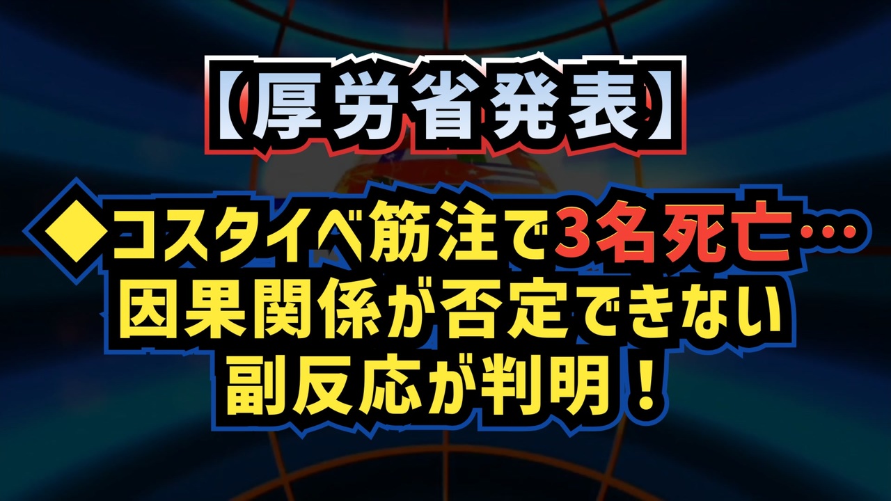 ◆コスタイベ筋注で3名死亡…因果関係が否定できない副反応が判明!【厚労省発表】 <a href="https://x.com/Trilliana_x/status/1891100709841403945?t=iqUP9KHK6X7b7dx5gIU7pQ&s=19" target="_blank" rel="noopener nofollow">https://x.com/Trilliana_x/status/1891100709841403945?t=iqUP9KHK6X7b7dx5gIU7pQ&s=19</a><br><br><br>◆2月14日公表。噂のレプリコンワクチン、3名死亡していることが判明。コスタイベ筋注(新型コロナワクチン)。<br><a href="https://jmaxnews.com/archives/676" target="_blank" rel="noopener nofollow">https://jmaxnews.com/archives/676</a><br><br><br>コスタイベ <br>レプリコンワクチン<br>Meiji Seika ファルマ<br>ワクチン接種後死亡<br>厚生労働省<br>mRNAワクチン<br>自己増幅型ワクチン<br>急性心筋梗塞<br>急性腎不全<br>急性肝不全<br>急性脳症<br>重度のアナフィラキシーショック<br><br><br />著作権、肖像権に配慮して作成しております。<br><br>◆気になったニュースの台本!?<br>メモ代わりに作った台本をそのままあげてます<br><a href="https://keiichiro8140.hatenablog.com/." target="_blank" rel="noopener nofollow">https://keiichiro8140.hatenablog.com/.</a><br><br><br>ここからはシリーズ紹介<br><br><br>◆ ワクチン解毒・デトックス<br><a href="https://x.gd/fZweg" target="_blank" rel="noopener nofollow">https://x.gd/fZweg</a><br><br>◆ウイリアム・マキス博士のがん治療(イベルメクチン・フェンベンダゾール等)<br><a href="https://x.gd/AtFYS" target="_blank" rel="noopener nofollow">https://x.gd/AtFYS</a><br><br>◆予防接種健康被害救済制度<br><a href="https://x.gd/0xK9x" target="_blank" rel="noopener nofollow">https://x.gd/0xK9x</a><br><br>◆気になったニュース #1501~<br><br>◆ 【ショートver】気になったニュース<br><a href="https://x.gd/7MxXC" target="_blank" rel="noopener nofollow">https://x.gd/7MxXC</a><br><br>◆ 気になったニュース #1001~<br><a href="https://x.gd/Lp8gv" target="_blank" rel="noopener nofollow">https://x.gd/Lp8gv</a><br><br>◆ 気になったニュース #501~<br><a href="https://x.gd/EmbS4" target="_blank" rel="noopener nofollow">https://x.gd/EmbS4</a><br><br>◆ 気になったニュース #1~#500<br><a href="https://x.gd/uPhNb" target="_blank" rel="noopener nofollow">https://x.gd/uPhNb</a><br><br>◆ X(旧Twitter)・テレグラムで気になった情報<br><a href="https://x.gd/YG6FT" target="_blank" rel="noopener nofollow">https://x.gd/YG6FT</a><br><br>◆ 日比谷5万人パレードデ⚪生放送アーカイブ動画<br><a href="https://x.gd/3CHJv" target="_blank" rel="noopener nofollow">https://x.gd/3CHJv</a><br><br>◆日比谷5万人パレード⚪モのマイリスト作ってみました<br><a href="https://nico.ms/mylist/76828848?ref=sp_other" target="_blank" rel="noopener nofollow">https://nico.ms/mylist/76828848?ref=sp_other</a><br><br>◆3.30 令和の百姓⚪⚪<br><a href="https://www.nicovideo.jp/series/511791?ref=garage_share_other" target="_blank" rel="noopener nofollow">https://www.nicovideo.jp/series/511791?ref=garage_share_other</a><br><br>◆ 及川幸久さんの【XNEWS】シリーズ<br><a href="https://x.gd/3k78K" target="_blank" rel="noopener nofollow">https://x.gd/3k78K</a><br><br>◆これまでの動画<a href="https://x.gd/sPXoJ" target="_blank" rel="noopener nofollow">https://x.gd/sPXoJ</a><br><br>◆もしも(BAN)の時のためのマイリンク集<a href="https://lit.link/K-16_News44" target="_blank" rel="noopener nofollow">https://lit.link/K-16_News44</a><br><br>