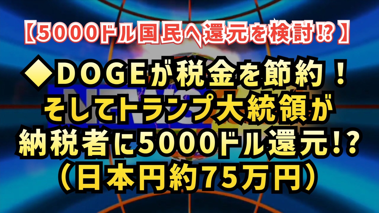 ◆税金を節約して、そのお金を国民に配ることを計画してるってその額5000ドル。(約75万円)<br>国民のための政治を身をもって示している。<br><a href="https://x.com/qryptraveller/status/1892209419338862651?t=6IAmUmqPe94TayeAqZTNFw&s=19" target="_blank" rel="noopener nofollow">https://x.com/qryptraveller/status/1892209419338862651?t=6IAmUmqPe94TayeAqZTNFw&s=19</a><br><br><br>◆Forbesの記事<br><a href="https://www.forbes.com/sites/mollybohannon/2025/02/18/musk-mulls-sending-all-americans-5000-checks-using-doge-savings/" target="_blank" rel="noopener nofollow">https://www.forbes.com/sites/mollybohannon/2025/02/18/musk-mulls-sending-all-americans-5000-checks-using-doge-savings/</a><br><br><br>◆ジェームズ・フィッシュバックさんのX(旧Twitter)投稿<br><a href="https://x.com/j_fishback/status/1891933120313663493?t=VFqo1hOuoHr7Txqxn0NWMw&s=19" target="_blank" rel="noopener nofollow">https://x.com/j_fishback/status/1891933120313663493?t=VFqo1hOuoHr7Txqxn0NWMw&s=19</a><br><br><br>◆InvestAzoriaのDOGE配当のPDFはこちら。<br><a href="https://x.com/j_fishback/status/1891933122746282418?t=wuDZgk-4RC_zMj35d1cPTg&s=19" target="_blank" rel="noopener nofollow">https://x.com/j_fishback/status/1891933122746282418?t=wuDZgk-4RC_zMj35d1cPTg&s=19</a><br><br><br>◆ DOGEが税金を節約!そしてトランプ大統領が納税者に5000ドル還元を検討! <a href="https://x.com/RealAlexJones/status/1892257680565088516?t=pDeNL7FexTsQrU3BX7ch0Q&s=19" target="_blank" rel="noopener nofollow">https://x.com/RealAlexJones/status/1892257680565088516?t=pDeNL7FexTsQrU3BX7ch0Q&s=19</a><br><br><br>◆ DOGE配当5000ドルは本当に実現するのか?SNSで話題沸騰! <a href="https://x.com/i/grok/share/ntek4OlZ1LFtVAIiLmuSCICP2" target="_blank" rel="noopener nofollow">https://x.com/i/grok/share/ntek4OlZ1LFtVAIiLmuSCICP2</a><br><br><br>◆ 4000億ドル節約→国民へ還元!?トランプ×マスクのDOGE配当計画! <a href="https://x.com/i/grok/share/sG9WA9ACT4NtzcZOibxdZhTRL" target="_blank" rel="noopener nofollow">https://x.com/i/grok/share/sG9WA9ACT4NtzcZOibxdZhTRL</a><br><br><br>◆Yahooニュースにも<br><a href="https://news.yahoo.co.jp/articles/561c1c9f9ae61e1e5ce31265b623e0813308964a" target="_blank" rel="noopener nofollow">https://news.yahoo.co.jp/articles/561c1c9f9ae61e1e5ce31265b623e0813308964a</a><br><br><br>DOGE配当金 トランプ大統領 イーロンマスク 政府効率化省 税金削減 5000ドル還元 アメリカ経済 グローバリスト一掃 ディープステート崩壊 政策改革 SNS話題<br><br><br />著作権、肖像権に配慮して作成しております。<br><br>◆気になったニュースの台本!?<br>メモ代わりに作った台本をそのままあげてます<br><a href="https://keiichiro8140.hatenablog.com/." target="_blank" rel="noopener nofollow">https://keiichiro8140.hatenablog.com/.</a><br><br><br>ここからはシリーズ紹介<br><br><br>◆ ワクチン解毒・デトックス<br><a href="https://x.gd/fZweg" target="_blank" rel="noopener nofollow">https://x.gd/fZweg</a><br><br>◆ウイリアム・マキス博士のがん治療(イベルメクチン・フェンベンダゾール等)<br><a href="https://x.gd/AtFYS" target="_blank" rel="noopener nofollow">https://x.gd/AtFYS</a><br><br>◆予防接種健康被害救済制度<br><a href="https://x.gd/0xK9x" target="_blank" rel="noopener nofollow">https://x.gd/0xK9x</a><br><br>◆気になったニュース #1501~<br><br>◆ 【ショートver】気になったニュース<br><a href="https://x.gd/7MxXC" target="_blank" rel="noopener nofollow">https://x.gd/7MxXC</a><br><br>◆ 気になったニュース #1001~<br><a href="https://x.gd/Lp8gv" target="_blank" rel="noopener nofollow">https://x.gd/Lp8gv</a><br><br>◆ 気になったニュース #501~<br><a href="https://x.gd/EmbS4" target="_blank" rel="noopener nofollow">https://x.gd/EmbS4</a><br><br>◆ 気になったニュース #1~#500<br><a href="https://x.gd/uPhNb" target="_blank" rel="noopener nofollow">https://x.gd/uPhNb</a><br><br>◆ X(旧Twitter)・テレグラムで気になった情報<br><a href="https://x.gd/YG6FT" target="_blank" rel="noopener nofollow">https://x.gd/YG6FT</a><br><br>◆ 日比谷5万人パレードデ⚪生放送アーカイブ動画<br><a href="https://x.gd/3CHJv" target="_blank" rel="noopener nofollow">https://x.gd/3CHJv</a><br><br>◆日比谷5万人パレード⚪モのマイリスト作ってみました<br><a href="https://nico.ms/mylist/76828848?ref=sp_other" target="_blank" rel="noopener nofollow">https://nico.ms/mylist/76828848?ref=sp_other</a><br><br>◆3.30 令和の百姓⚪⚪<br><a href="https://www.nicovideo.jp/series/511791?ref=garage_share_other" target="_blank" rel="noopener nofollow">https://www.nicovideo.jp/series/511791?ref=garage_share_other</a><br><br>◆ 及川幸久さんの【XNEWS】シリーズ<br><a href="https://x.gd/3k78K" target="_blank" rel="noopener nofollow">https://x.gd/3k78K</a><br><br>◆これまでの動画<a href="https://x.gd/sPXoJ" target="_blank" rel="noopener nofollow">https://x.gd/sPXoJ</a><br><br>◆もしも(BAN)の時のためのマイリンク集<a href="https://lit.link/K-16_News44" target="_blank" rel="noopener nofollow">https://lit.link/K-16_News44</a><br><br>