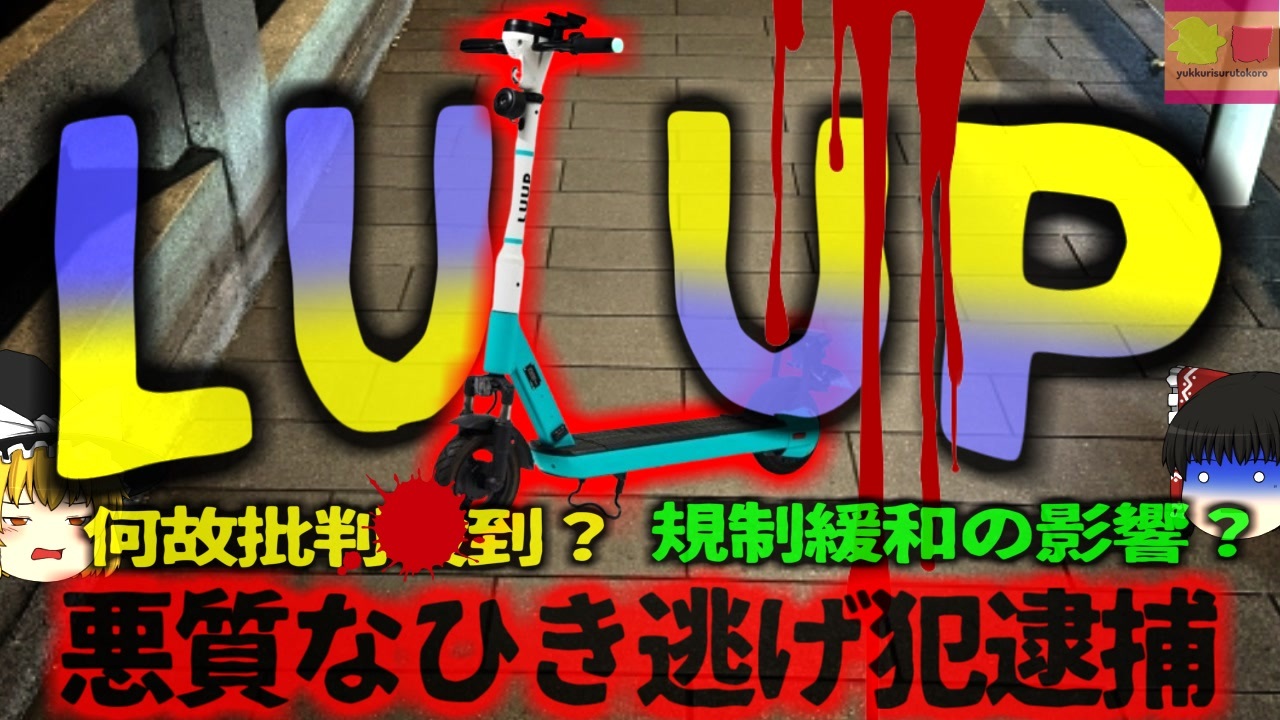 <a href="#" class="seekTime" data-seekTime="00:07" onclick="seekNicoPlayer('#00:07'); return false;">#00:07</a> 『LUUP』とは?<br><a href="#" class="seekTime" data-seekTime="1:52" onclick="seekNicoPlayer('#1:52'); return false;">#1:52</a> 何故爆発的に増えている?<br><a href="#" class="seekTime" data-seekTime="2:51" onclick="seekNicoPlayer('#2:51'); return false;">#2:51</a> 規制緩和<br><a href="#" class="seekTime" data-seekTime="4:02" onclick="seekNicoPlayer('#4:02'); return false;">#4:02</a> 便利になった反面・・・<br><a href="#" class="seekTime" data-seekTime="4:57" onclick="seekNicoPlayer('#4:57'); return false;">#4:57</a> 違反の数<br><a href="#" class="seekTime" data-seekTime="5:50" onclick="seekNicoPlayer('#5:50'); return false;">#5:50</a> 悪質な違反やひき逃げ事件も<br><a href="#" class="seekTime" data-seekTime="6:50" onclick="seekNicoPlayer('#6:50'); return false;">#6:50</a> 事故件数は徐々に減っているが<br><a href="#" class="seekTime" data-seekTime="7:59" onclick="seekNicoPlayer('#7:59'); return false;">#7:59</a> キックボードでもひき逃げは重罪<br><a href="#" class="seekTime" data-seekTime="10:09" onclick="seekNicoPlayer('#10:09'); return false;">#10:09</a> 環境とルールが追い付いていない?<br><a href="#" class="seekTime" data-seekTime="10:50" onclick="seekNicoPlayer('#10:50'); return false;">#10:50</a> 交通ルールを守り安全な利用を<br><br>引用・出展・参考文献(視聴者提供資料など<br>警視庁 都内の交通人身事故発生状況(令和6年)<br><a href="https://ishort.ink/LNnE" target="_blank" rel="noopener nofollow">https://ishort.ink/LNnE</a><br>ひき逃げの定義と罪状~ひき逃げ事件に対応するための基礎 ...<br>弁護士相談広場<br><a href="https://ishort.ink/r1d5" target="_blank" rel="noopener nofollow">https://ishort.ink/r1d5</a><br>LUUP<br><a href="https://ishort.ink/1GkQ" target="_blank" rel="noopener nofollow">https://ishort.ink/1GkQ</a><br>時事通信 電動ボード、検挙高止まり Luup社長「一部利用者が何度も」―悪質違反には厳罰化の意向<br><a href="https://ishort.ink/QQoY" target="_blank" rel="noopener nofollow">https://ishort.ink/QQoY</a><br><br><br><br><br />※この動画は過去の事件を知り、現在でも同じことが発生する危険性を再認識、関与しないように促すための動画であり、視聴者を扇動、動揺を誘うためのコンテンツではありません。<br><br>ご要望にお応えして、メンバーシップの開設を行いました。<br>下記URLからも登録可能ですので、ご興味がある方は是非ご参加ください。<br><a href="https://www.youtube.com/channel/UCcT5a1J7XJW7CLYI2RKl4pw/join" target="_blank" rel="noopener nofollow">https://www.youtube.com/channel/UCcT5a1J7XJW7CLYI2RKl4pw/join</a><br><br><br>Twitter<br>→<a href="https://twitter.com/yukkurisurutoko" target="_blank" rel="noopener nofollow">https://twitter.com/yukkurisurutoko</a><br><br>取り急ぎ、簡易的にですがマイリストを作りました。<br>【ゆっくり解説】事故・事件関係紹介リスト <br><a href="https://www.nicovideo.jp/mylist/71034319" target="_blank" rel="noopener nofollow">https://www.nicovideo.jp/mylist/71034319</a><br>【ゆっくり解説】放射線系事故<br><a href="https://www.nicovideo.jp/mylist/71034368" target="_blank" rel="noopener nofollow">https://www.nicovideo.jp/mylist/71034368</a><br>【ゆっくり解説】鉄道系事故・事件関連<br><a href="https://www.nicovideo.jp/mylist/71034379" target="_blank" rel="noopener nofollow">https://www.nicovideo.jp/mylist/71034379</a>