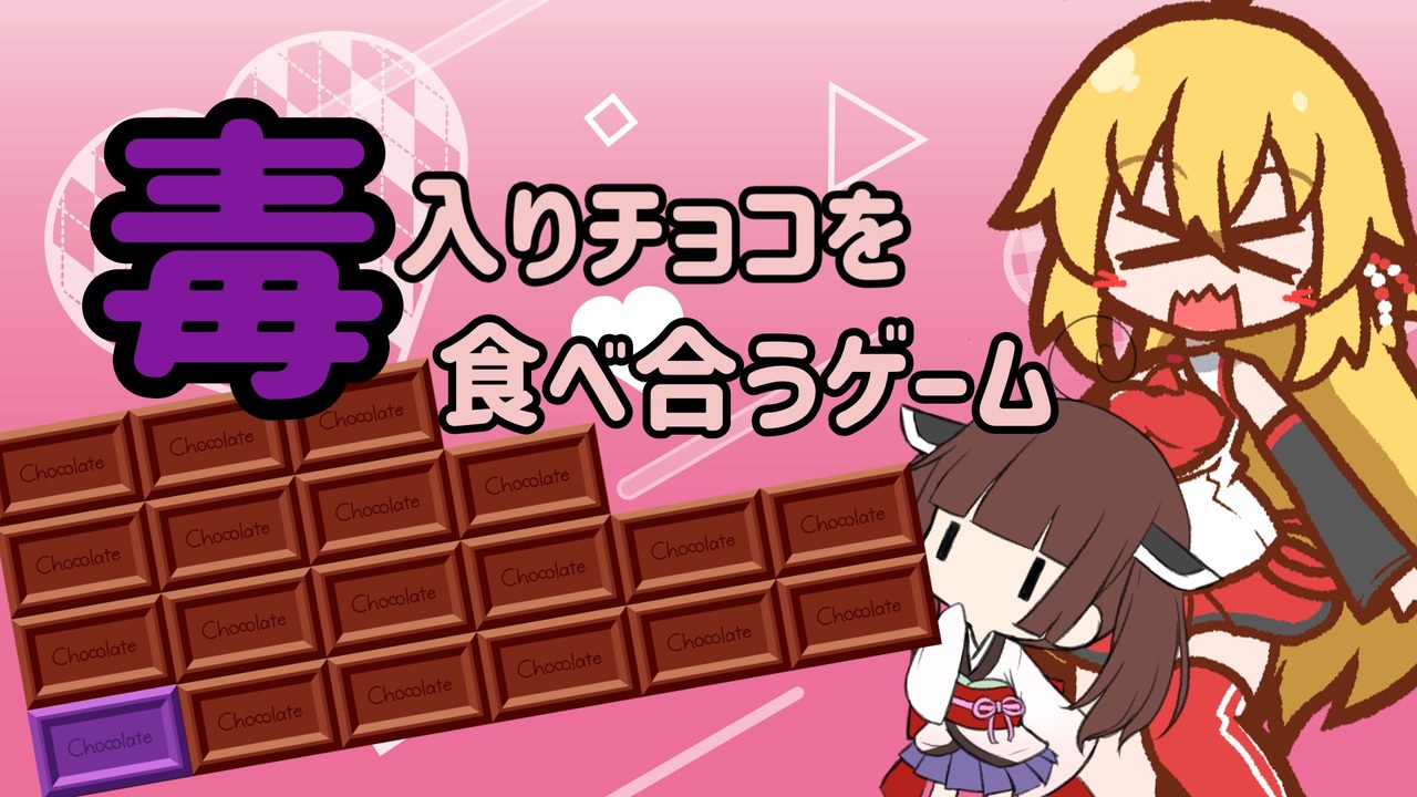 <span style="font-size: 24px;">今日はバレンタイン!!(1週間遅刻)</span><br><br>毒入りチョコを食べ合うマキさんときりたんの動画です。百合動画でもダークサイドでもありません。<br>最近調べた毒チョコゲーム(CHOMP)と、ついでにゲームの解決(超弱解決、弱解決、強解決)について解説します。あと3列CHOMPについても少し。<br><br>解説内容被っちゃいました。こっちも面白いので見よう。<br><a href="https://www.nicovideo.jp/watch/sm44671972" class="watch">sm44671972</a><br><br><br>参考文献<br><br>The game of Chomp - Eindhoven University of Technology<br><a href="https://aeb.win.tue.nl/games/chomp.html" target="_blank" rel="noopener nofollow">https://aeb.win.tue.nl/games/chomp.html</a><br><br>2行+αチョンプに関する考察<br><a href="https://slidesplayer.net/slide/11198852/" target="_blank" rel="noopener nofollow">https://slidesplayer.net/slide/11198852/</a><br><br>毒チョコゲーム(CHOMP)の無限版<br><a href="https://youtu.be/3LamTa_G-ZY?feature=shared" target="_blank" rel="noopener nofollow">https://youtu.be/3LamTa_G-ZY?feature=shared</a><br><br>