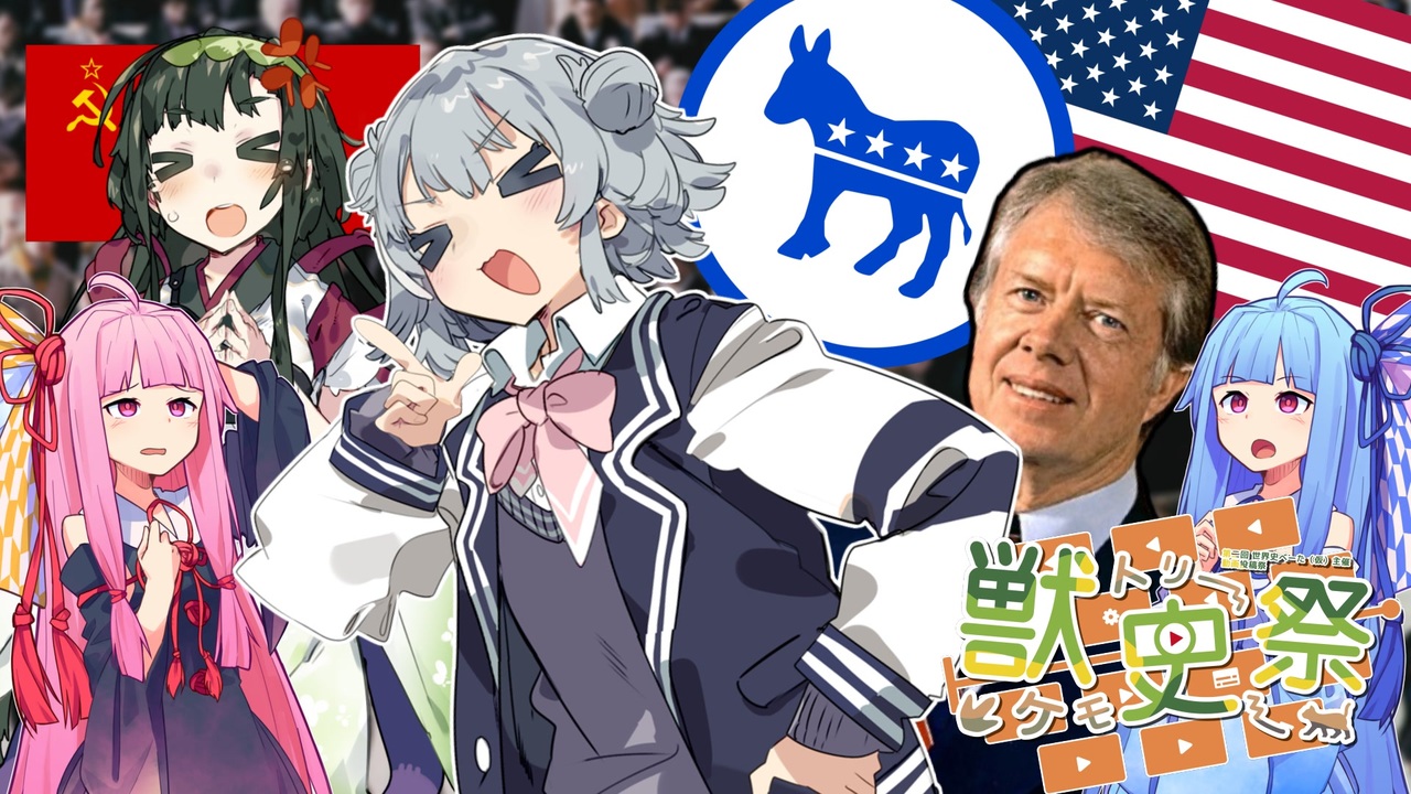 世界史ベータ様主催の「獣史祭」<s>遅刻</s>参加動画となります。本当にごめんなさい。<br>本来なら期限内に出せたのですが、USAIDから供出されていた動画制作予算が打ち切られ、DOGEによりソフトウェアトーク達が解雇されたことで投稿が遅れました。<br>...という冗談はさておき、今回題材にした動物は、アメリカ民主党の象徴である「ロバ」です。<br>アメリカには共和党・民主党共に多くの個性豊かな大統領がいますが、昨年12月にカーター元大統領の訃報を聞き、冷戦期のアメリカで大きな役割を果たしたカーターの功罪を今こそ知ってもらおうと思い制作しました。<br>あとおまけとして、民主党のシンボルである「ロバ」の解説もあります。是非そちらもご覧ください。<br><br><strong>※この動画内の「冷戦リベラル」「反共リベラル」は、表記揺れとして反共タカ派(この動画で言うつむぎちゃん)と同じものと考えてください。</strong><br><br>【主要参考文献】<br>持田直武 [ほか]訳. カーター回顧録 上下, 日本放送出版協会, 1982.12. <br>島中誠 著. カーター政権 : 政策の実際とその権力構造, 教育社, 1978.11, (入門新書. 時事問題解説 ; no.128), <br>砂田一郎 著. 現代アメリカのリベラリズム : ADAとその政策的立場の変容, 有斐閣, 2006.10. 4-641-17321-<br>佐々木卓也 編. 戦後アメリカ外交史. 第3版, 有斐閣, 2017.3, (有斐閣アルマ. Specialized). <br>久保文明 著. アメリカ政治史, 有斐閣, 2018.3. <br>岡山裕, 前嶋和弘 著. アメリカ政治, 有斐閣, 2023.4, (有斐閣ストゥディア). 978-4-641-15105-5. <br>中野耕太郎 著. 20世紀アメリカの夢 : 世紀転換期から1970年代, 岩波書店, 2019.10, (岩波新書 新赤版 ; 1772. シリーズアメリカ合衆国史 ; 3). <br>古矢旬 著. グローバル時代のアメリカ : 冷戦時代から21世紀, 岩波書店, 2020.8, (岩波新書 新赤版 ; 1773. シリーズアメリカ合衆国史 ; 4). <br>文字数制限の為、そのほかの文献はYoutube版、動画末尾に記載しています。<br><br>【お借りした素材】<br>・紡乃世詞音立ち絵<br>(C)KADOKAWA CORPORATION 2022 イラスト/かれい<br>他お借りした素材はYoutube版、もしくは親作品に登録しています。<br><br><br><a target="_blank" href="https://qa.nicovideo.jp/faq/show/19424?site_domain=default" style="font-size: 13px;color: #657586; text-decoration: underline; line-height: 1.4">この動画は投稿者によって修正されました</a>