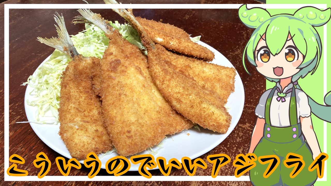 自炊ならアジフライが好きなだけ食える、しあわせ<br><br>前回→<a href="https://www.nicovideo.jp/watch/sm44657866" class="watch">sm44657866</a> 次回→<a href="https://www.nicovideo.jp/watch/sm44716784" class="watch">sm44716784</a><br><br>【材料】<br>・アジ<br>・キャベツ(今高いけどマストやっぱこれがないと…)<br>・ソース(個人的には中濃がおいしい)<br>・タルタル(レモン汁とピクルス多めが合う)<br>【衣】<br>・卵<br>・小麦粉<br>・パン粉(細かいやつ)<br /><br>レシピとか質問とか雑多に募集中<br><a href="https://marshmallow-qa.com/pwilzcacj1j87mz?t=6PAejL&utm_medium=url_text&utm_source=promotion" target="_blank" rel="noopener nofollow">https://marshmallow-qa.com/pwilzcacj1j87mz?t=6PAejL&utm_medium=url_text&utm_source=promotion</a><br><br>限界マイリスト<br><a href="https://www.nicovideo.jp/series/379506" target="_blank" rel="noopener nofollow">https://www.nicovideo.jp/series/379506</a><br><br>利用させてもらったもの<br>・ VOICEVOX:ずんだもん<br>立ち絵<br>・坂本アヒル氏<br><a href="https://seiga.nicovideo.jp/seiga/im10788496" target="_blank" rel="noopener nofollow">https://seiga.nicovideo.jp/seiga/im10788496</a><br>BGM<br>・ニコニコモンズ<br><a href="https://commons.nicovideo.jp/material/nc97718" target="_blank" rel="noopener nofollow">https://commons.nicovideo.jp/material/nc97718</a><br>各ずんだもん素材<br>・ずんだおばけ氏<br><a href="https://www.nicovideo.jp/user/124111720?rf=nvpc&rp=watch&ra=video_information" target="_blank" rel="noopener nofollow">https://www.nicovideo.jp/user/124111720?rf=nvpc&rp=watch&ra=video_information</a> <a href="https://www.youtube.com/@ZundaGhost" target="_blank" rel="noopener nofollow">https://www.youtube.com/@ZundaGhost</a><br>SE<br>・効果音ラボ<br><br>見てくれて感謝!<br>いいね・コメント・フォロー。マイリストも下さった方<br>ありがとうございます<br>・救援物資欲しいモノリスト<br><a href="https://www.amazon.co.jp/hz/wishlist/ls/2Q8W3EKKLTRVS?ref_=wl_fv_le" target="_blank" rel="noopener nofollow">https://www.amazon.co.jp/hz/wishlist/ls/2Q8W3EKKLTRVS?ref_=wl_fv_le</a><br>・お手紙とか干し芋から送れないものはこちら<br><a href="https://ouen55.com/sentwin5496/" target="_blank" rel="noopener nofollow">https://ouen55.com/sentwin5496/</a><br>