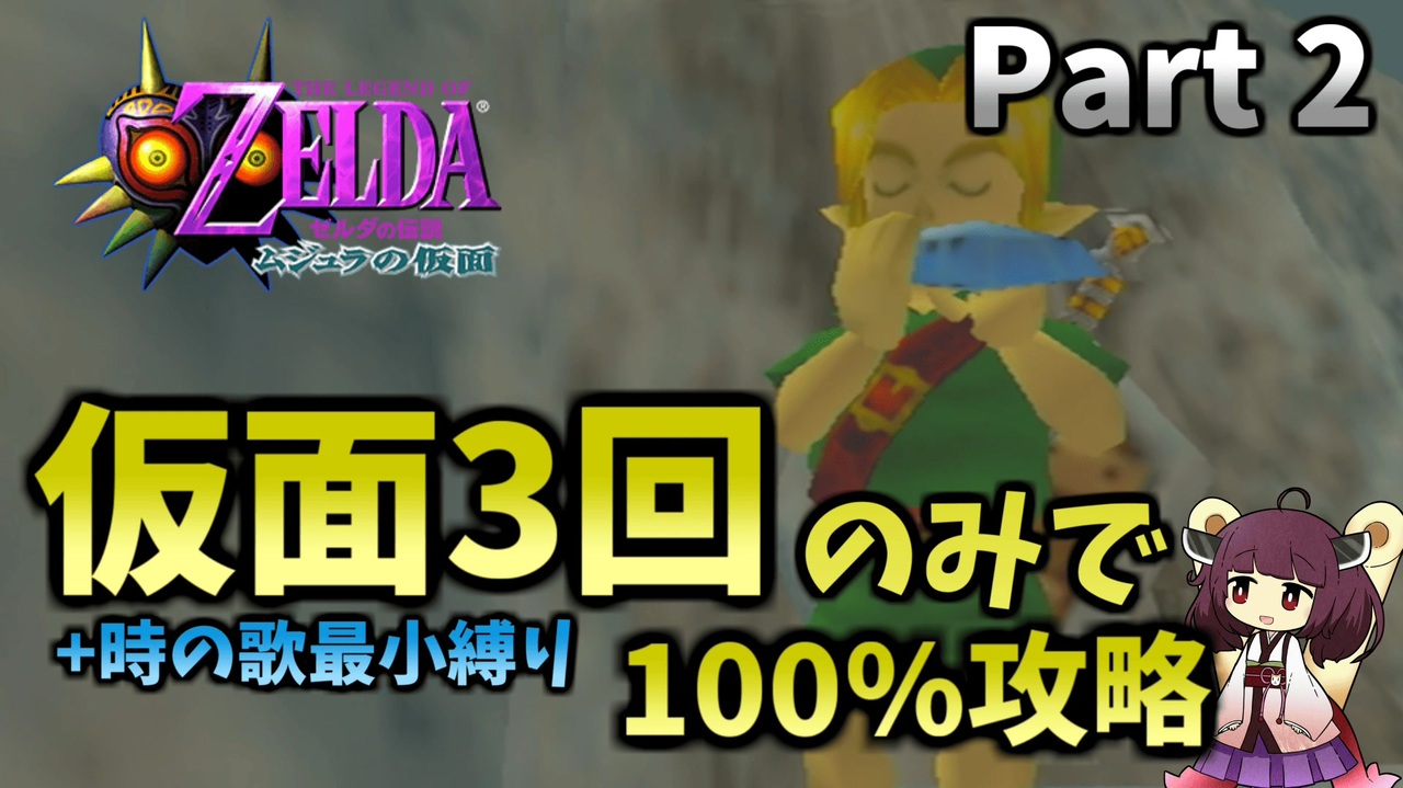 今回はダンジョン攻略メイン<br>間を空けずに投稿したいのちょっと短めです。<br><br>冒頭のデクナッツ強制変身を除く、仮面を使った変身3回のみで100%クリアを目指します!<br>時の歌の最小の3回縛りです!<br><br>バグプレイの完成系と言えるような動画をどうぞお楽しみください! <br><br>RTA走者ならではの技術・知識を生かした「チャレンジプレイ」をコンセプトに、不定期に投稿していきます。 <br><br>縛りシリーズマイリスト→<a href="https://www.nicovideo.jp/mylist/77920836" target="_blank" rel="noopener">mylist/77920836</a><br />◆ ◆ ◆ ◆ ◆ ◆ ◆ ◆ ◆ <br>X(Twitter)→<a href="https://twitter.com/iwabi74" target="_blank" rel="noopener nofollow">https://twitter.com/iwabi74</a>