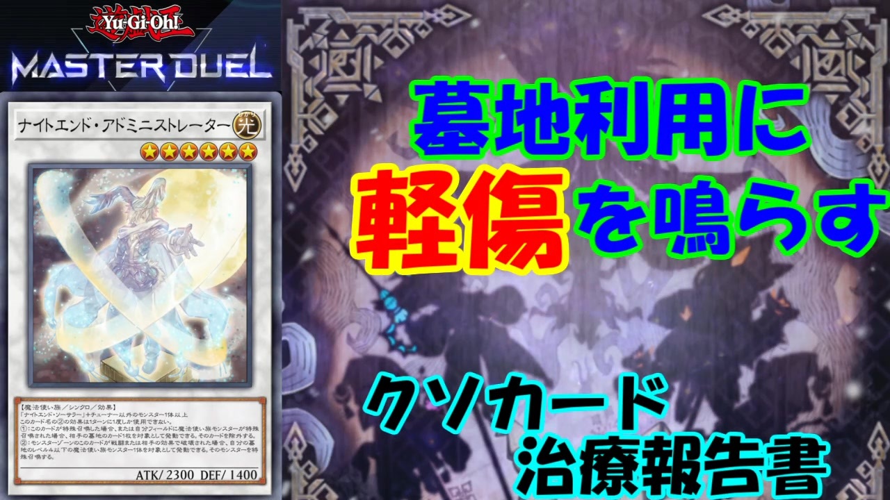 クソカード医学会報告書、第12弾です。<br>効果自体は良いものの、召喚条件の割に盤面を触れず、実際に使われているところを見たことがないことから、本動画では軽症として扱わせていただきます。<br><br><span style="color: #ff0000;"><strong>3/6 追記 広告感謝!<br>らうすけさん、えにしさん、アポピスの化身さん、KAZOONさん、蓮湖星読みセダムさん、アキアカネさん、ketudaiさん、Precisさん、Grassさん、あねはすさん、ペツォッタイトさん、F_tyuniさん</strong></span><br><br>今回遊んだゲーム:<br> 遊戯王マスターデュエル <a href="https://www.konami.com/yugioh/masterduel/jp/ja/" target="_blank" rel="noopener nofollow">https://www.konami.com/yugioh/masterduel/jp/ja/</a><br><br>リスペクト先:<br>・あまくだり 様 <a href="https://www.nicovideo.jp/user/82678858" target="_blank" rel="noopener nofollow">https://www.nicovideo.jp/user/82678858</a><br><br>Special Thanks:<br>有城 様 <a href="https://www.nicovideo.jp/user/48913193?rf=nvpc&rp=watch&ra=video_information" target="_blank" rel="noopener nofollow">https://www.nicovideo.jp/user/48913193?rf=nvpc&rp=watch&ra=video_information</a><br>デッキ相談、対戦にご協力いただいた非公式医学会サーバーのみなさま<br><br>非公式クソカード医学会サーバー:<a href="https://discord.gg/pejHy5mQFT" target="_blank" rel="noopener nofollow">https://discord.gg/pejHy5mQFT</a><br><br>前回 <a href="https://www.nicovideo.jp/watch/sm44491007" class="watch">sm44491007</a> / 次回 <a href="https://www.nicovideo.jp/watch/sm44792854" class="watch">sm44792854</a><br><br>作った動画 <a href="https://www.nicovideo.jp/mylist/72794101" target="_blank" rel="noopener">mylist/72794101</a>