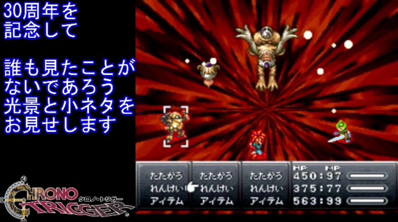 祝! クロノ・トリガー30周年!<br><br>30年も前のゲームということに驚きですが、まだまだ謎が沢山あるので動画化してみました。<br>検証するきっかけをくれたmayさんに感謝。<br><br>現在投稿中のドラクエの縛りプレイ→<a href="https://www.nicovideo.jp/watch/sm43708158" class="watch">sm43708158</a><br>現在投稿中のクロノ・トリガーの縛りプレイ→<a href="https://www.nicovideo.jp/watch/sm43752866" class="watch">sm43752866</a><br><br>※ネタバレ注意です<br><br>このページ、動画で利用している弊社または弊社のライセンサーが権利を有する著作物の転載・配布は禁止いたします。© 1995, 2018 SQUARE ENIXIllustration: © 1995 BIRD STUDIO / SHUEISHAStory and Screenplay: © 1995, 2008 ARMOR PROJECT / SQUARE ENIX<br><br>AquesTalk2ライセンスID:AQTK2WINUSR23122185<br /><br><br>❤いいねを押していただけるとモチベーションと投稿速度が上がるので宜しくお願い致します!<br><br>作者ツイッター→ <a href="https://twitter.com/nig0117" target="_blank" rel="noopener nofollow">https://twitter.com/nig0117</a><br>PIXIV FANBOX→ <a href="https://sutanokeiji.fanbox.cc/" target="_blank" rel="noopener nofollow">https://sutanokeiji.fanbox.cc/</a><br><br>( 以前はWEB小説書いてました→ <a href="https://kakuyomu.jp/works/1177354054884910267" target="_blank" rel="noopener nofollow">https://kakuyomu.jp/works/1177354054884910267</a> )