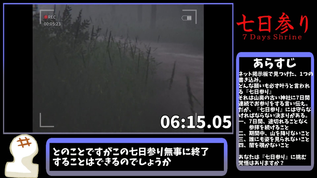 <span style="color: #ff0000;"><strong>※すいませんタイム間違ってました<br>07:34です</strong></span><br><br>今回は七日参りを遊びました<br>雰囲気いい<br><br>ゲームDLサイト→<a href="https://store.steampowered.com/app/3408470/__7_Days_Shrine/" target="_blank" rel="noopener nofollow">https://store.steampowered.com/app/3408470/__7_Days_Shrine/</a><br><br><span style="color: #000000; font-size: 14px;">単発RTA→</span><span style="color: #006699; font-size: 14px;"><a href="https://www.nicovideo.jp/mylist/66917940" target="_blank" rel="noopener">mylist/66917940</a></span><br><br>生放送コミュ→co4338697<br><br><span style="color: #000000; font-size: 14px;">ΔYoutube→</span><span style="color: #006699; font-size: 14px;"><a href="https://www.youtube.com/channel/UC4jVPBw6dP3mXCGJvRi3Xbw?view_as=subscriber" target="_blank" rel="noopener nofollow">https://www.youtube.com/channel/UC4jVPBw6dP3mXCGJvRi3Xbw?view_as=subscriber</a></span>