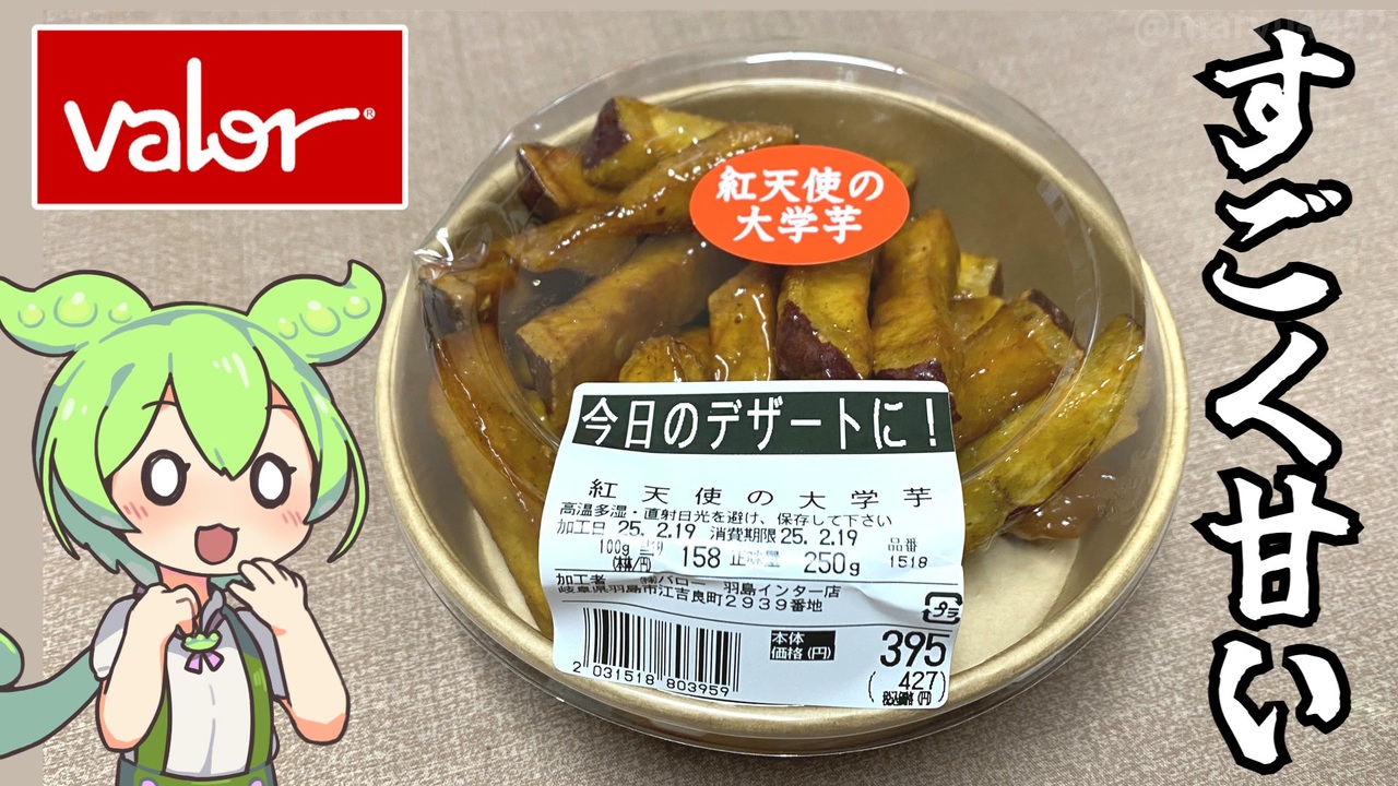 バローの野菜コーナーにあった大学芋です。 <br>お惣菜コーナーにありそうなのに何で野菜売り場に? <br>ちょっと高いですが気になったので買ってみました。 <br><br><br>【参考】 <br>スーパーマーケット バロー <br><a href="https://valor.jp/" target="_blank" rel="noopener nofollow">https://valor.jp/</a> <br>カルビーかいつかスイートポテト株式会社<br> <a href="https://www.calbee-ksp.co.jp/company/" target="_blank" rel="noopener nofollow">https://www.calbee-ksp.co.jp/company/</a> <br>蔵出し焼き芋かいつか通信販売 <br><a href="https://www.kuradashi-yakiimo.com/shop/default.aspx" target="_blank" rel="noopener nofollow">https://www.kuradashi-yakiimo.com/shop/default.aspx</a> <br>蔵出し焼き芋かいつか "No.1"ブランド紅天使<br> <a href="https://www.kuradashi-yakiimo.com/shop/c/c10/" target="_blank" rel="noopener nofollow">https://www.kuradashi-yakiimo.com/shop/c/c10/</a> <br>【激甘!】紅天使とは?八百屋が特徴や選び方を紹介しま す(やさいのトリセツ) <br><a href="https://tetsublog.work/benitensi/" target="_blank" rel="noopener nofollow">https://tetsublog.work/benitensi/</a><br><br>【使用した素材】(※敬称略) <br>(合成音声)VOICEVOX/ずんだもん/四国めたん <br><a href="https://voicevox.hiroshiba.jp/" target="_blank" rel="noopener nofollow">https://voicevox.hiroshiba.jp/</a> <br>(立ち絵)坂本アヒル <br><a href="https://seiga.nicovideo.jp/seiga/im10788496?track" target="_blank" rel="noopener nofollow">https://seiga.nicovideo.jp/seiga/im10788496?track</a> <br>(楽曲)甘茶の音楽工房/「楽しい麦畑」「お城の舞踏会」<br> <a href="https://amachamusic.chagasi.co" target="_blank" rel="noopener nofollow">https://amachamusic.chagasi.co</a>