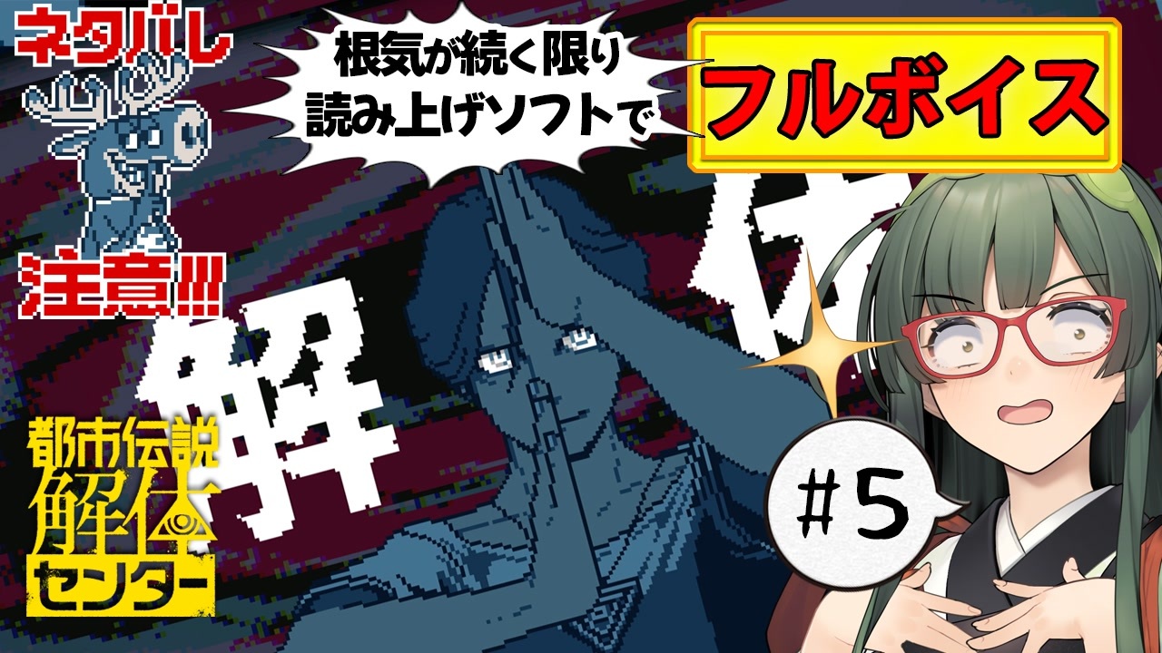 サムネにいもいらっしゃるネタバレ注意喚起のマスコットは<br>トナカイならぬトシカイくんというのですが、Part5にしてようやくまともな引用ができた気がします。<br><br>◆ 次回 <a href="https://www.nicovideo.jp/watch/sm44742587" class="watch">sm44742587</a><br>◇ 前回 <a href="https://www.nicovideo.jp/watch/sm44708751" class="watch">sm44708751</a><br>◆ シリーズ <a href="https://www.nicovideo.jp/series/506451" target="_blank" rel="noopener">series/506451</a><br><br>◇ 台詞の読み上げ<br>あざみー:VOICEPEAK 女性1<br>センター長:VOICEPEAK 男性3<br>ジャスミン:VOICEPEAK 女性3<br>美桜:VOICEPEAK 女性2<br>栄子:VOICEPEAK 女性2<br>男:VOICEPEAK 男性2<br><br>◇ YouTube <a href="https://www.youtube.com/c/zomcho" target="_blank" rel="noopener nofollow">https://www.youtube.com/c/zomcho</a><br>◆ X(Twitter) <a href="https://twitter.com/zomcho" target="_blank" rel="noopener nofollow">https://twitter.com/zomcho</a><br><br>◇ 今までの実況はこちら<br>◆ 生声 <a href="https://www.nicovideo.jp/mylist/20494065" target="_blank" rel="noopener">mylist/20494065</a><br>◇ VOICEPEAK <a href="https://www.nicovideo.jp/mylist/75663677" target="_blank" rel="noopener">mylist/75663677</a><br><br>◆ 実況以外の動画はこちら <a href="https://www.nicovideo.jp/mylist/26439430" target="_blank" rel="noopener">mylist/26439430</a><br><br>◇ 使用BGM<br>・効果音ラボ 様<br>・DOVA-SYNDROME 様<br><br>タイトル:都市伝説解体センター<br>公式サイト:<a href="https://umdc.shueisha-games.com/" target="_blank" rel="noopener nofollow">https://umdc.shueisha-games.com/</a><br>開発:墓場文庫 販売:集英社ゲームズ<br>©Hakababunko / SHUEISHA, SHUEISHA GAMES<br><br>この動画は『都市伝説解体センター』配信ガイドラインに則り、権利者が許諾した部分のみ録画、編集しております。