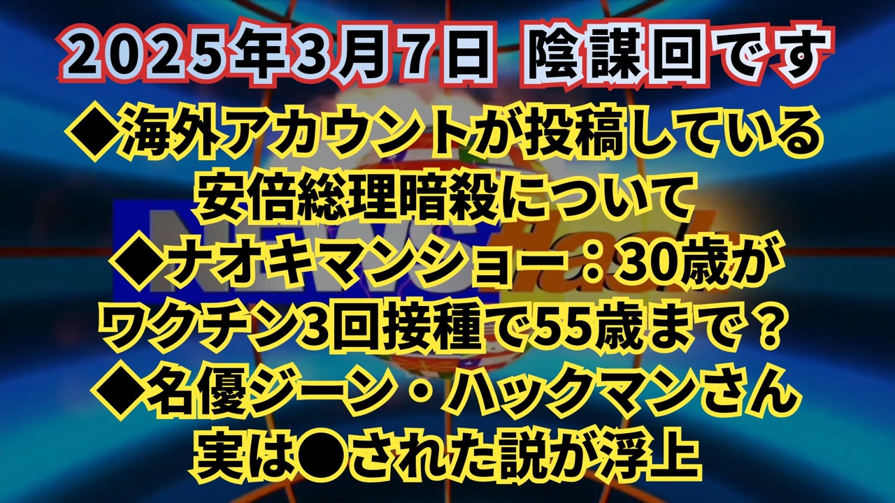 ◆ 安倍元首相はワクチン政策で暗殺されたのか?パテル氏の主張 <a href="https://x.com/KashPatel_News/status/1894471143630700802?t=bt6G9Agw8Eo8w7-4wI9TYg&s=19" target="_blank" rel="noopener nofollow">https://x.com/KashPatel_News/status/1894471143630700802?t=bt6G9Agw8Eo8w7-4wI9TYg&s=19</a><br><br><br>◆ 安倍元首相の計画と暗殺の謎…イベルメクチンを推進していた? <a href="https://x.com/himuro398/status/1798738861956506090?t=rb93M_pbzLp6ip3M2hYrTQ&s=19" target="_blank" rel="noopener nofollow">https://x.com/himuro398/status/1798738861956506090?t=rb93M_pbzLp6ip3M2hYrTQ&s=19</a><br><br><br>◆ 安倍総理の真意とは?イベルメクチンとワクチンを巡る証言<br>①<br><a href="https://x.com/kohyu1952/status/1811057269020426430?t=zcL19GwKgyGD-ErUrrwurg&s=19" target="_blank" rel="noopener nofollow">https://x.com/kohyu1952/status/1811057269020426430?t=zcL19GwKgyGD-ErUrrwurg&s=19</a><br>②<br>rumble.com/v4zj7wr-bombsh<br><br><br>◆ ナオキマンショー:30歳がワクチン3回接種で55歳まで?衝撃のデータ<br><a href="https://x.com/nekoko89314s/status/1889507830216237276?t=3K-3AfeT8FePvoG6VKm2vQ&s=19" target="_blank" rel="noopener nofollow">https://x.com/nekoko89314s/status/1889507830216237276?t=3K-3AfeT8FePvoG6VKm2vQ&s=19</a><br><br><br>◆ 元WHO職員の暴露:ワクチン接種は人口削減計画なのか?<br><a href="https://x.com/retopsnart/status/1897614638516477975?t=tdoSv0Mm5EWaC48SUWztRQ&s=19" target="_blank" rel="noopener nofollow">https://x.com/retopsnart/status/1897614638516477975?t=tdoSv0Mm5EWaC48SUWztRQ&s=19</a><br><br><br>◆ナオキマンショーさんのYouTube動画 149万回再生(凄)<br>29分頃かららしいです(暇があったら見ます)<br><a href="https://x.gd/yFhrx" target="_blank" rel="noopener nofollow">https://x.gd/yFhrx</a><br><br><br>◆ ジーン・ハックマンの死とエプスタイン顧客リストの闇 <a href="https://x.com/tpvsean/status/1895949269447950514?t=VRDZsDn9k07bC_0ppq_X9A&s=19" target="_blank" rel="noopener nofollow">https://x.com/tpvsean/status/1895949269447950514?t=VRDZsDn9k07bC_0ppq_X9A&s=19</a><br><br><br>◆今回の台本<br><a href="https://keiichiro8140.hatenablog.com/entry/2025/03/07/105800?_gl=1*o1i1sm*_gcl_au*NDQ1MDIzNjI1LjE3MzQzMjI4MDY." target="_blank" rel="noopener nofollow">https://keiichiro8140.hatenablog.com/entry/2025/03/07/105800?_gl=1*o1i1sm*_gcl_au*NDQ1MDIzNjI1LjE3MzQzMjI4MDY.</a><br><br><br>安倍晋三<br>暗殺<br>FBI長官<br>カッシュ・パテル<br>世界経済フォーラム<br>WHO<br>コロナワクチン<br>イベルメクチン<br>ジーン・ハックマン<br>ジェフリー・エプスタイン<br>ナオキマンショー<br><br><br />著作権、肖像権に配慮して作成しております。<br><br>◆気になったニュースの台本!?<br>メモ代わりに作った台本をそのままあげてます<br><a href="https://keiichiro8140.hatenablog.com/." target="_blank" rel="noopener nofollow">https://keiichiro8140.hatenablog.com/.</a><br><br><br>ここからはシリーズ紹介<br><br><br>◆ ワクチン解毒・デトックス<br><a href="https://x.gd/fZweg" target="_blank" rel="noopener nofollow">https://x.gd/fZweg</a><br><br>◆ウイリアム・マキス博士のがん治療(イベルメクチン・フェンベンダゾール等)<br><a href="https://x.gd/AtFYS" target="_blank" rel="noopener nofollow">https://x.gd/AtFYS</a><br><br>◆予防接種健康被害救済制度<br><a href="https://x.gd/0xK9x" target="_blank" rel="noopener nofollow">https://x.gd/0xK9x</a><br><br>◆気になったニュース #1501~<br><br>◆ 【ショートver】気になったニュース<br><a href="https://x.gd/7MxXC" target="_blank" rel="noopener nofollow">https://x.gd/7MxXC</a><br><br>◆ 気になったニュース #1001~<br><a href="https://x.gd/Lp8gv" target="_blank" rel="noopener nofollow">https://x.gd/Lp8gv</a><br><br>◆ 気になったニュース #501~<br><a href="https://x.gd/EmbS4" target="_blank" rel="noopener nofollow">https://x.gd/EmbS4</a><br><br>◆ 気になったニュース #1~#500<br><a href="https://x.gd/uPhNb" target="_blank" rel="noopener nofollow">https://x.gd/uPhNb</a><br><br>◆ X(旧Twitter)・テレグラムで気になった情報<br><a href="https://x.gd/YG6FT" target="_blank" rel="noopener nofollow">https://x.gd/YG6FT</a><br><br>◆ 日比谷5万人パレードデ⚪生放送アーカイブ動画<br><a href="https://x.gd/3CHJv" target="_blank" rel="noopener nofollow">https://x.gd/3CHJv</a><br><br>◆日比谷5万人パレード⚪モのマイリスト作ってみました<br><a href="https://nico.ms/mylist/76828848?ref=sp_other" target="_blank" rel="noopener nofollow">https://nico.ms/mylist/76828848?ref=sp_other</a><br><br>◆3.30 令和の百姓⚪⚪<br><a href="https://www.nicovideo.jp/series/511791?ref=garage_share_other" target="_blank" rel="noopener nofollow">https://www.nicovideo.jp/series/511791?ref=garage_share_other</a><br><br>◆ 及川幸久さんの【XNEWS】シリーズ<br><a href="https://x.gd/3k78K" target="_blank" rel="noopener nofollow">https://x.gd/3k78K</a><br><br>◆これまでの動画<a href="https://x.gd/sPXoJ" target="_blank" rel="noopener nofollow">https://x.gd/sPXoJ</a><br><br>◆もしも(BAN)の時のためのマイリンク集<a href="https://lit.link/K-16_News44" target="_blank" rel="noopener nofollow">https://lit.link/K-16_News44</a><br><br>